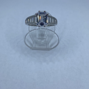 Téglalap alakú fehér kövekkel kirakott,exkluzív megjelenésű eljegyzési gyűrű rhódiumozott felülettel. Legszélesebb mérete:9,5 mm Mérete:52 Súlya:3,2 gramm