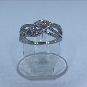 Fehér kövekkel kirakott,összefonódott szálakból álló modern mintás ezüst gyűrű,rhódiumozott felülettel. Szélessége:12,5 mm Mérete:58 Súlya:4,4 gramm