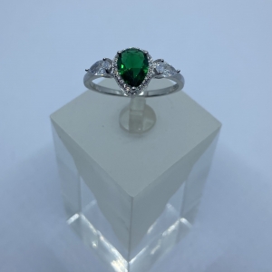 Ezüst gyűrű, egy nagyobb középső smaragdzöld,és két oldalán két kisebb fehér csepp alakú kővel,valamint a középső követ körbe vevő apró fehér kövekkel,rhódiumozott felülettel. A gyűrű legnagyobb szélessége: 10 mm Mérete: 60 Súlya:2,0 gramm