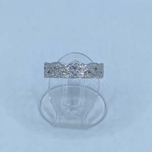 Ezüst gyűrű összefonódott mintával,fehér kövekkel kirakva. Szélessége:13,2 mm Mérete:56 Súlya:4,7 gramm (AGGY4B11G)