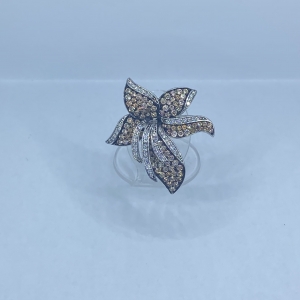 Extra formájú,virágos ezüst gyűrű aranybarna ,és fehér színű kövekkel fekete és fényes rhódiumozással. A virág mérete:28*30 mm Mérete.:52 Súlya:5,26 gramm