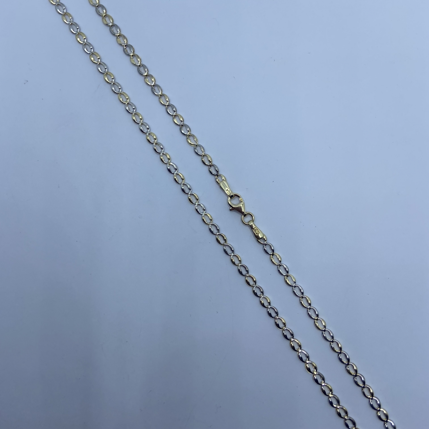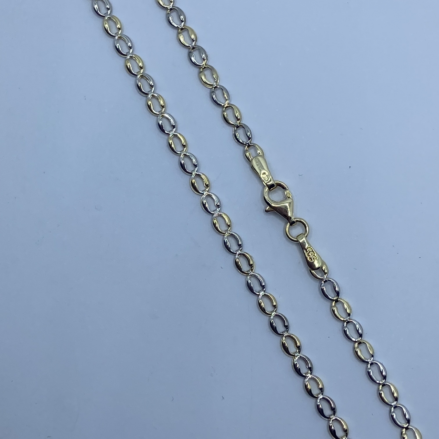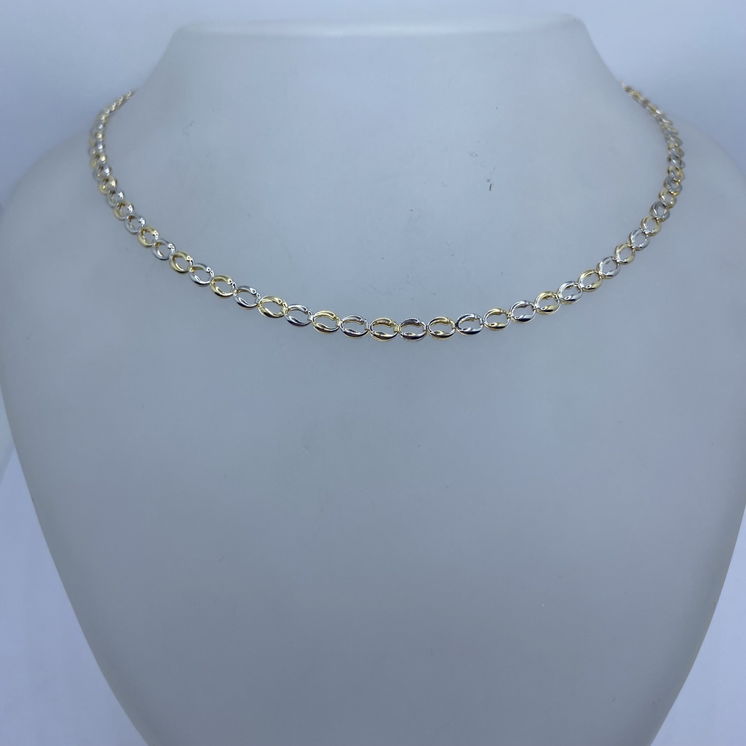 Ovális szemekből álló,fehér-sárga arany nyaklánc,fűzőtt szemekből.Szélessége:3 mm,hossza:50 cm.
