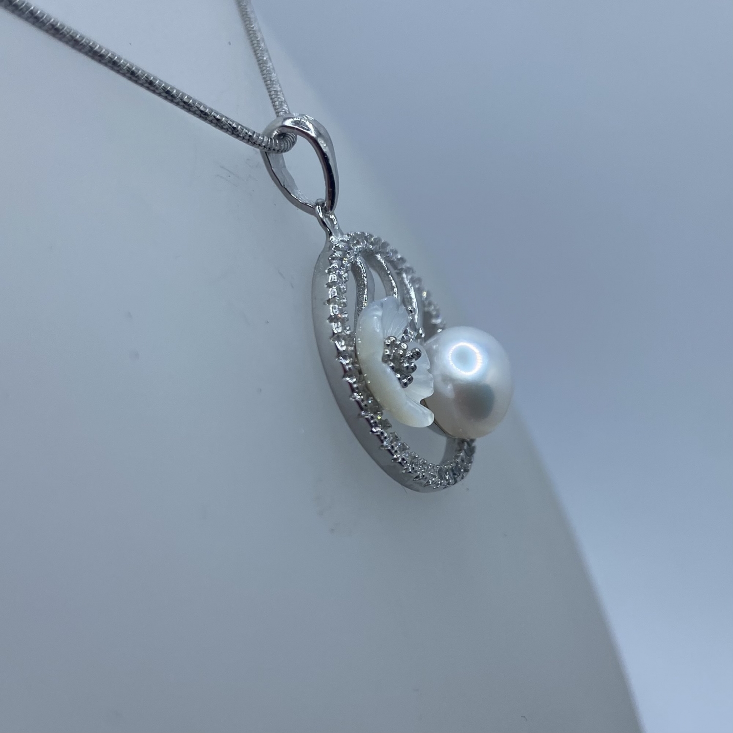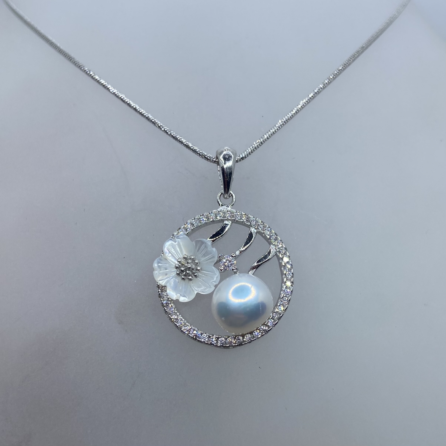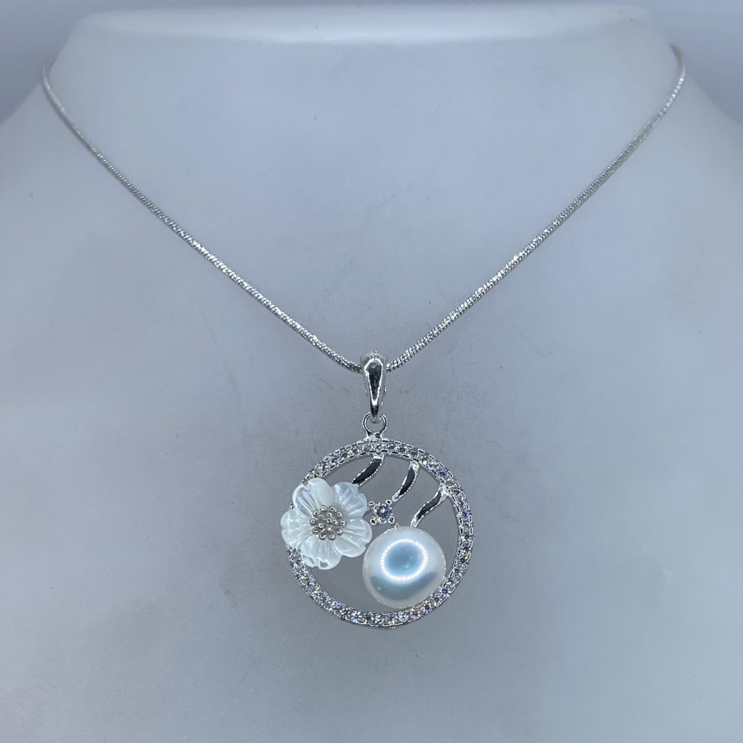 Kör alakú ezüst medál egy darab,tenyésztett édesvízi fehér színű gyönggyel,gyöngyházból faragott virággal,fehér kövekkel,rhódiumozott felülettel.