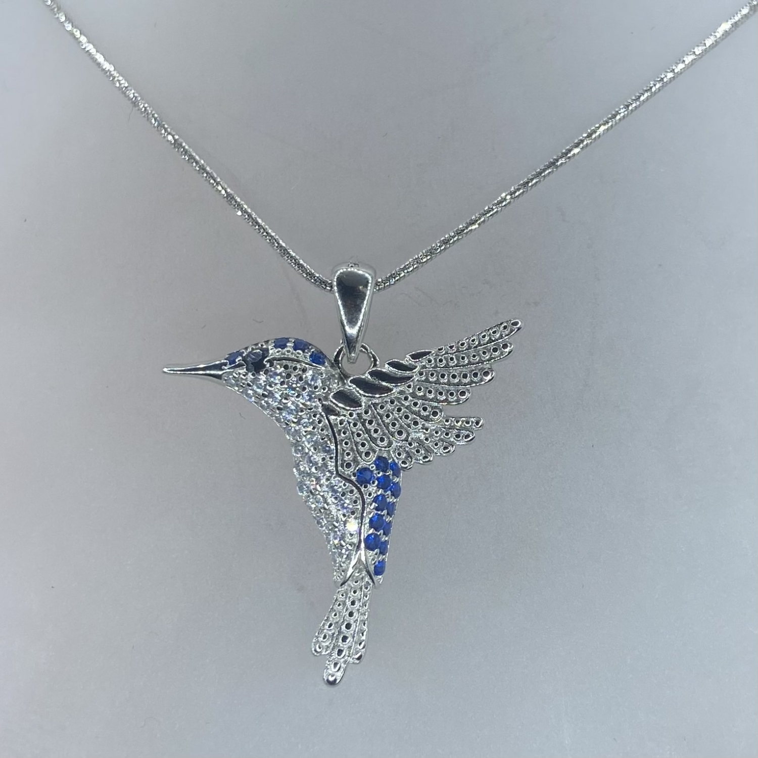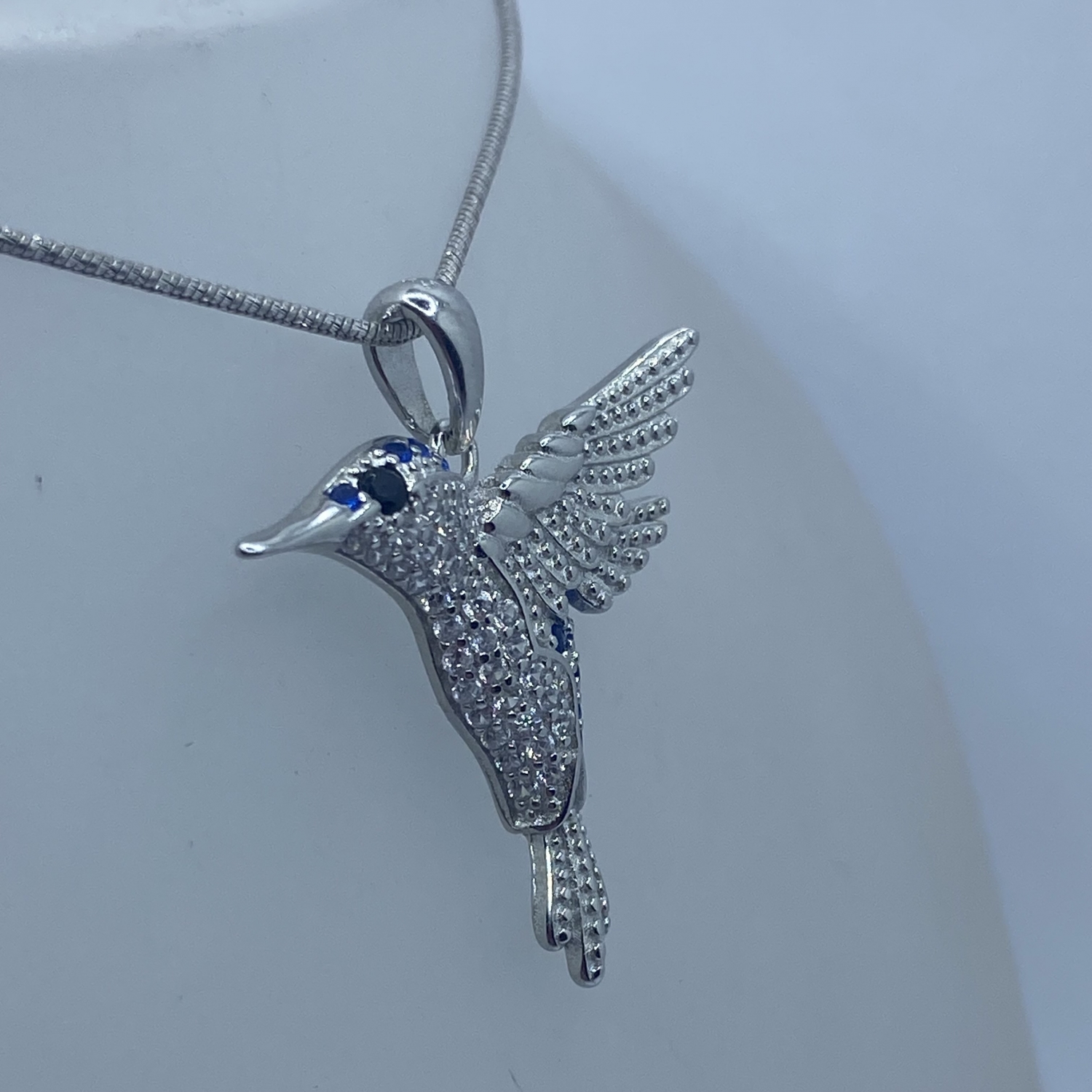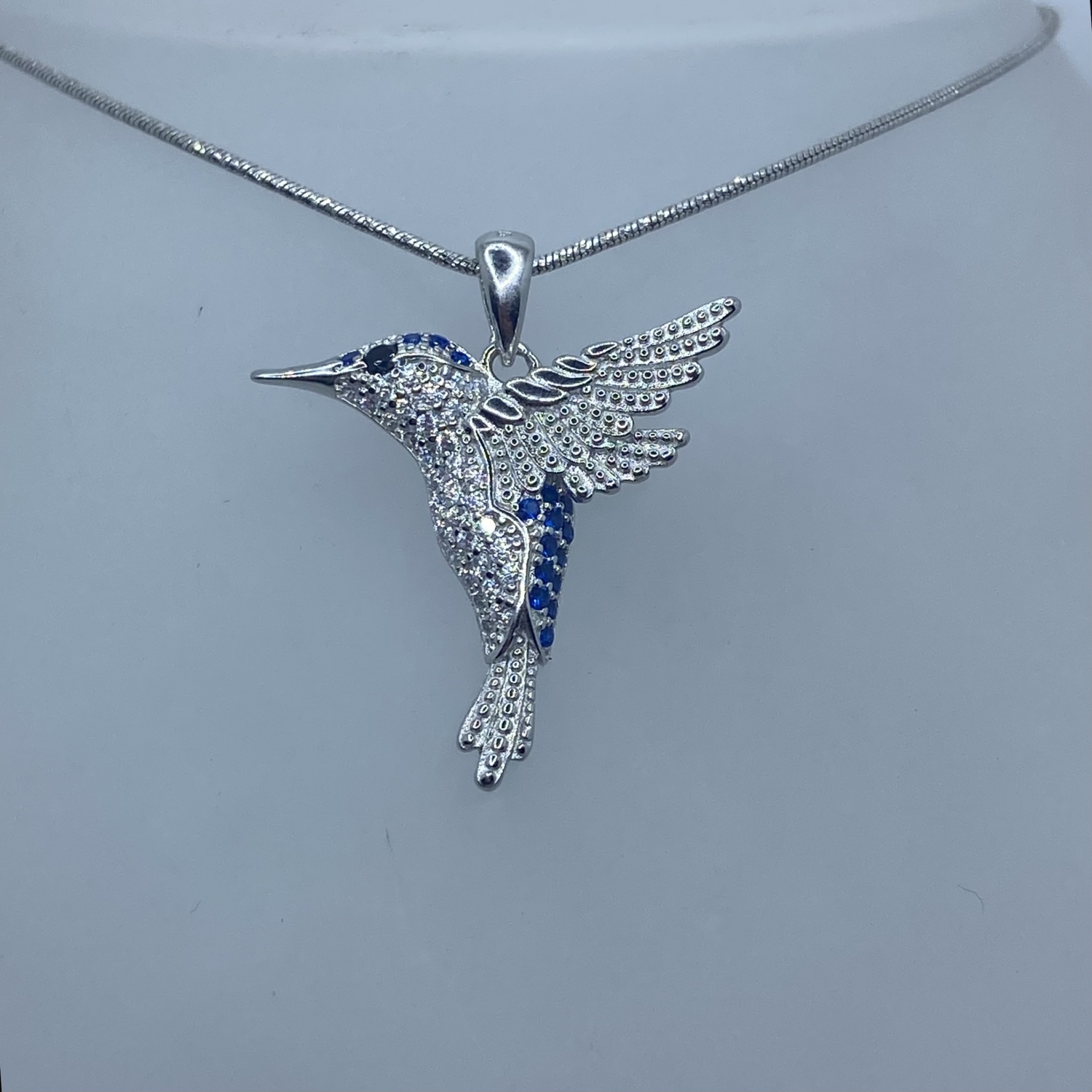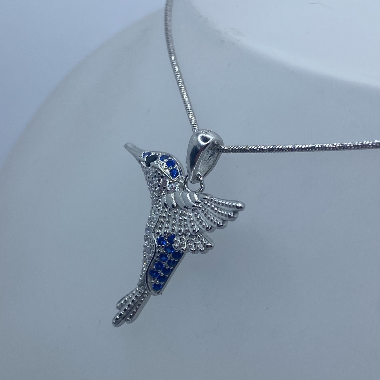 Különleges,aprólékosan kidolgozott,3D-s kolibri medál kék,fehér,fekete kövekkel kirakva,rhódiumozott felülettel.
