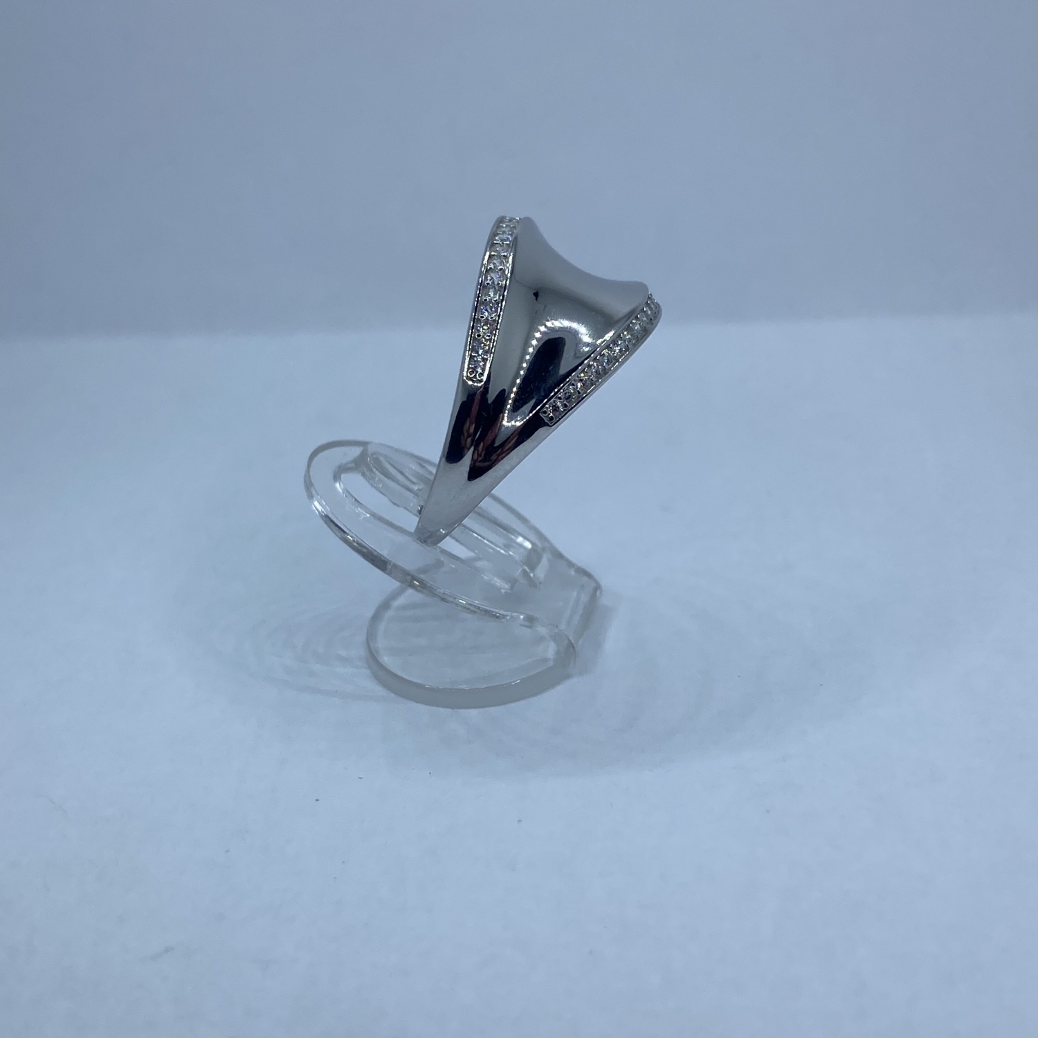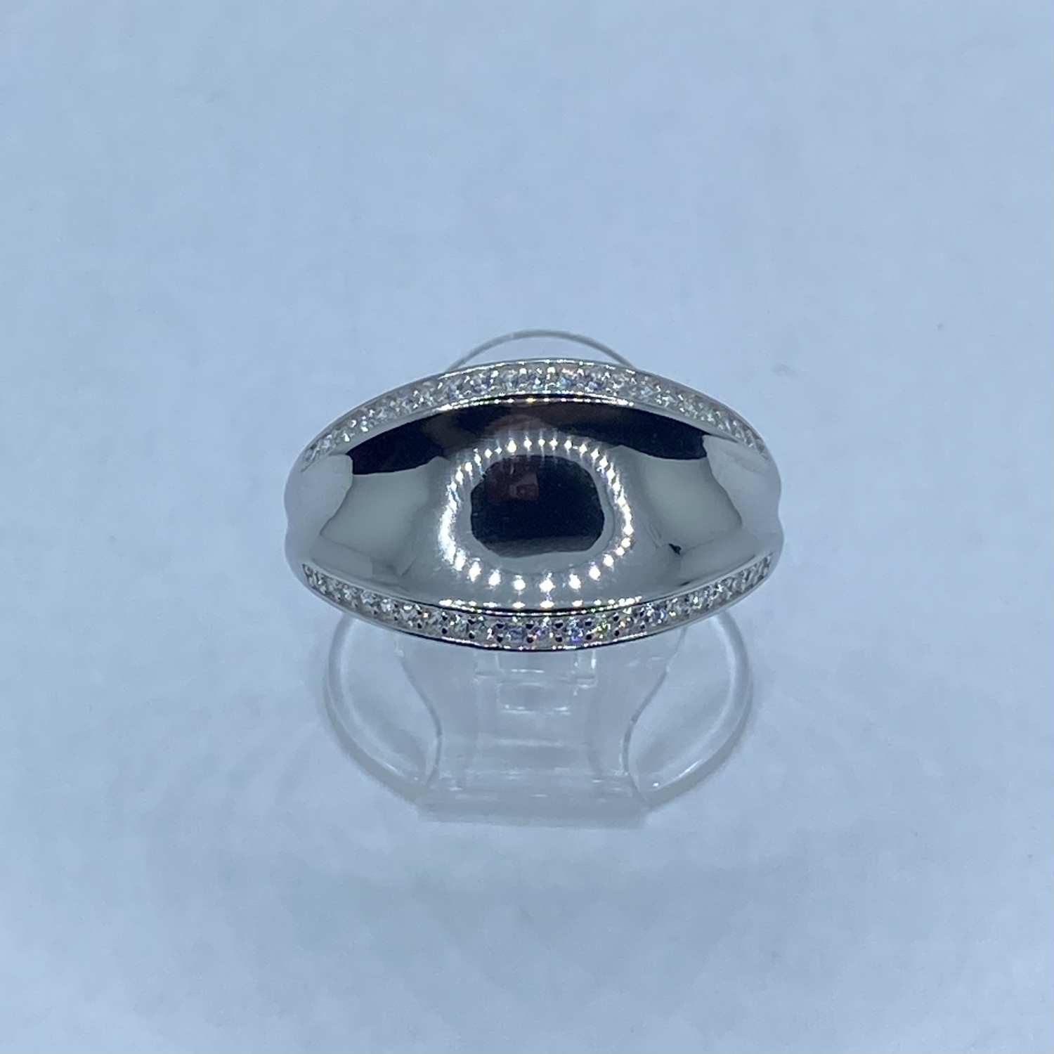 Modern formájú,fényes,homorú felületű ezüst gyűrű,két szélén kirakott apró fehér kövekkel.Extra nagy méret!