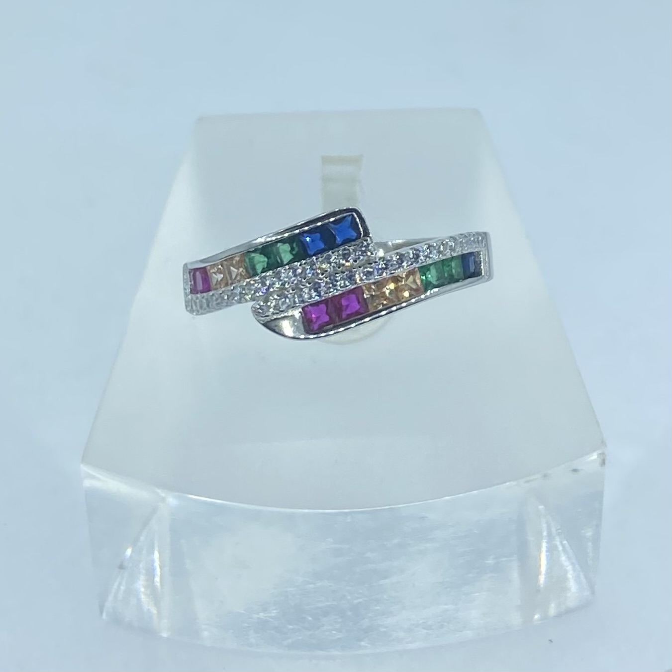 Ezüst gyűrű színes négyzet alakú,és kerek fehér kövekkel.