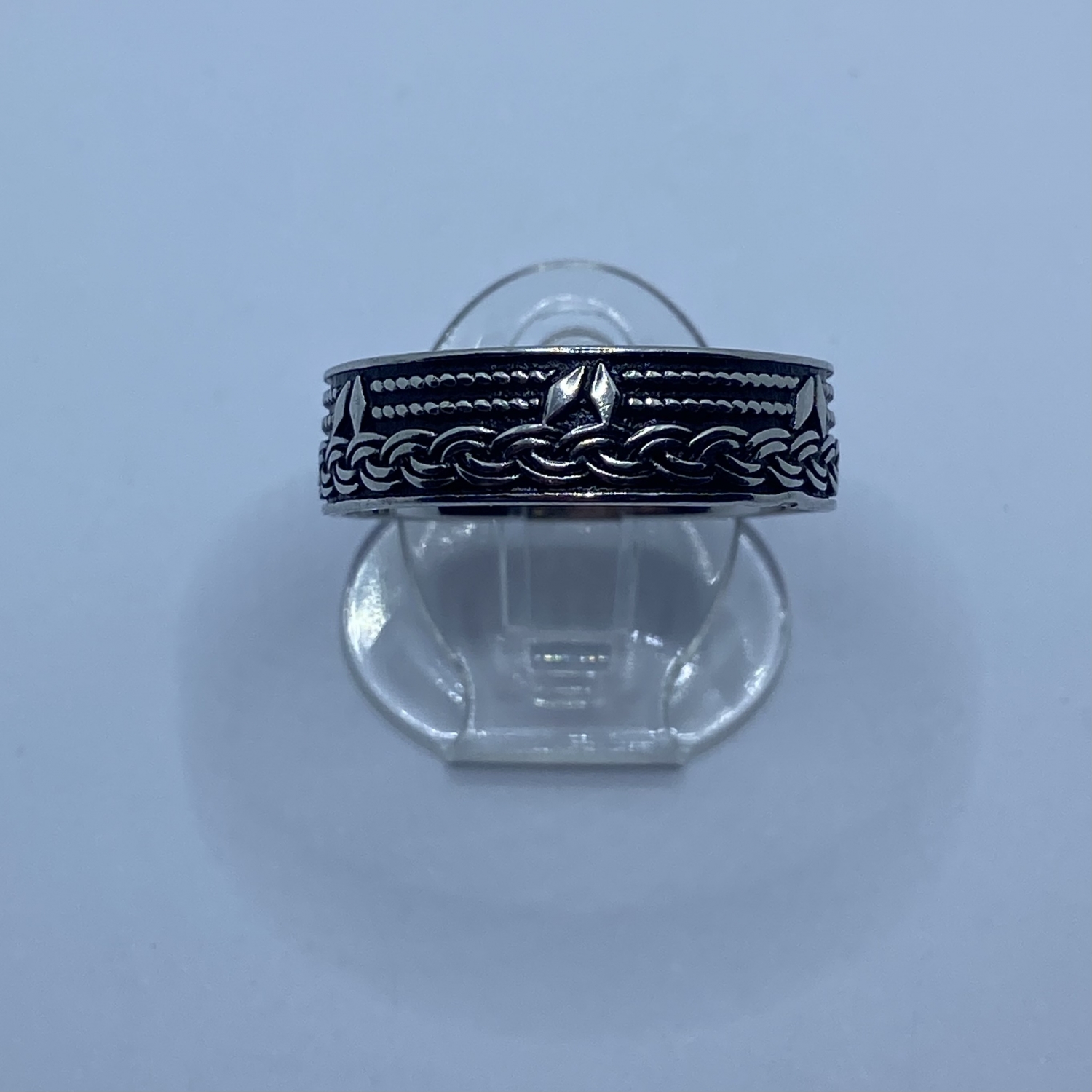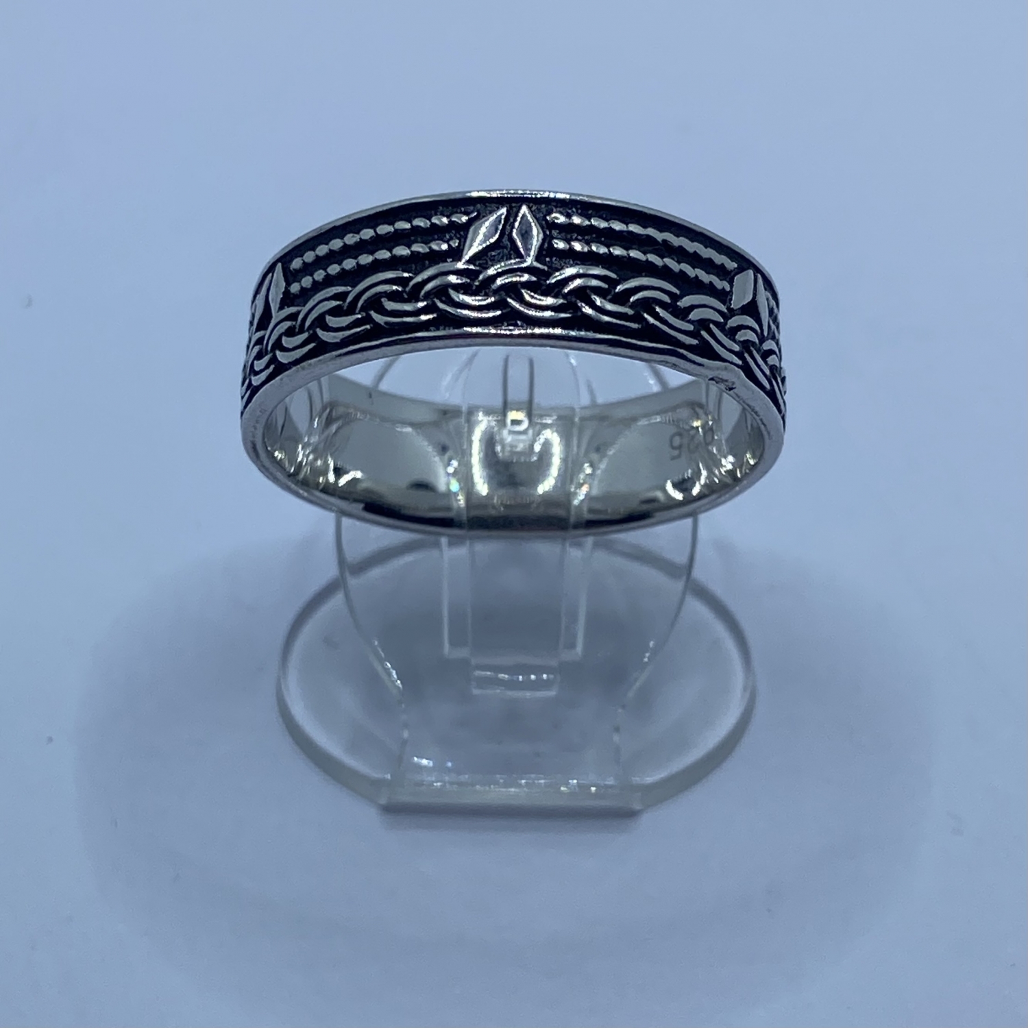 Antikolt ezüst férfi karikagyűrű nonfiguratív mintával. Szélesség:6,8 mm Mérete:65 Súlya:5,51 gramm