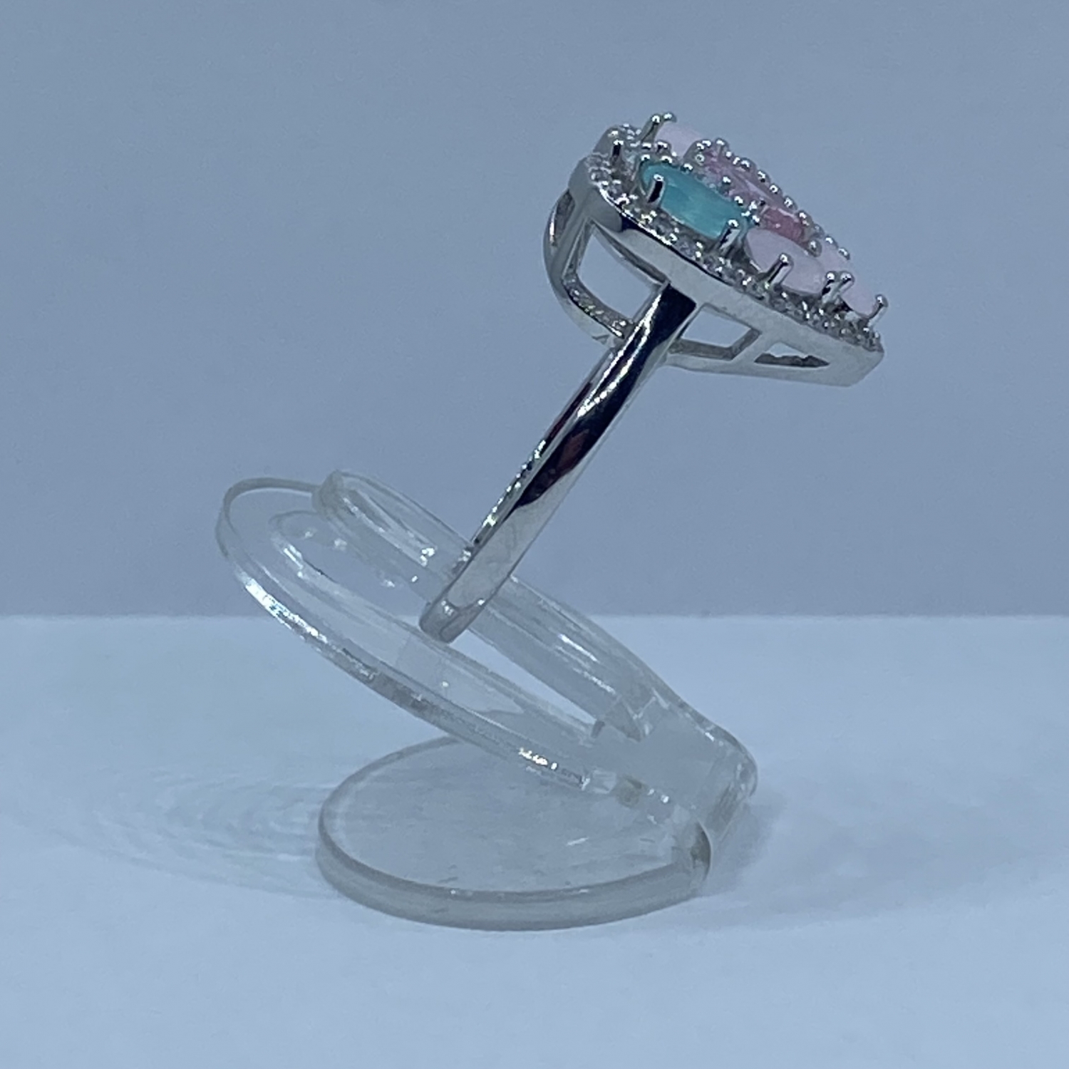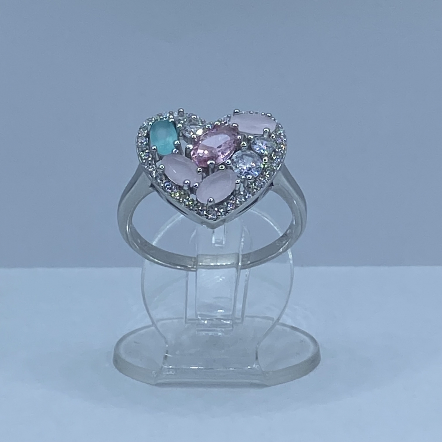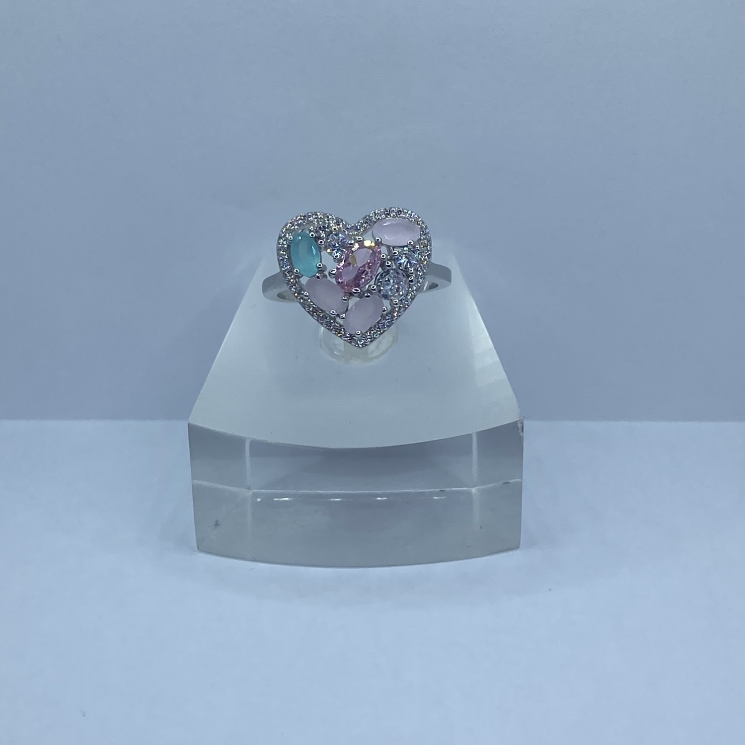 Szív alakú ezüst gyűrű pasztell színű rózsaszín,mentazöld,fehér kövekkel.