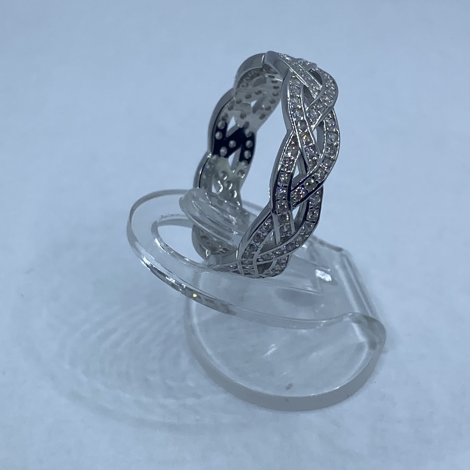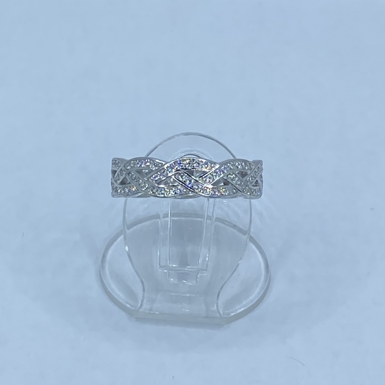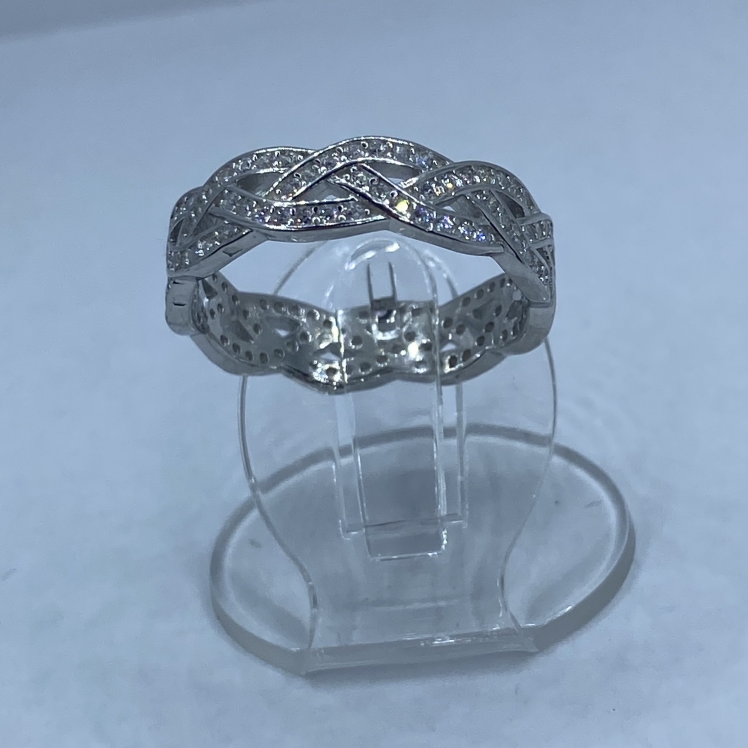 Fonott mintás ezüst gyűrű apró fehér kövekkel kirakva,rhódiumozott felülettel. Szélessége:5,2 mm Mérete:54 Súlya:2,8 gramm