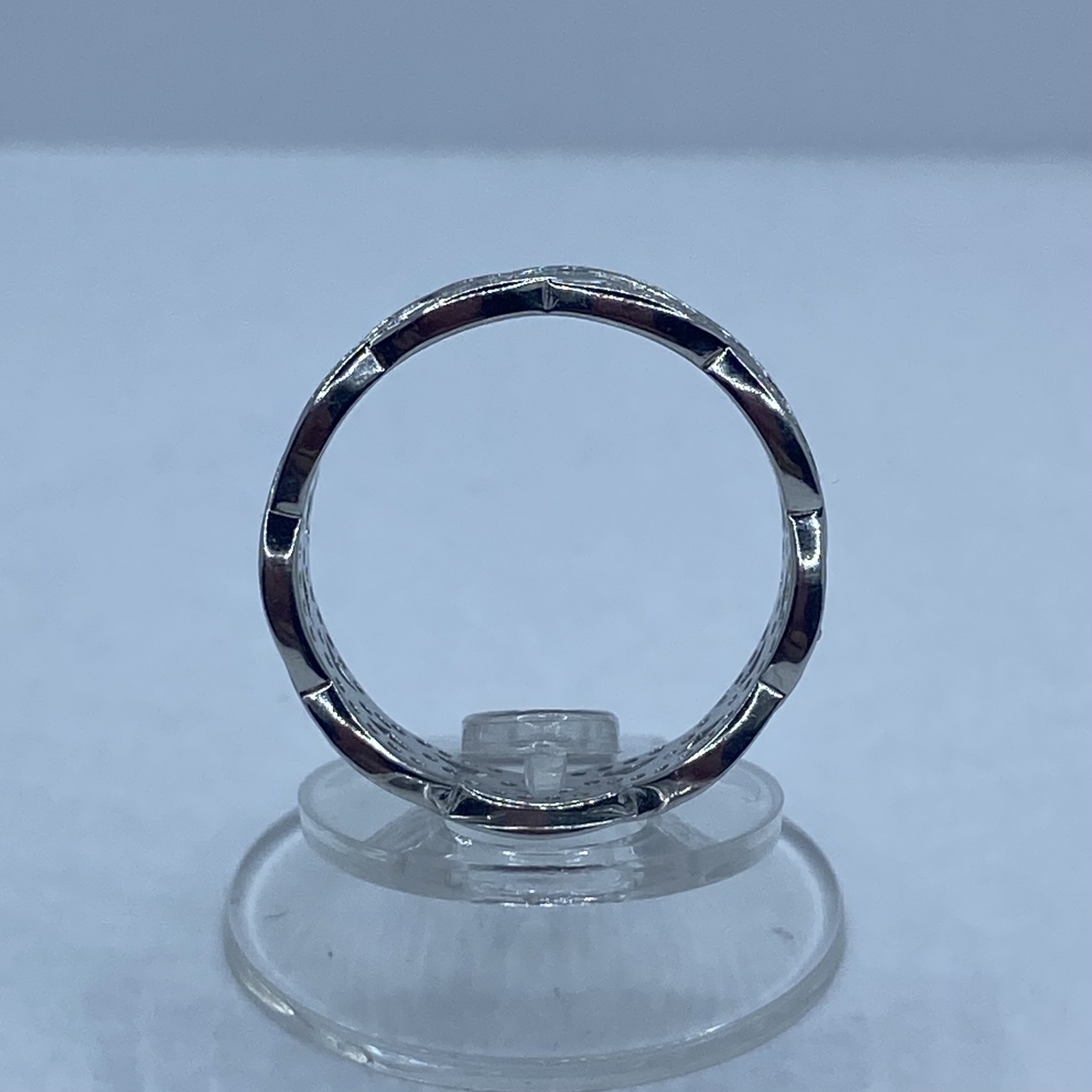Fonott mintás ezüst gyűrű apró fehér kövekkel kirakva.
