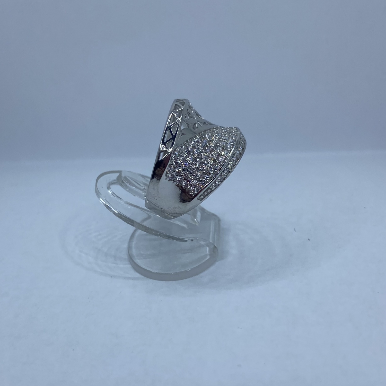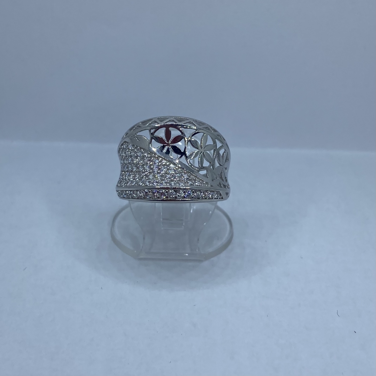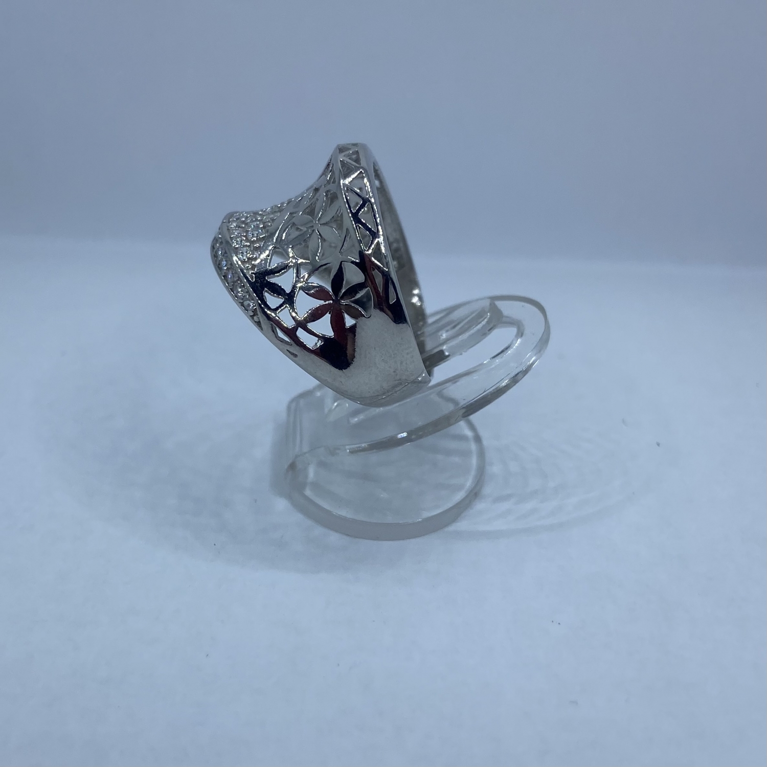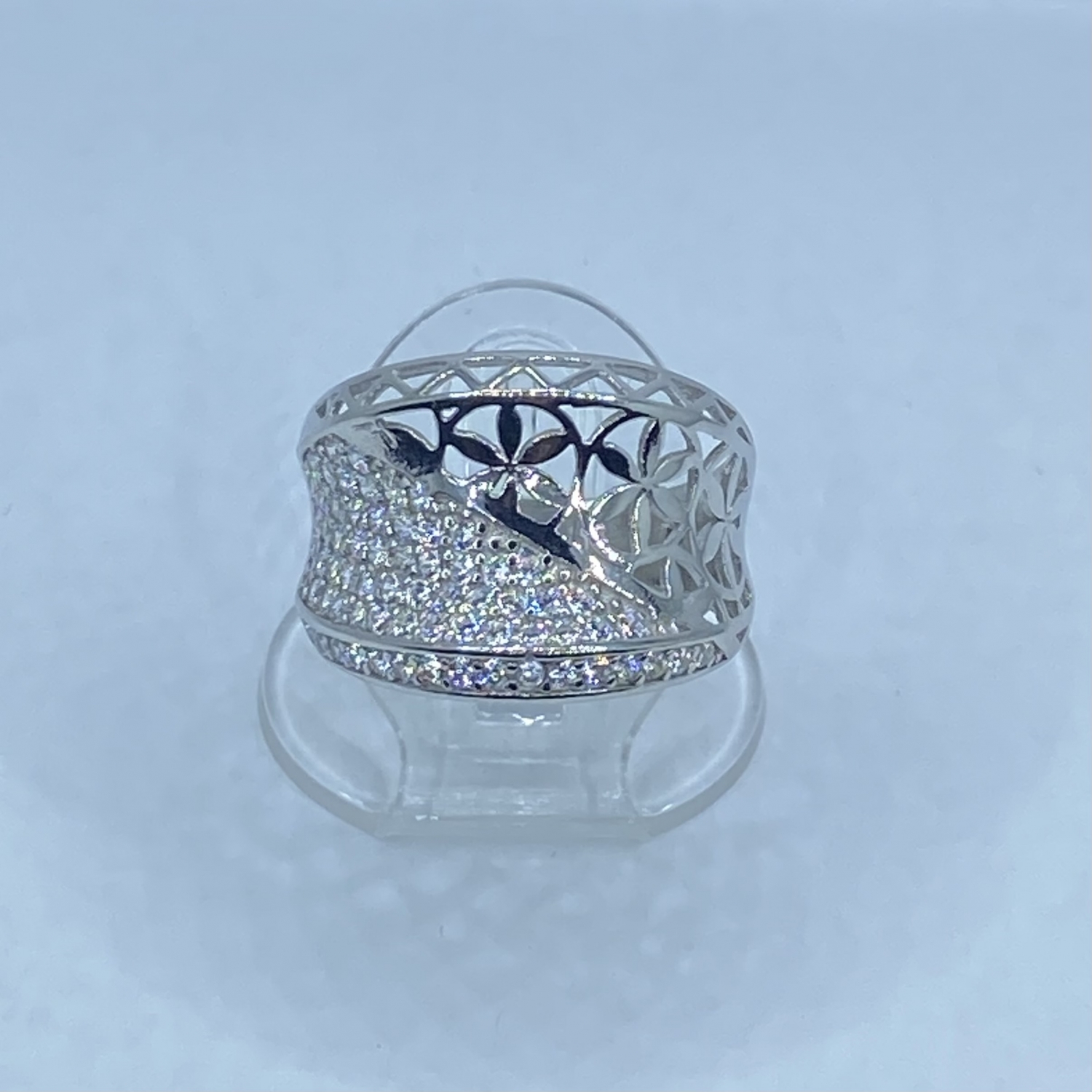 Virágos,köves,homorú felületű,modern formájú ezüst gyűrű. Szélessége:15,2 mm Mérete:55 (3,8 gramm), 57 (4,3 gramm) Súlya:3,8 gramm