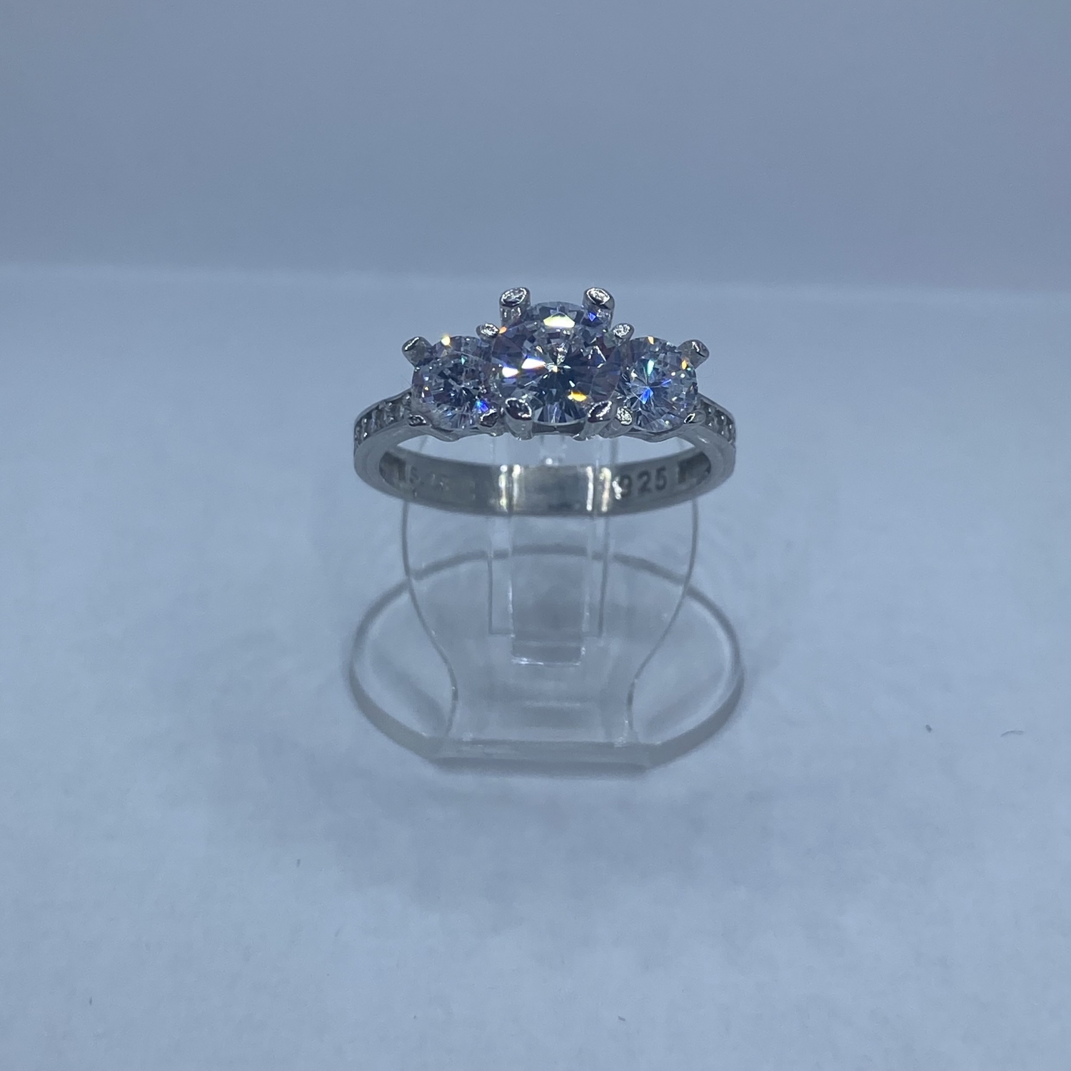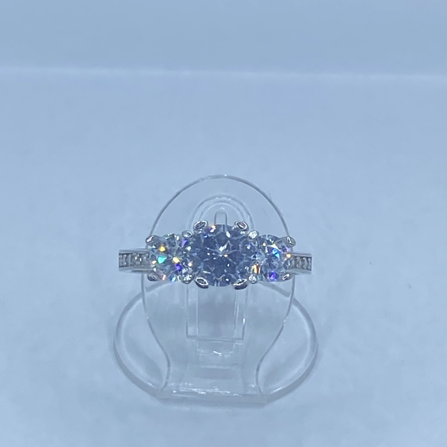 Középen három nagyobb fehér kerek kő,karmos foglalatban,két oldalt apró fehér kerek kövekkel kirakott ezüst gyűrű,rhódiumozott felülettel.