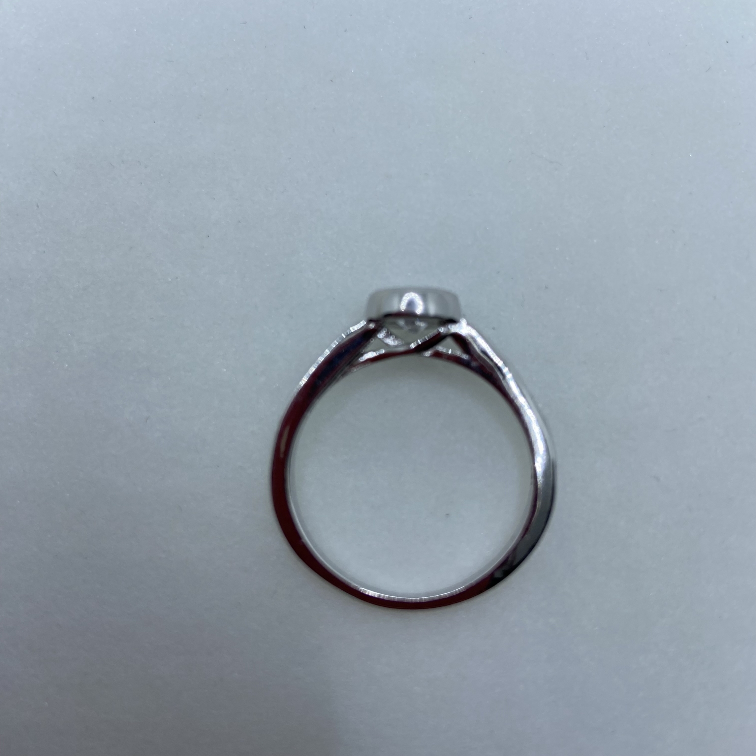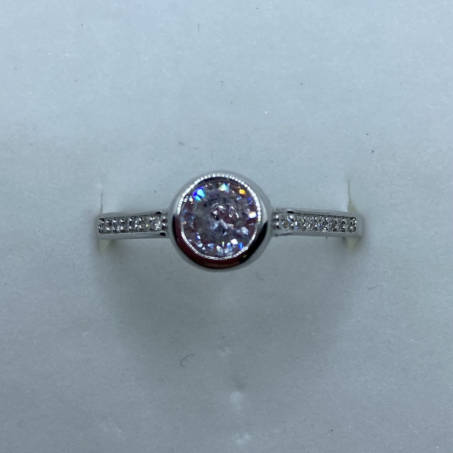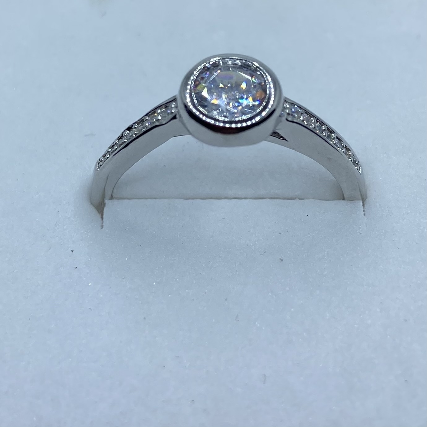 Kerek,zárt foglalatos,fehér kerek kővel,oldalt apró kövekkel díszített ezüst gyűrű,rhódiumozott felülettel.