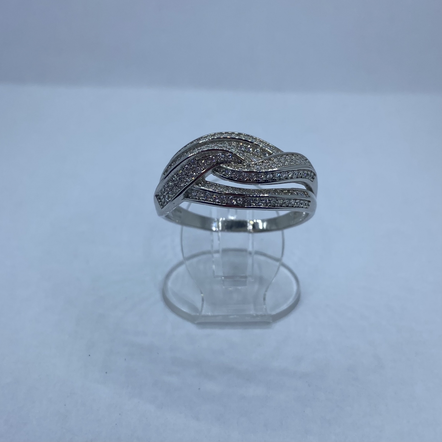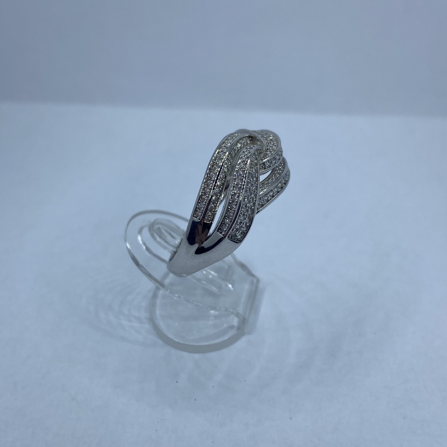 Fehér kövekkel kirakott,összefonódott szálakból álló modern mintás ezüst gyűrű,rhódiumozott felülettel.