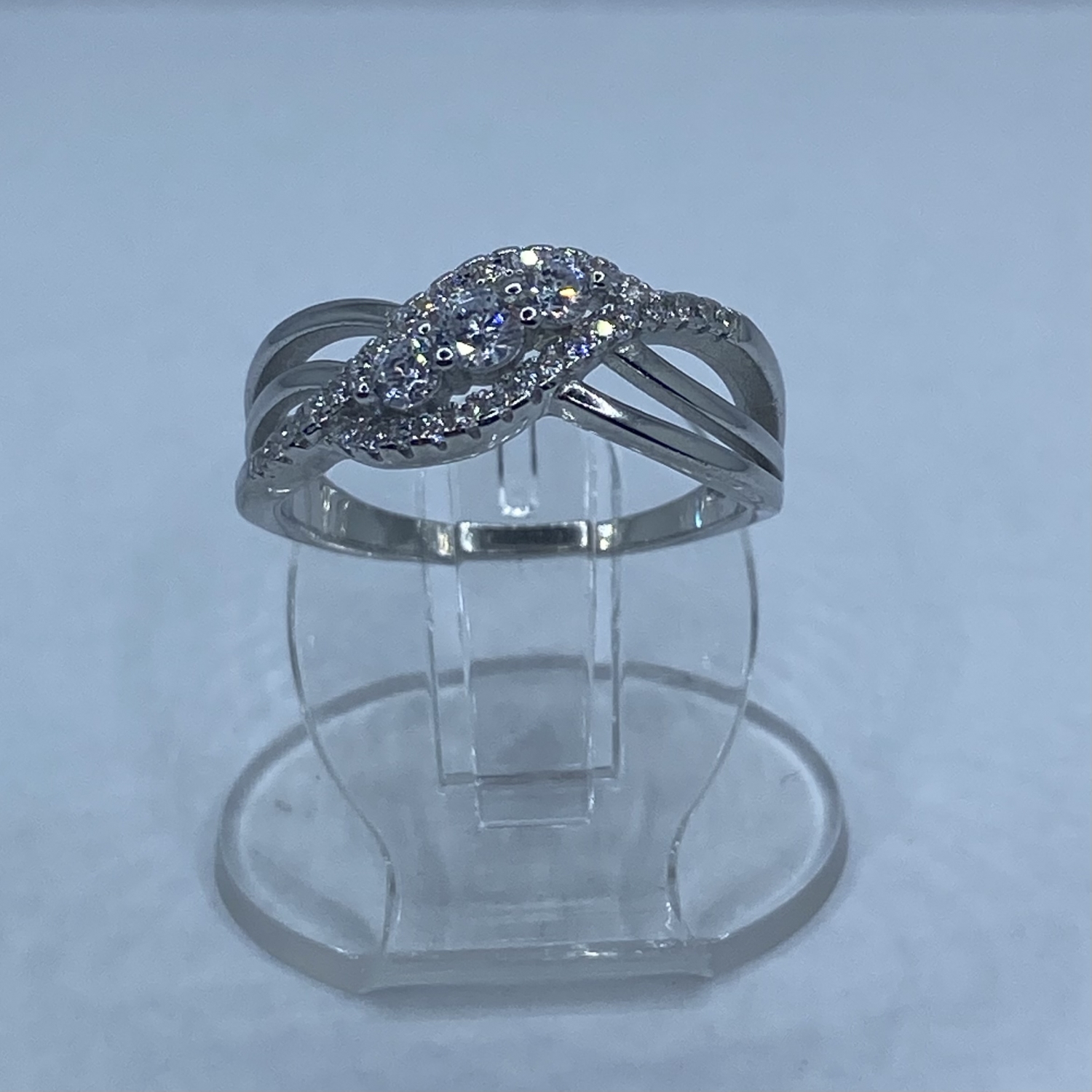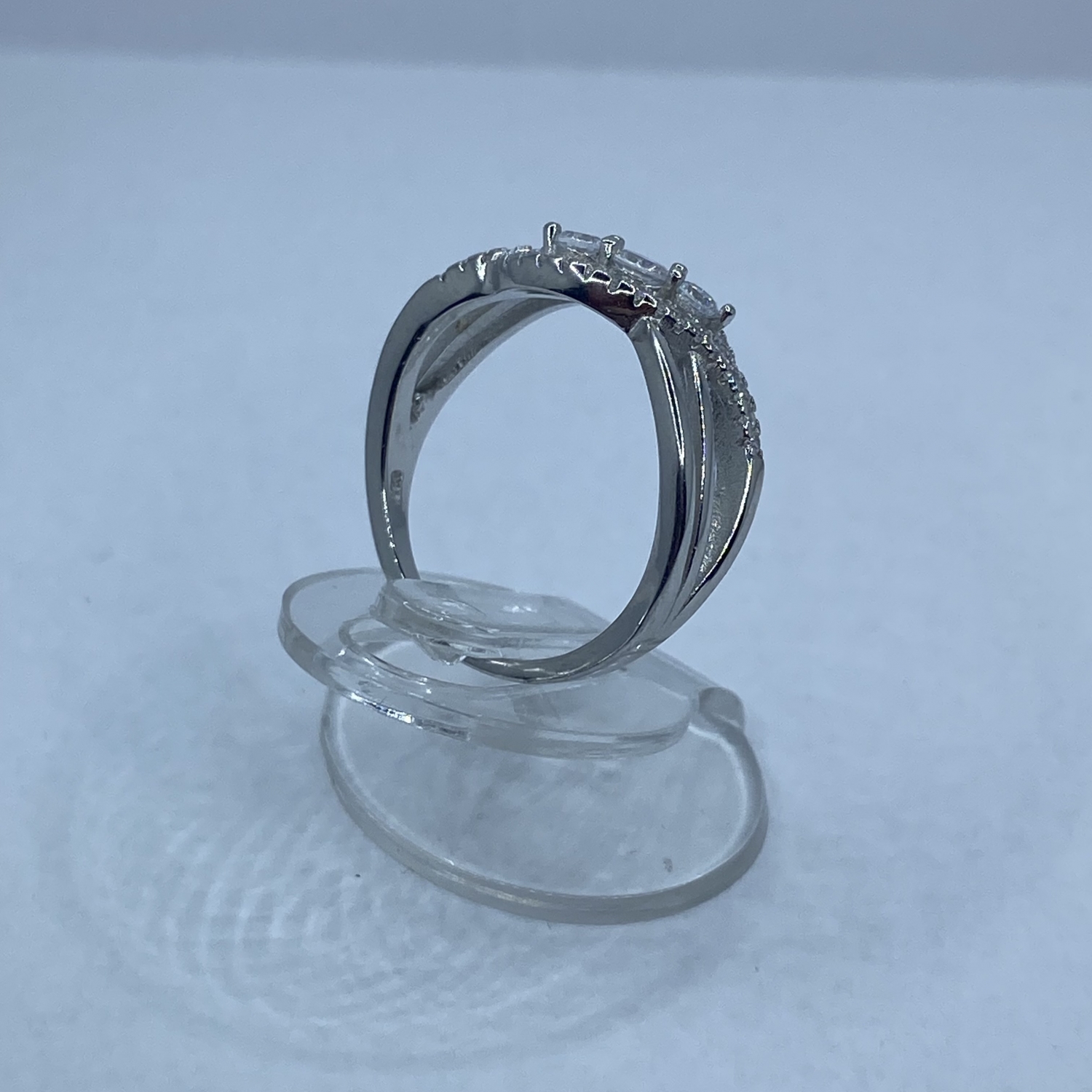 Fehér köves,hullám mintás ezüst gyűrű,rhódiumozott  felülettel.A gyűrű legszélesebb része:8 mm