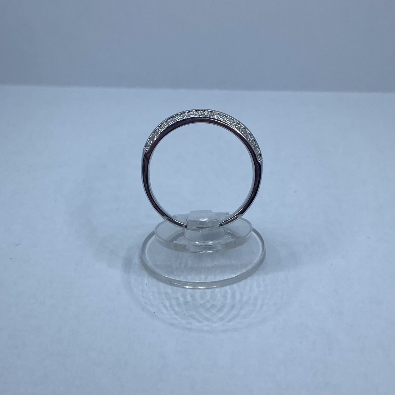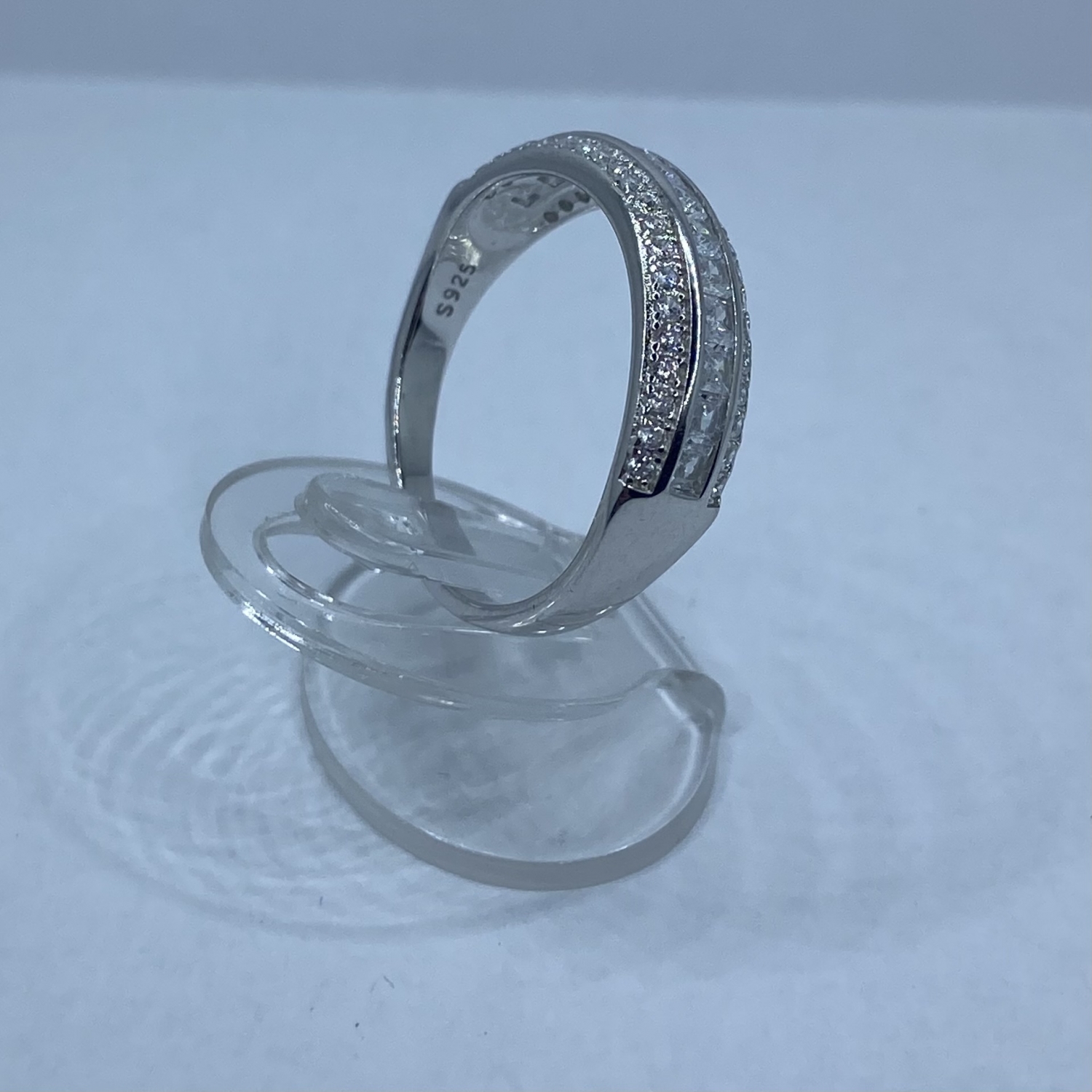 1/2 részéig fehér kövekkel körbe rakott ezüst gyűrű karika hatással.