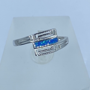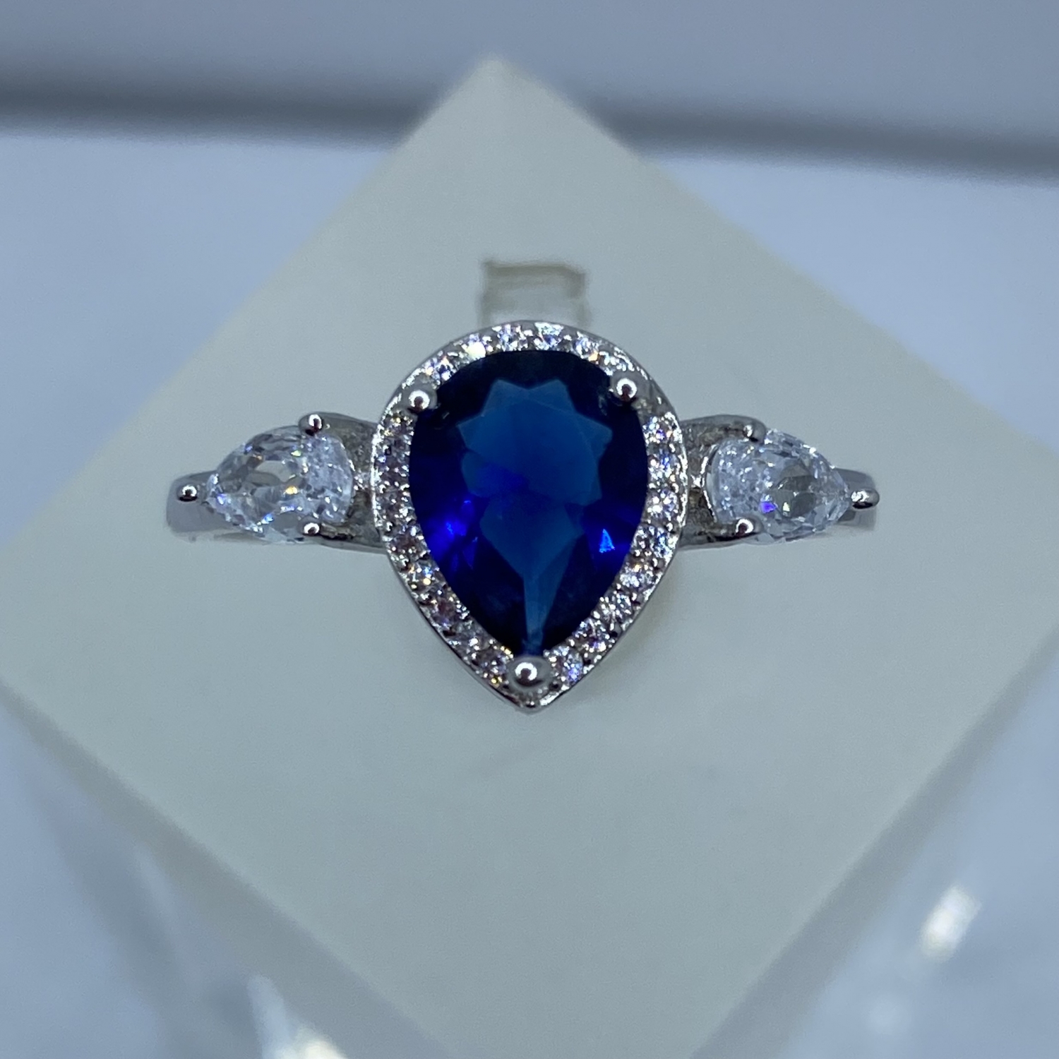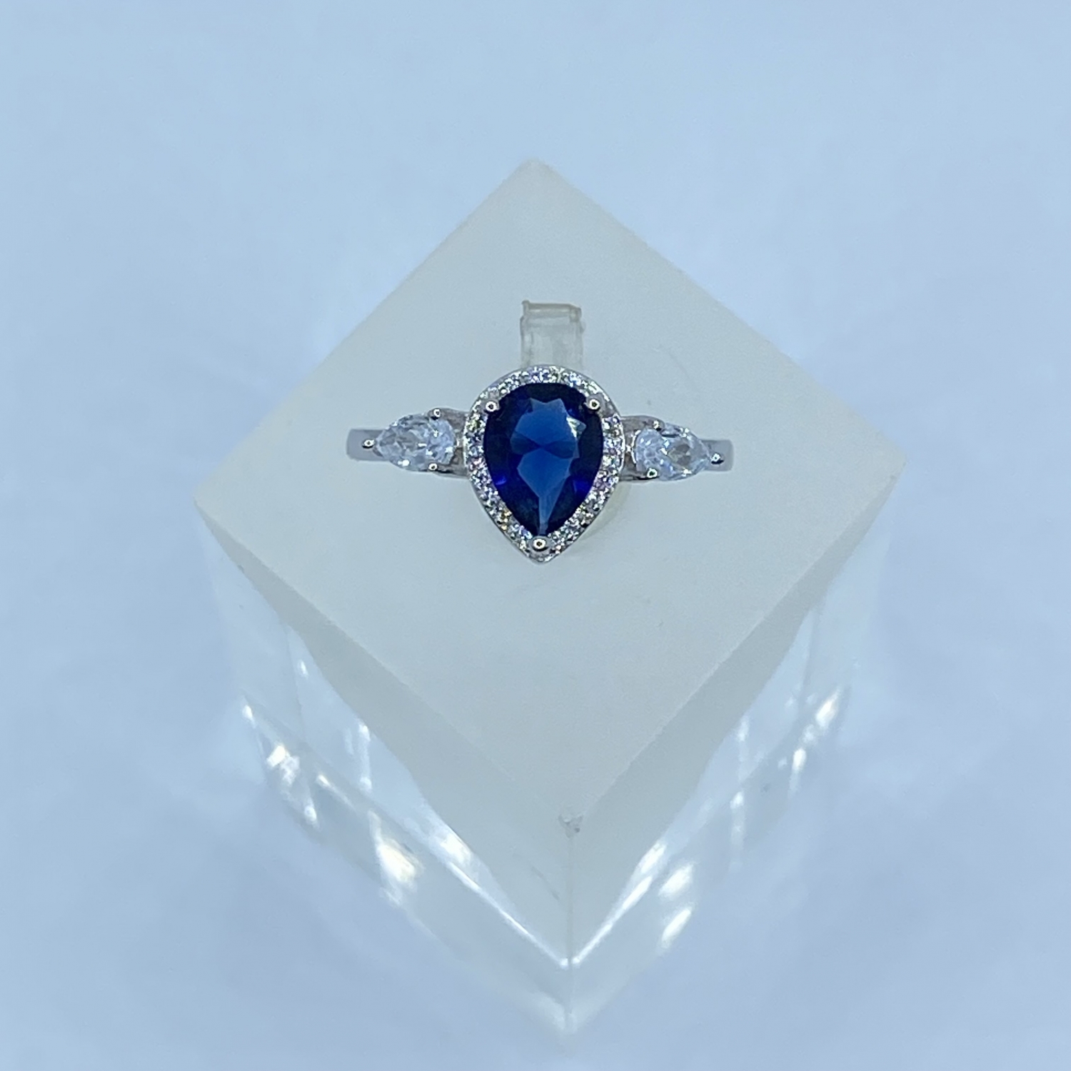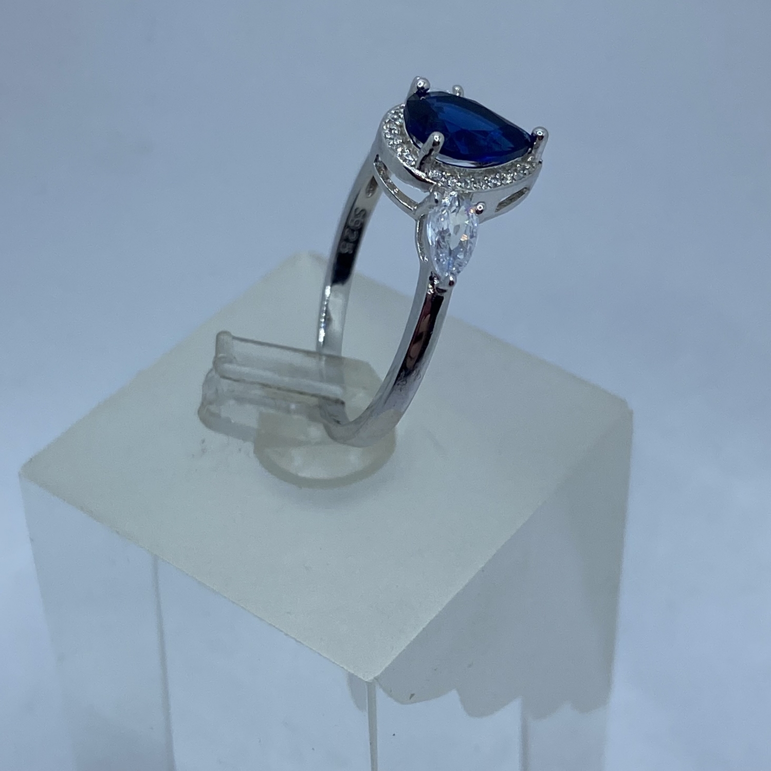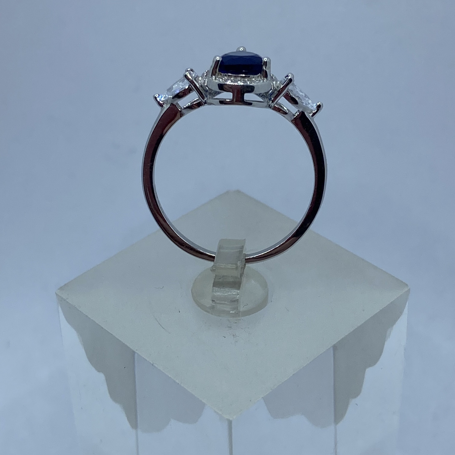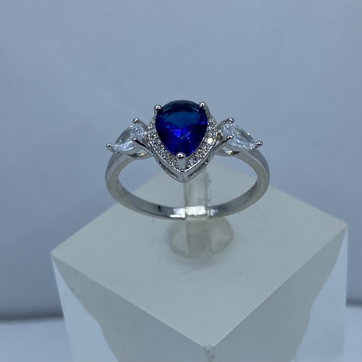 Ezüst gyűrű, egy nagyobb középső zafírkék ,és két oldalán két kisebb fehér csepp alakú kővel,valamint a középső követ körbe vevő apró fehér kövekkel,rhódiumozott felülettel.