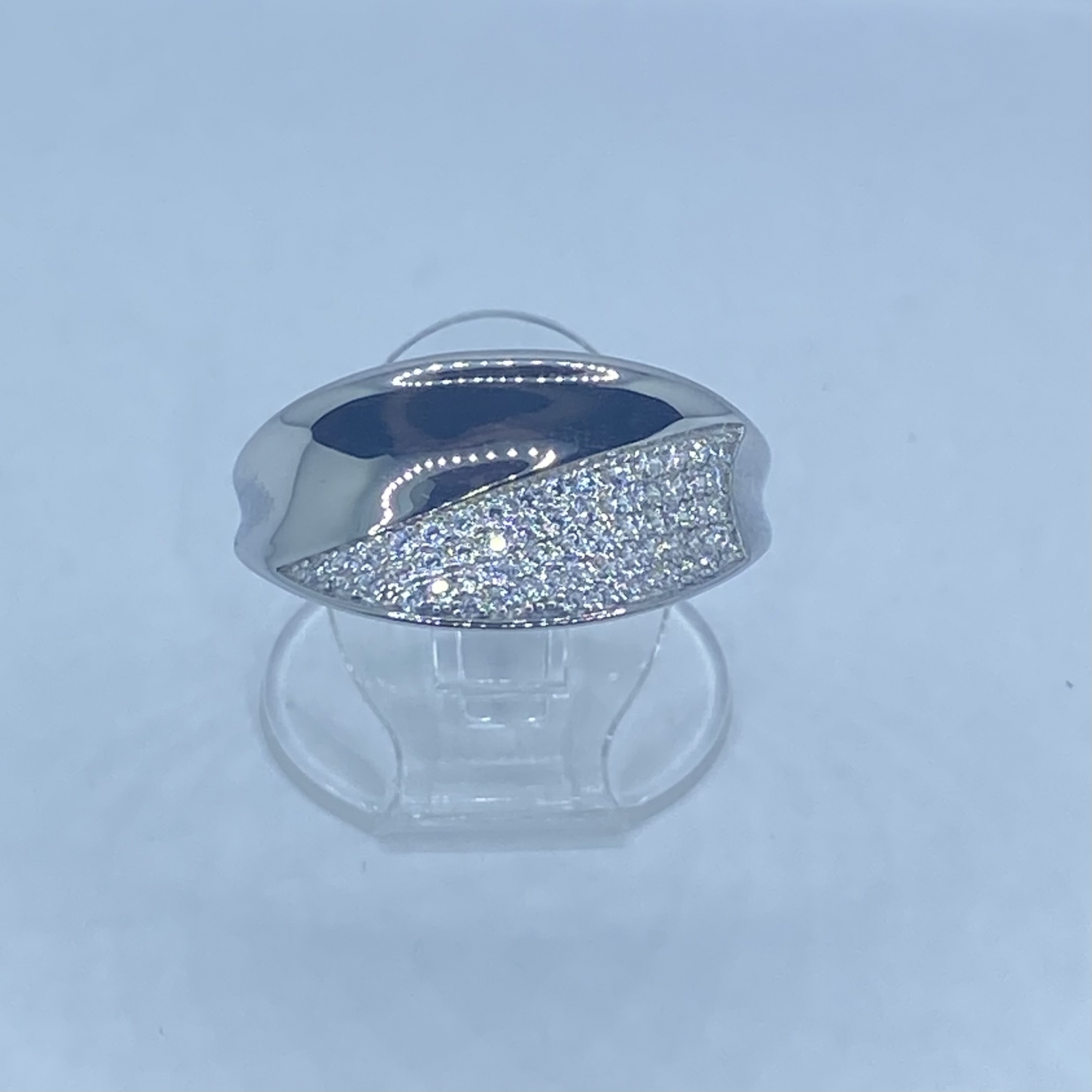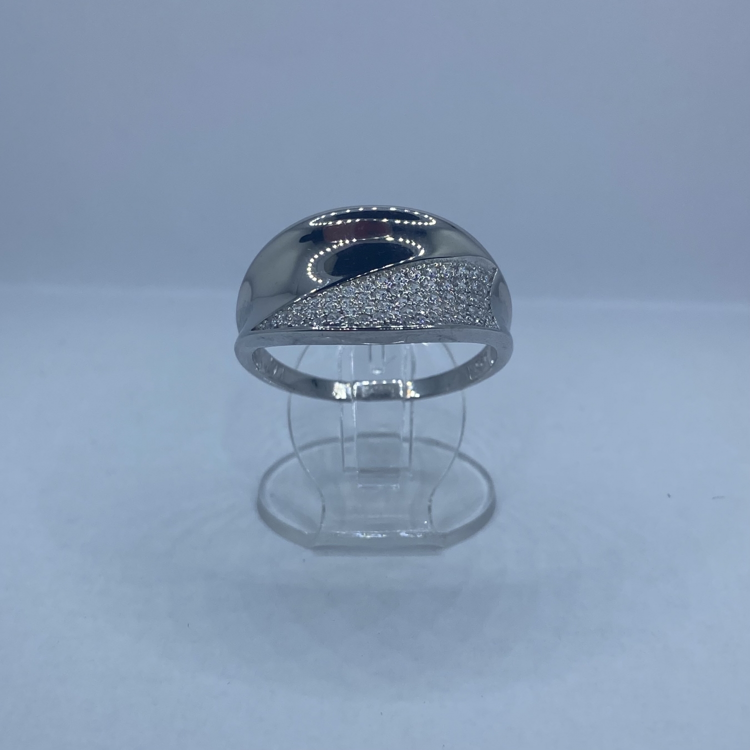 Széles fejű,homorú,átlósan fényes,átlósan fehér kövekkel díszített ezüst gyűrű,rhódiumozott felülettel.