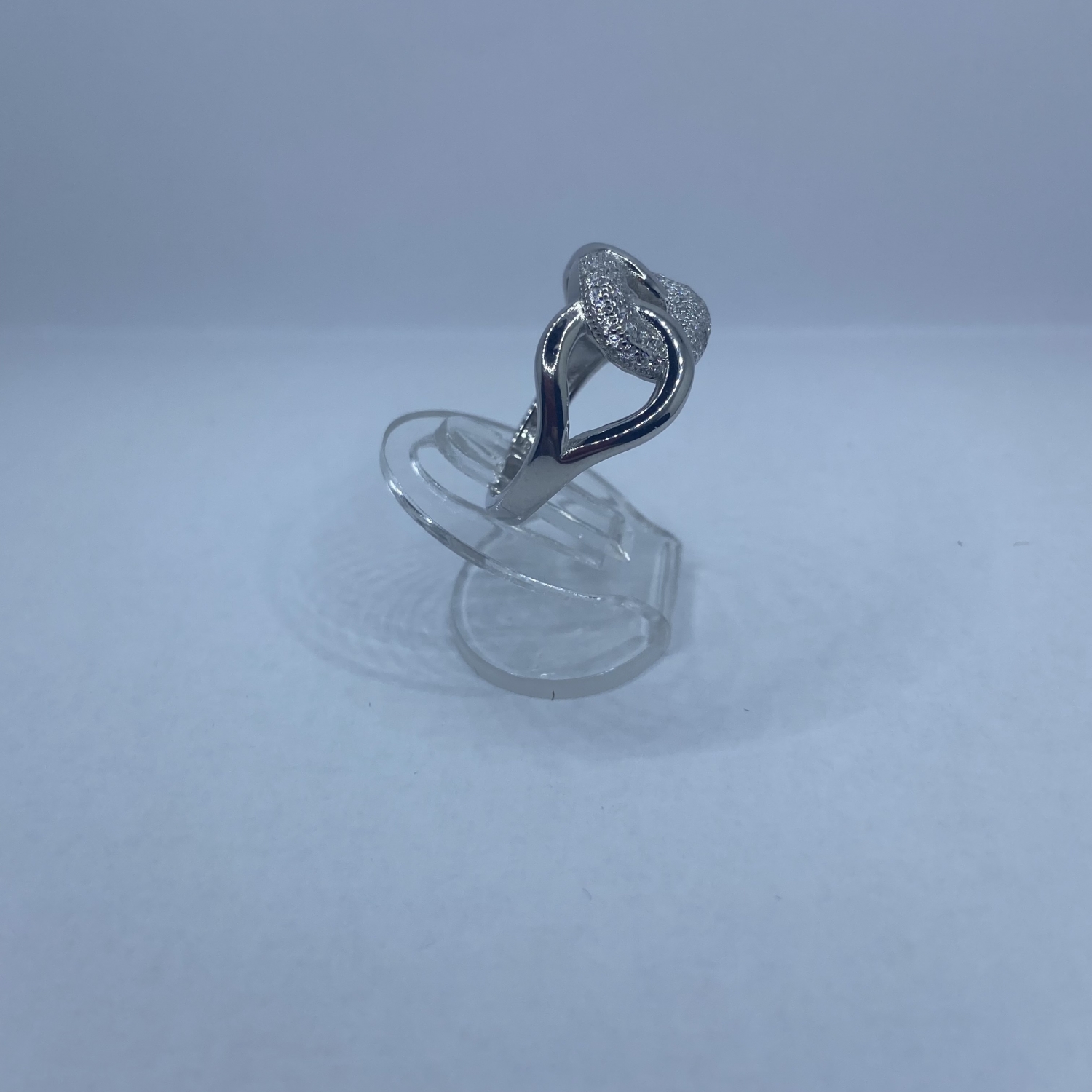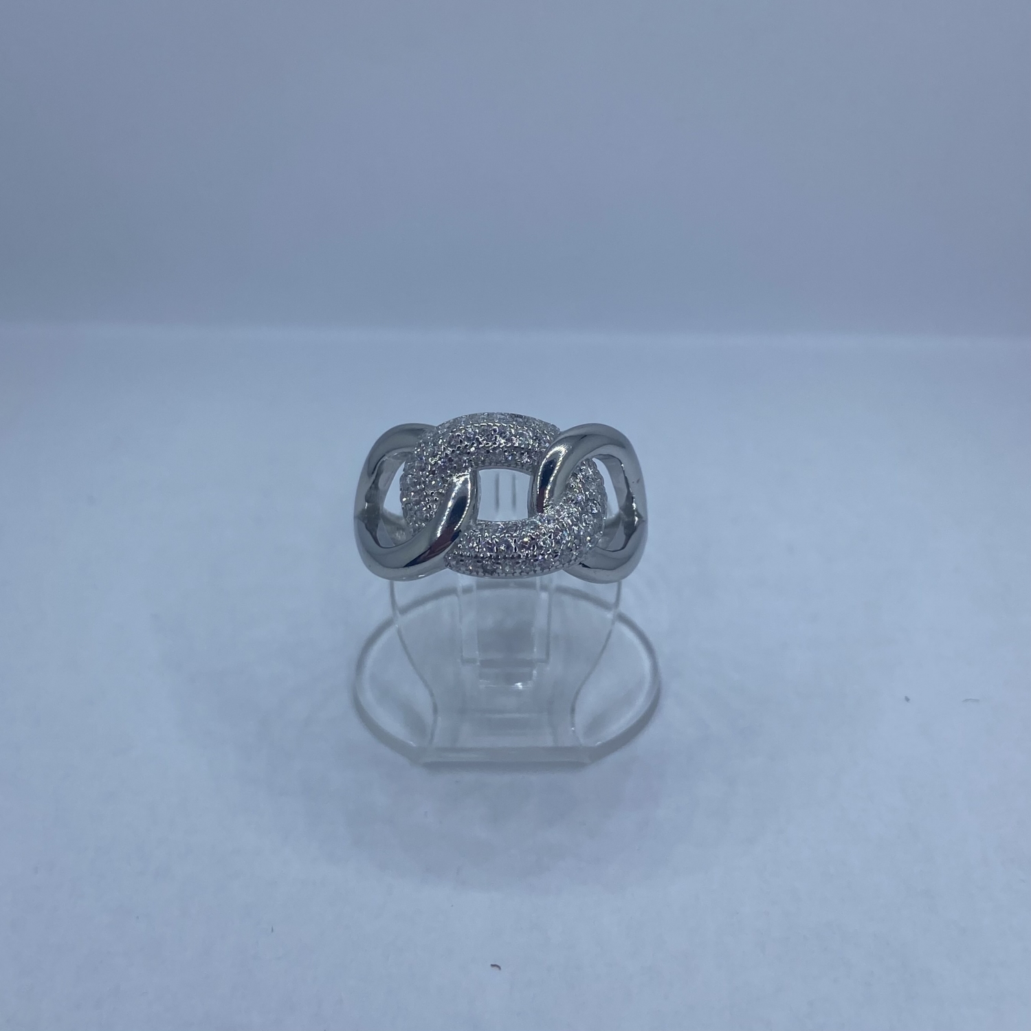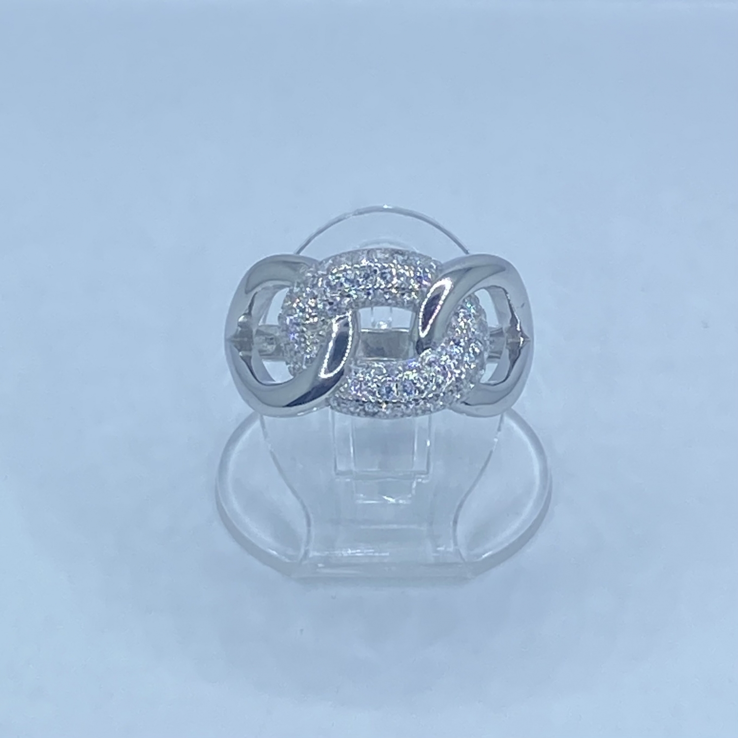 Két fényes,és egy kövekkel kirakott karika egymásba fonódott mintájú ezüst gyűrű,rhódiumozott felülettel.