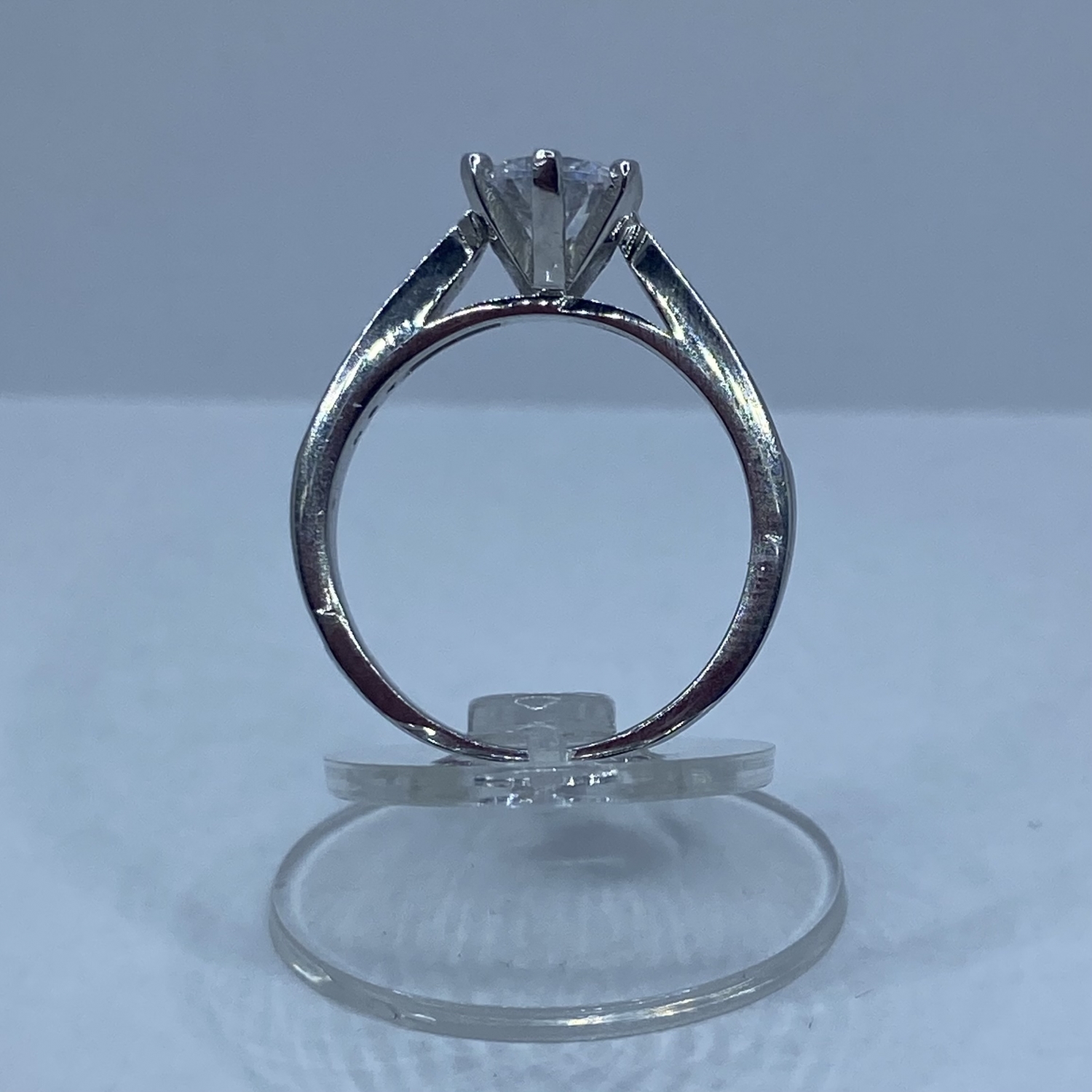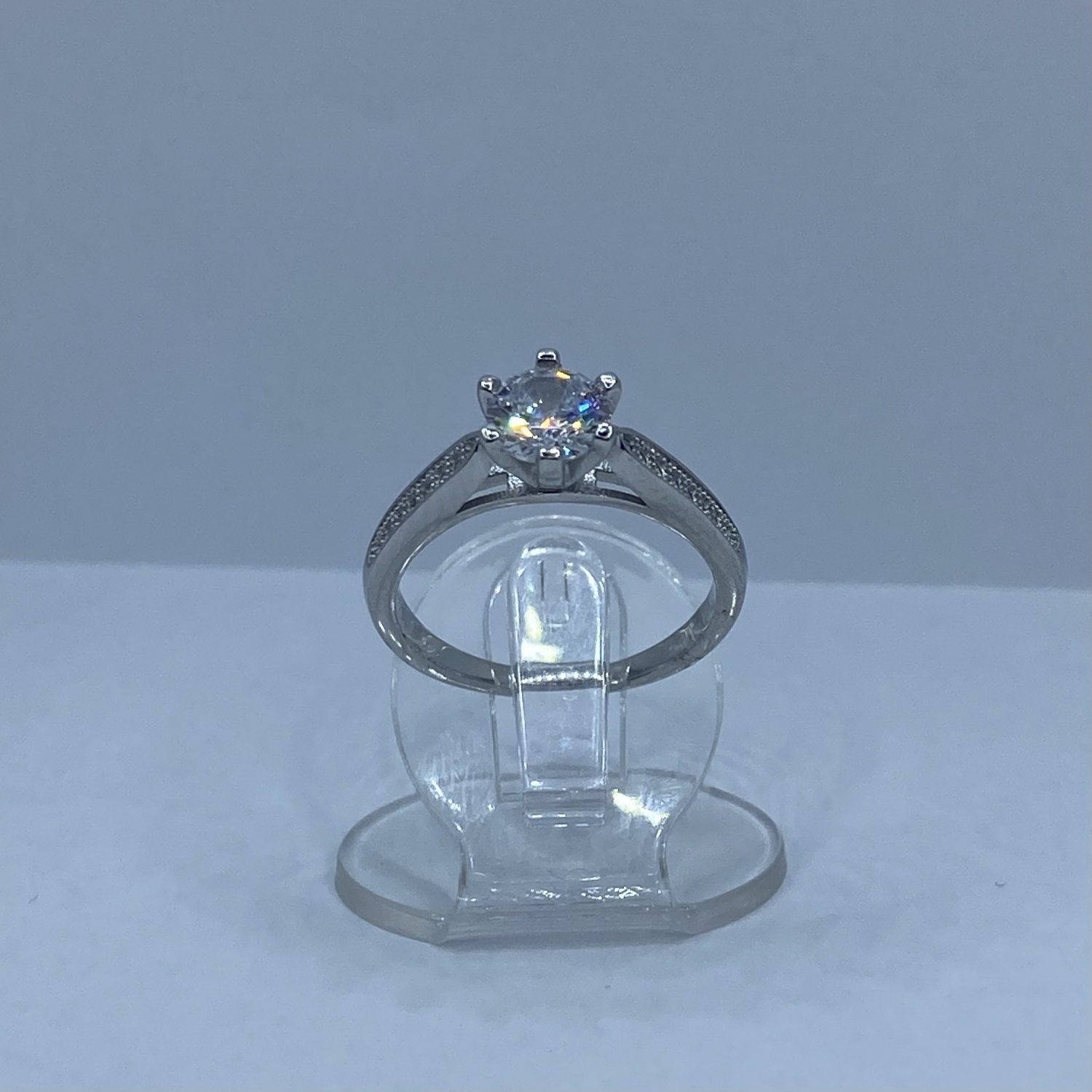 Nagy fehér köves ezüst szoliter eljegyzésű gyűrű karmos foglalattal,rhódiumozott felülettel.Legszélesebb mérete:7,4 mm