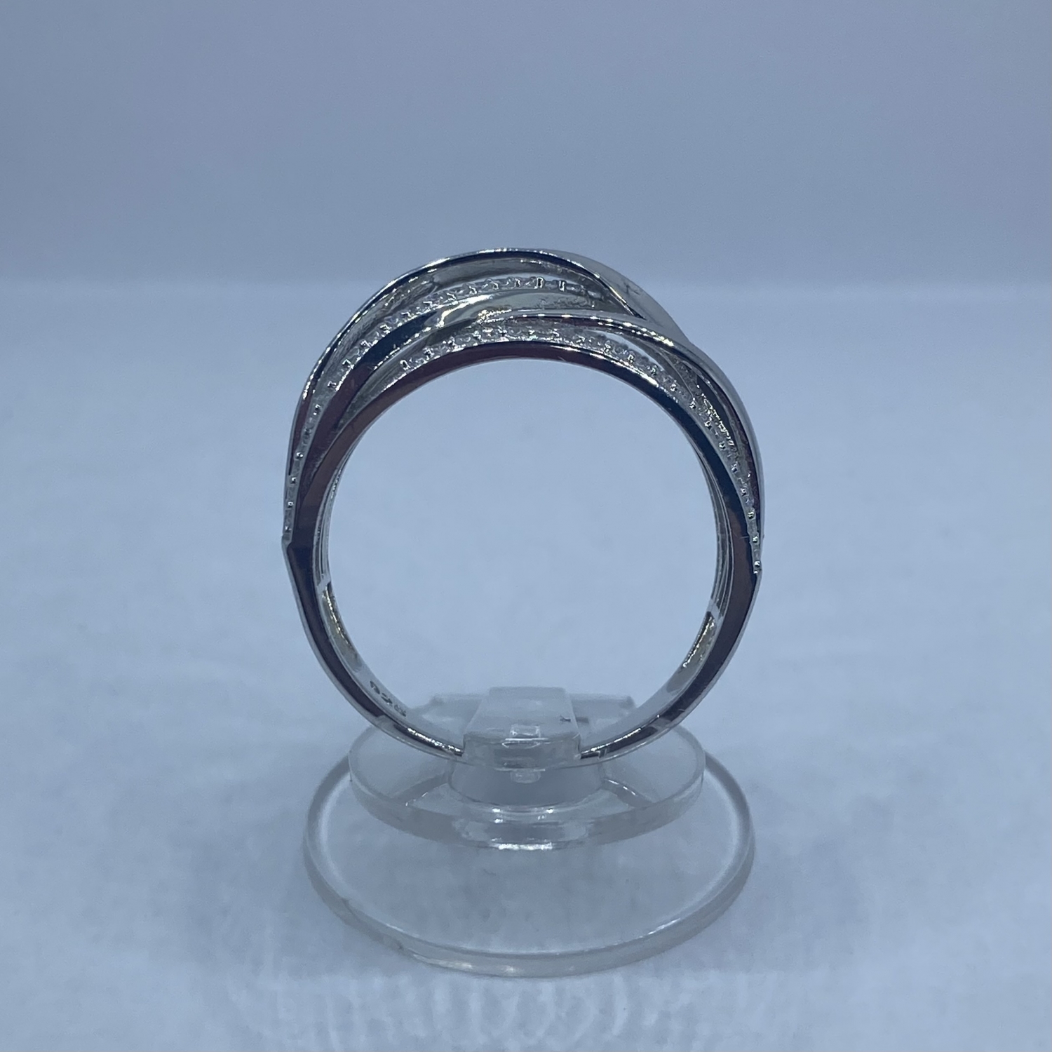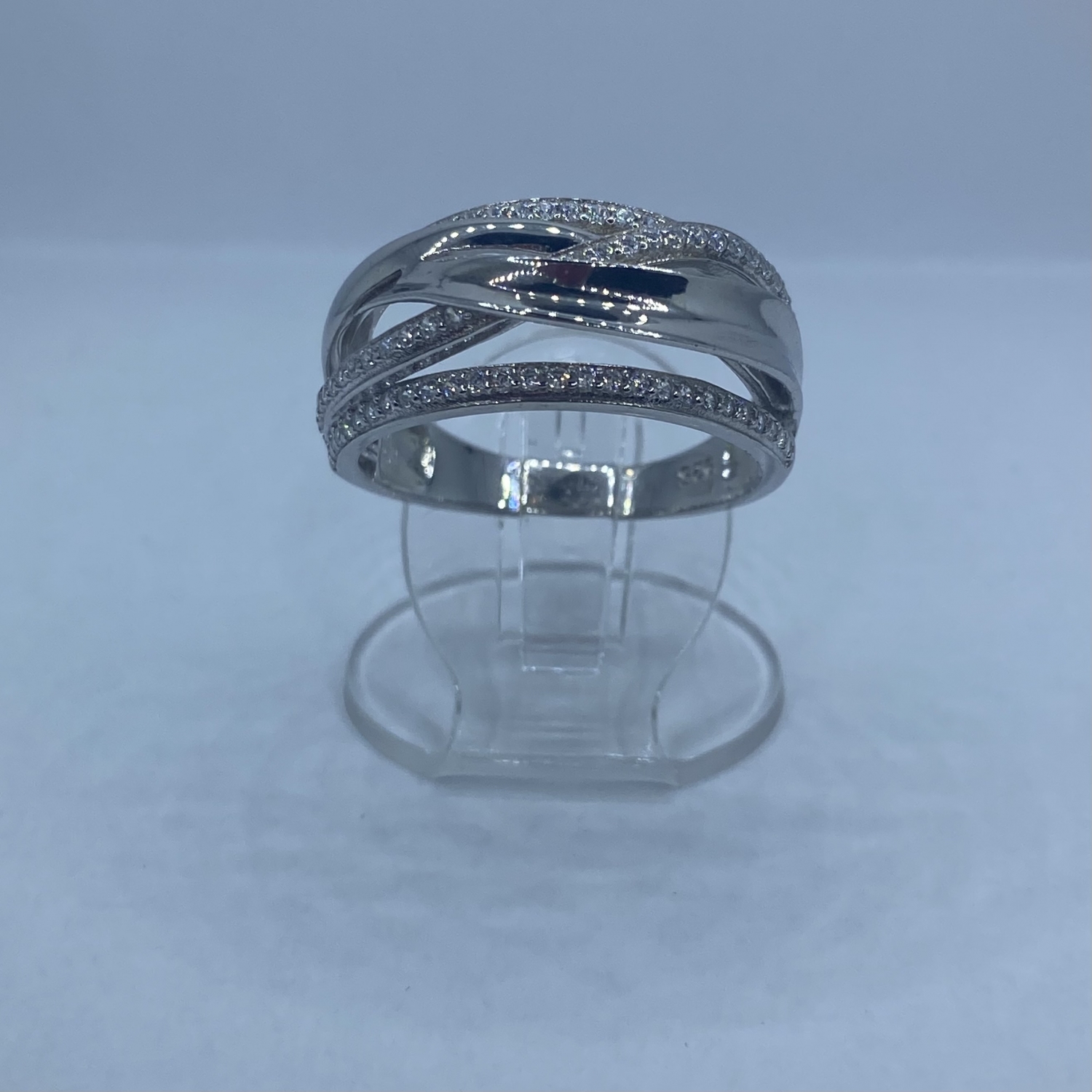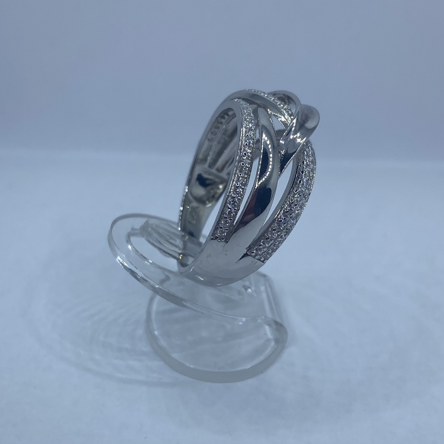 Modern mintás,robusztus ezüst gyűrű fényes,és fehér kövekkel kirakott szálak összefonódásával,rhódiumozott felülettel.