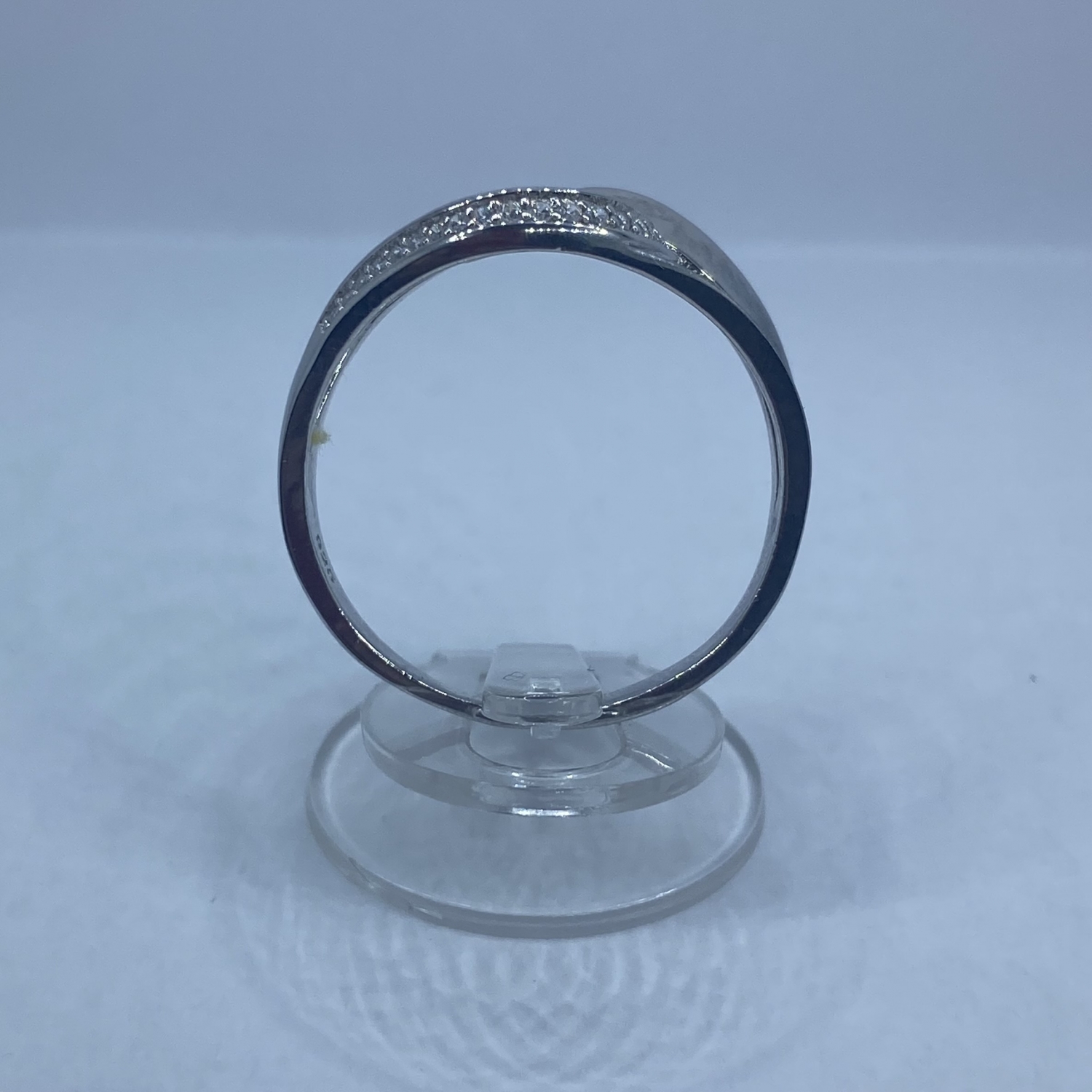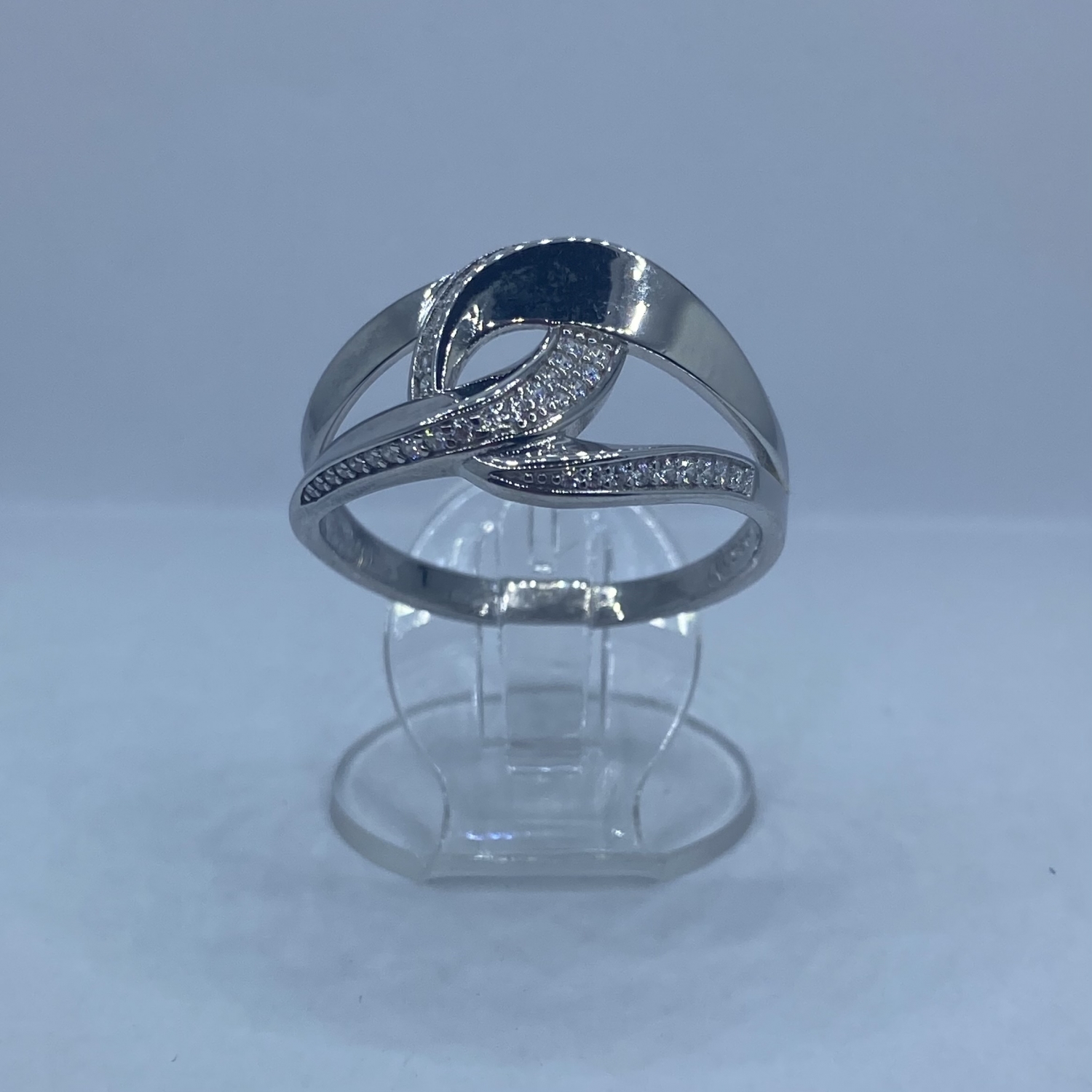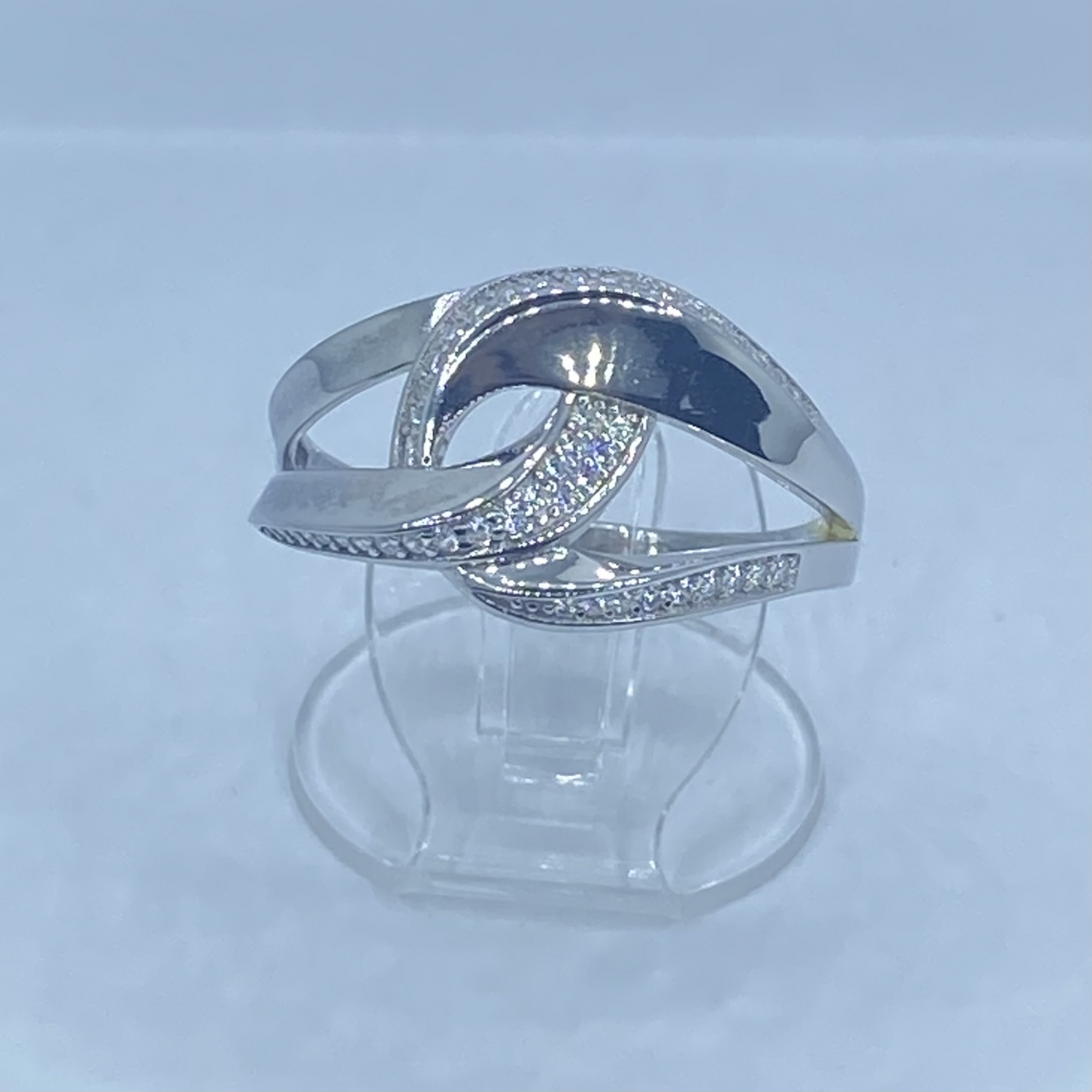 Összefonódott ezüst gyűrű fehér kövekkel,rhódiumozott felülettel.Extra nagy méret