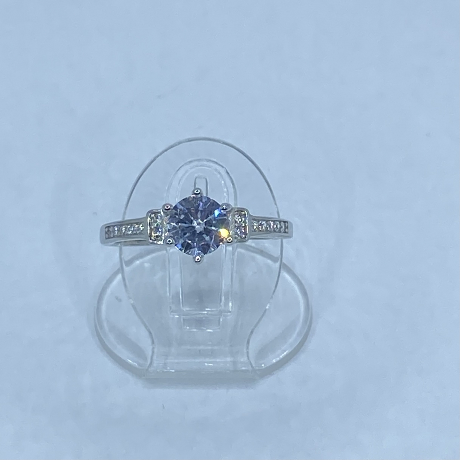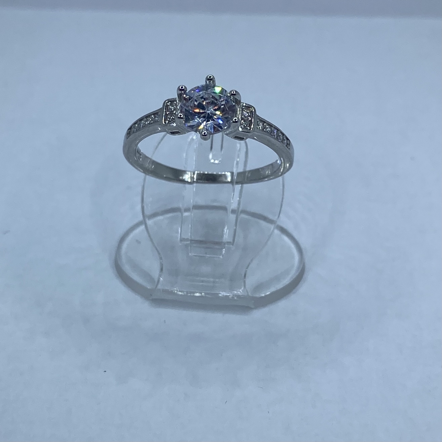 Ezüst eljegyzési gyűrű egy középső,nagyobb csillogó kővel,mellette sok kisebb fehér kővel díszítve,rhódiumouott felülettel.