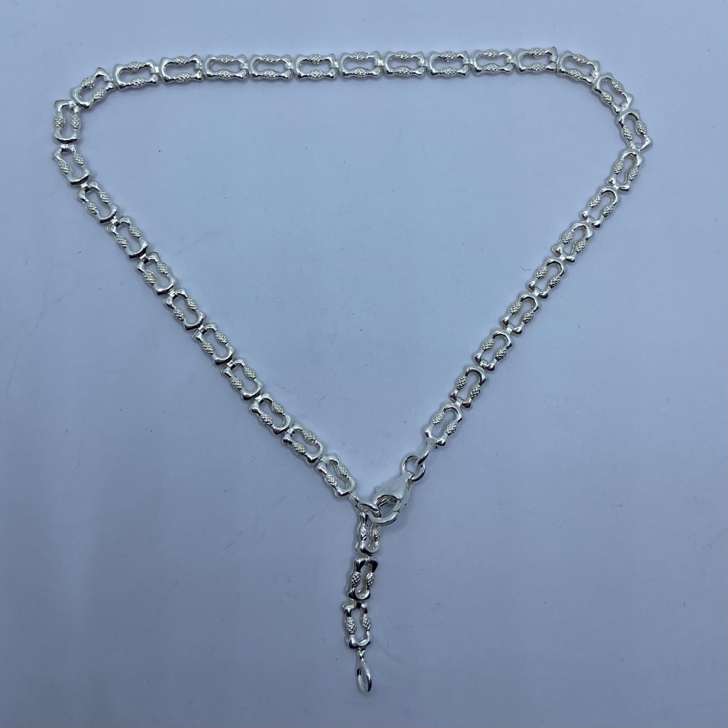 Lapos felületű,egyszerű mintás ezüst bokalánc fűzőtt,préselt szemekkel.