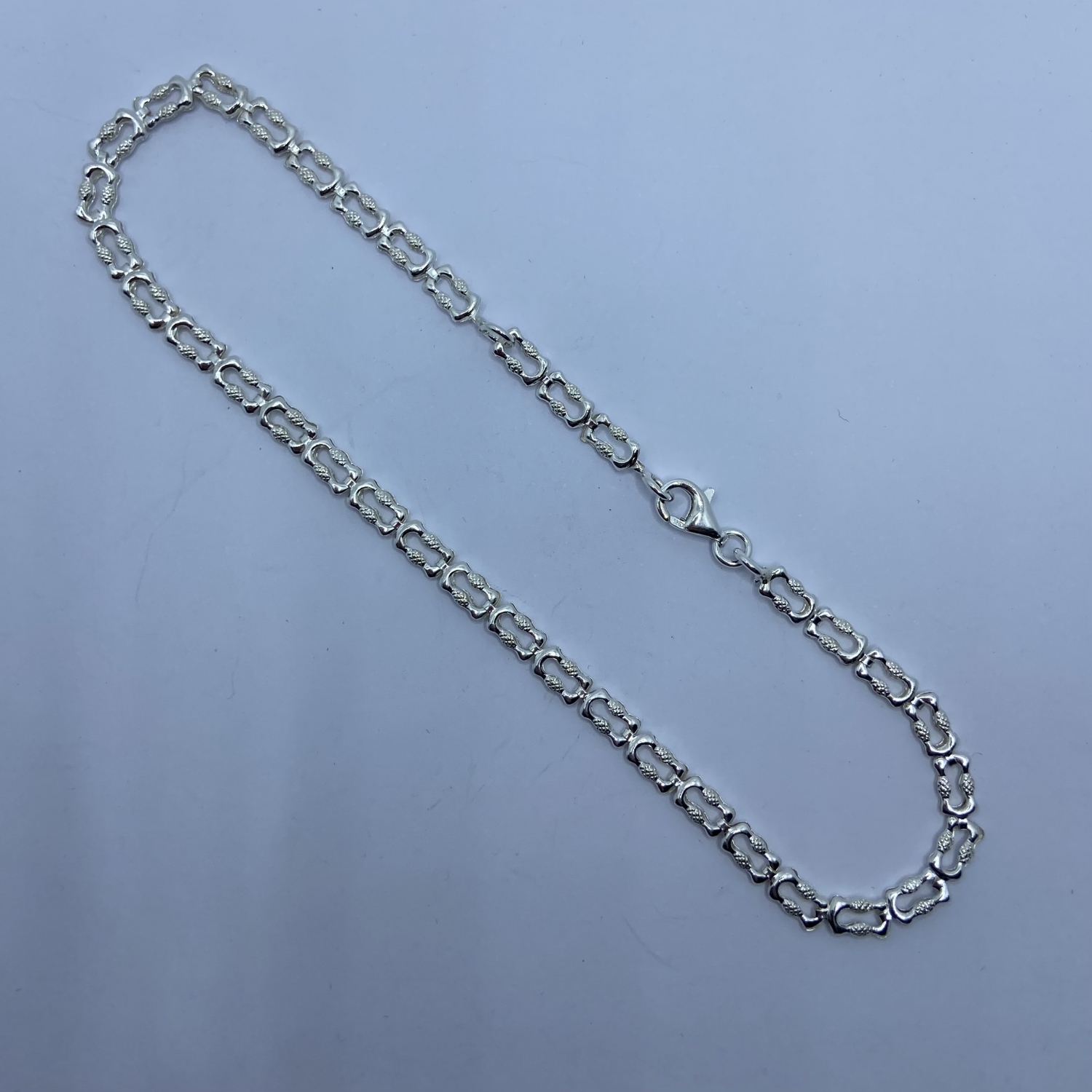 Lapos felületű,egyszerű mintás ezüst bokalánc fűzőtt,préselt szemekkel. Szélessége:3,8 mm Hossza:25 és 27 cm-re kapcsolható Súlya:3,48gramm
