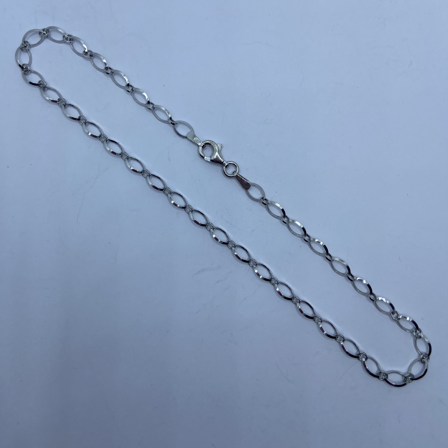 Lapos felületű ,ezüst bokalánc ,kicsi és nagy ovális alakú tömör szemekkel.