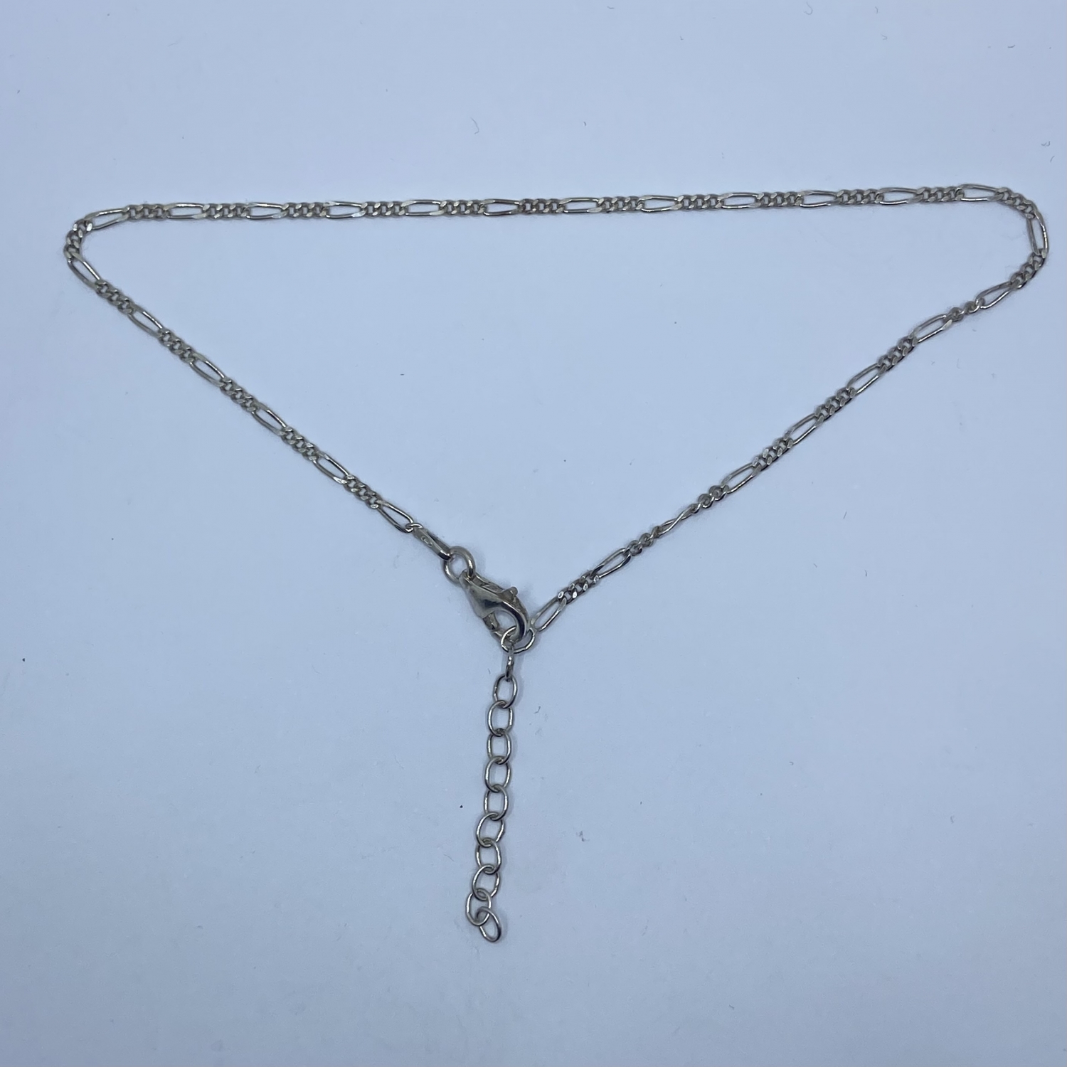 Tömör pancer szemes vékony,de erős ezüst bokalánc. Szélessége:1,5 mm Hossza:24 cm-től 26 cm-ig állítható Súlya:1,8 gramm