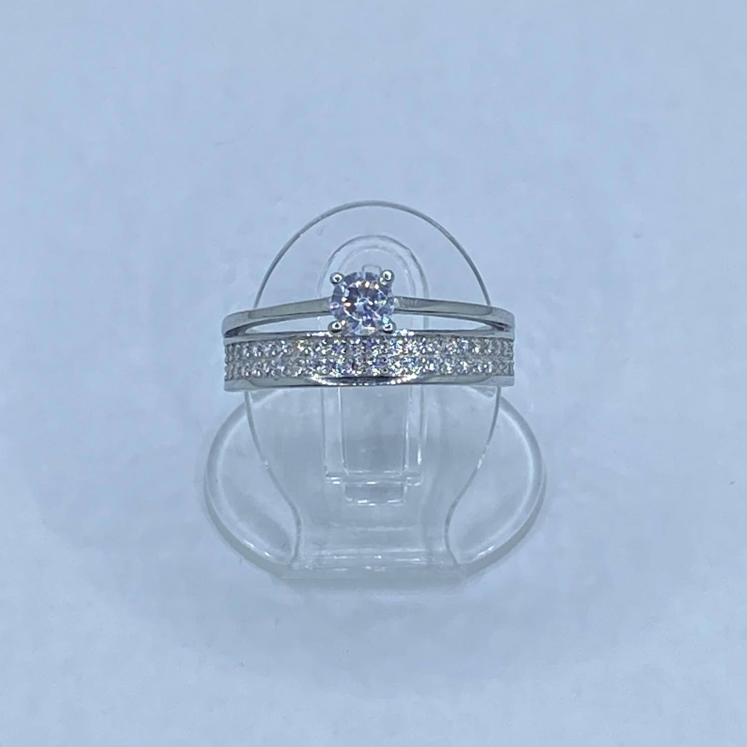 Ezüst dupla szoliter eljegyzési gyűrű rhódiumozott felülettel,foglalt cirkónia fehér kövekkel.