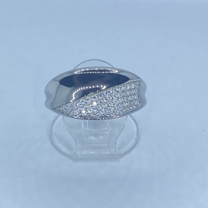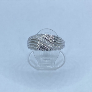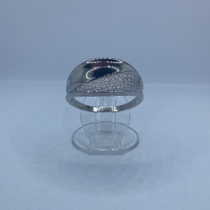 Széles fejű,homorú,átlósan fényes,átlósan fehér kövekkel díszített ezüst gyűrű,rhódiumozott felülettel. Legnagyobb szélessége:12,5 mm. Mérete:55 Súlya:4,89 gramm