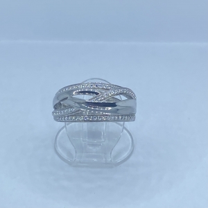 Modern mintás,robusztus ezüst gyűrű fényes,és fehér kövekkel kirakott szálak összefonódásával,rhódiumozott felülettel. Szélessége:10,8 mm Mérete:62 Súlya:4,89 gramm