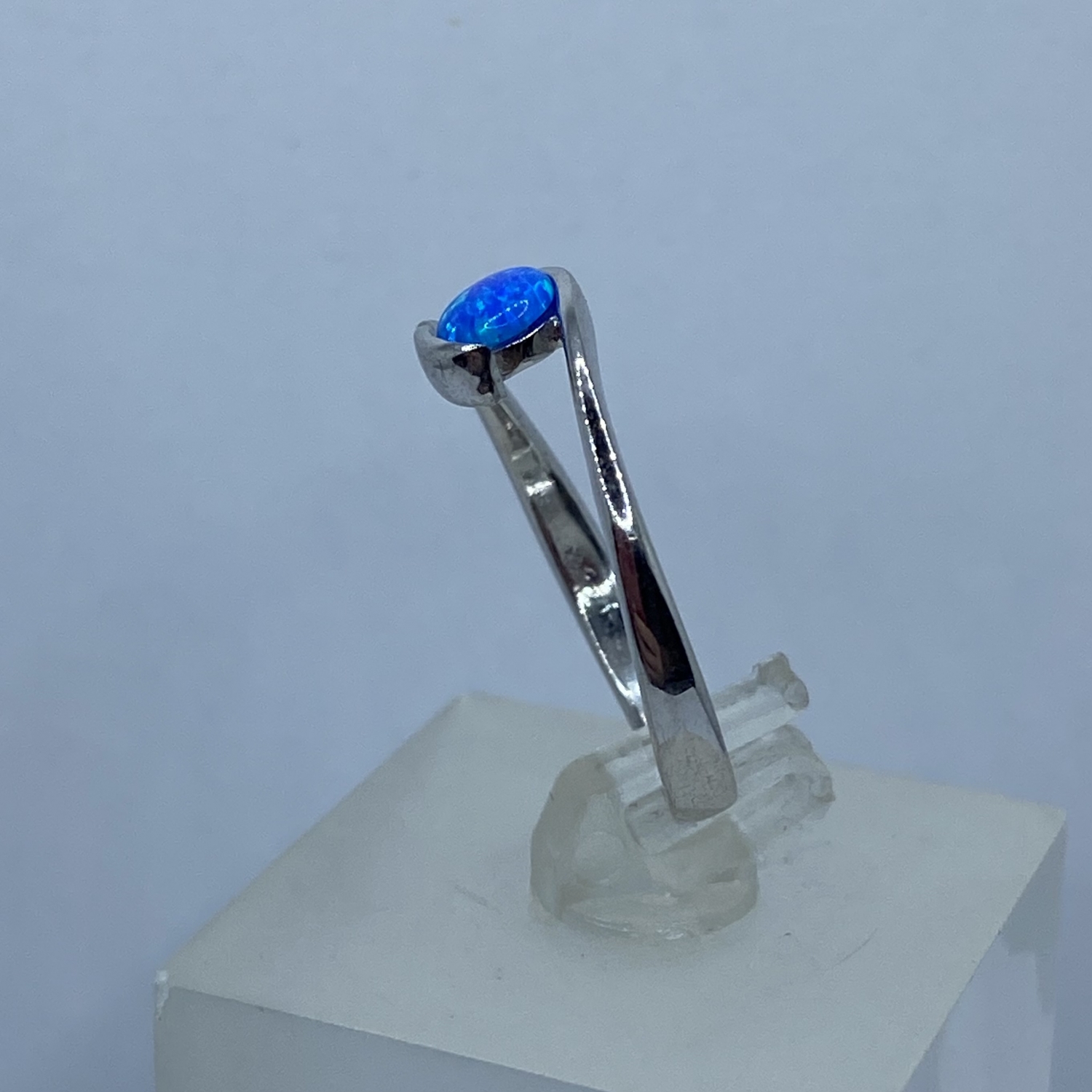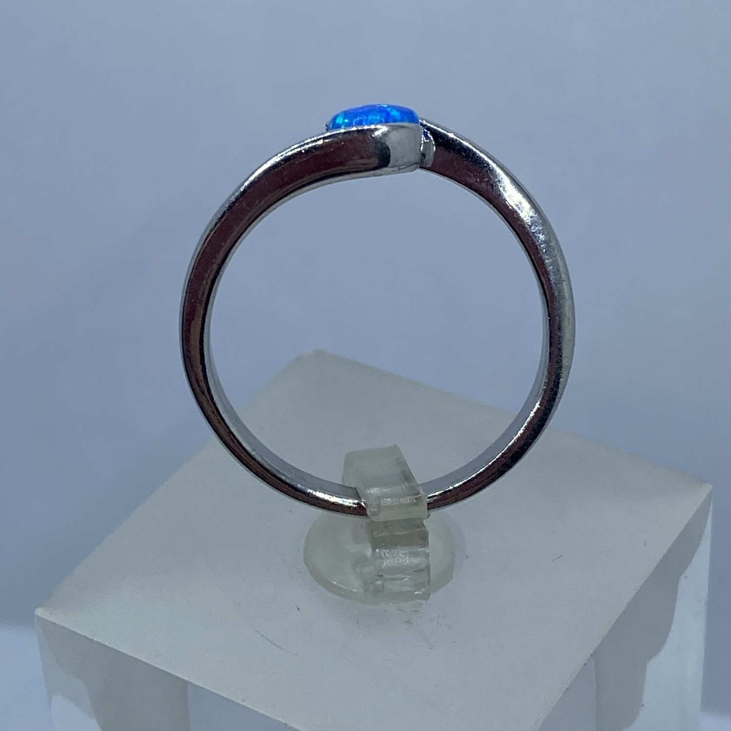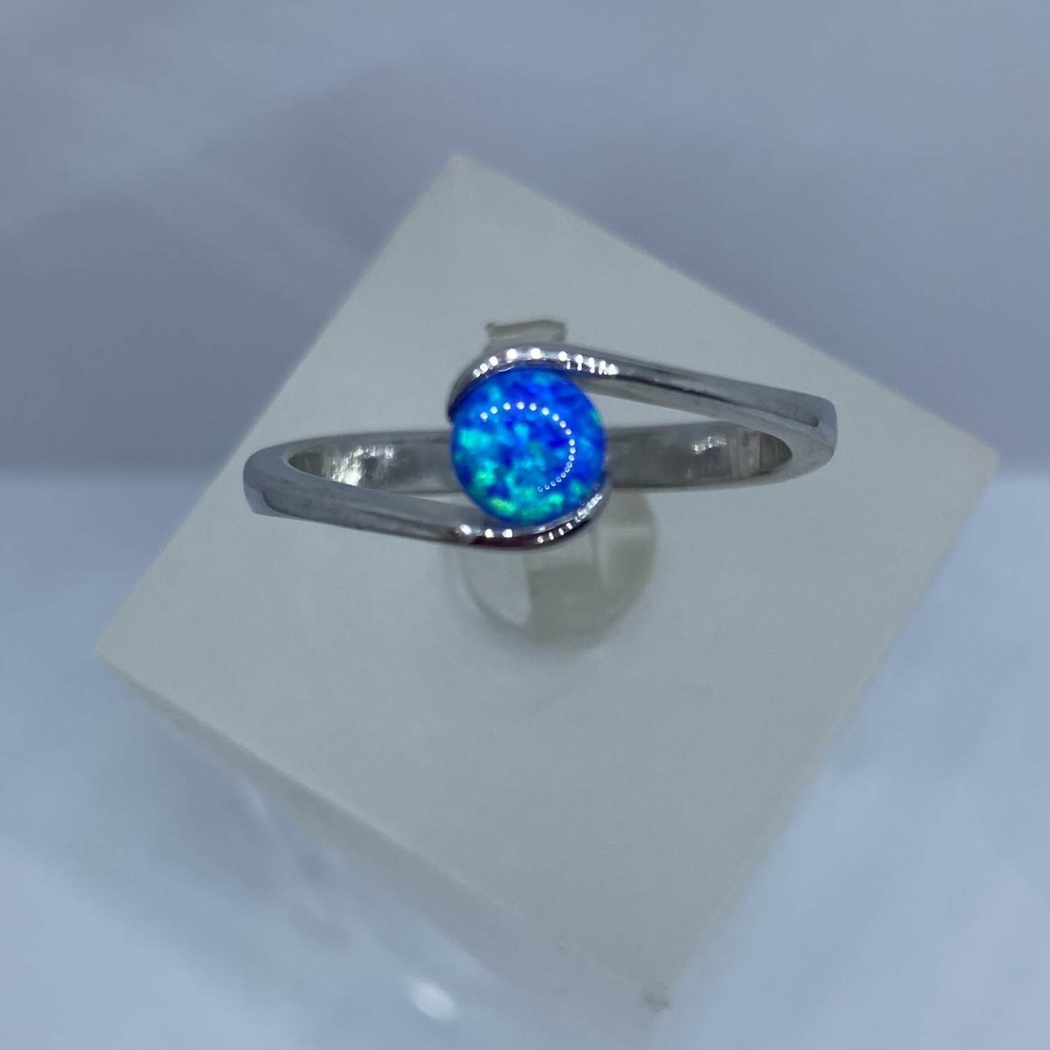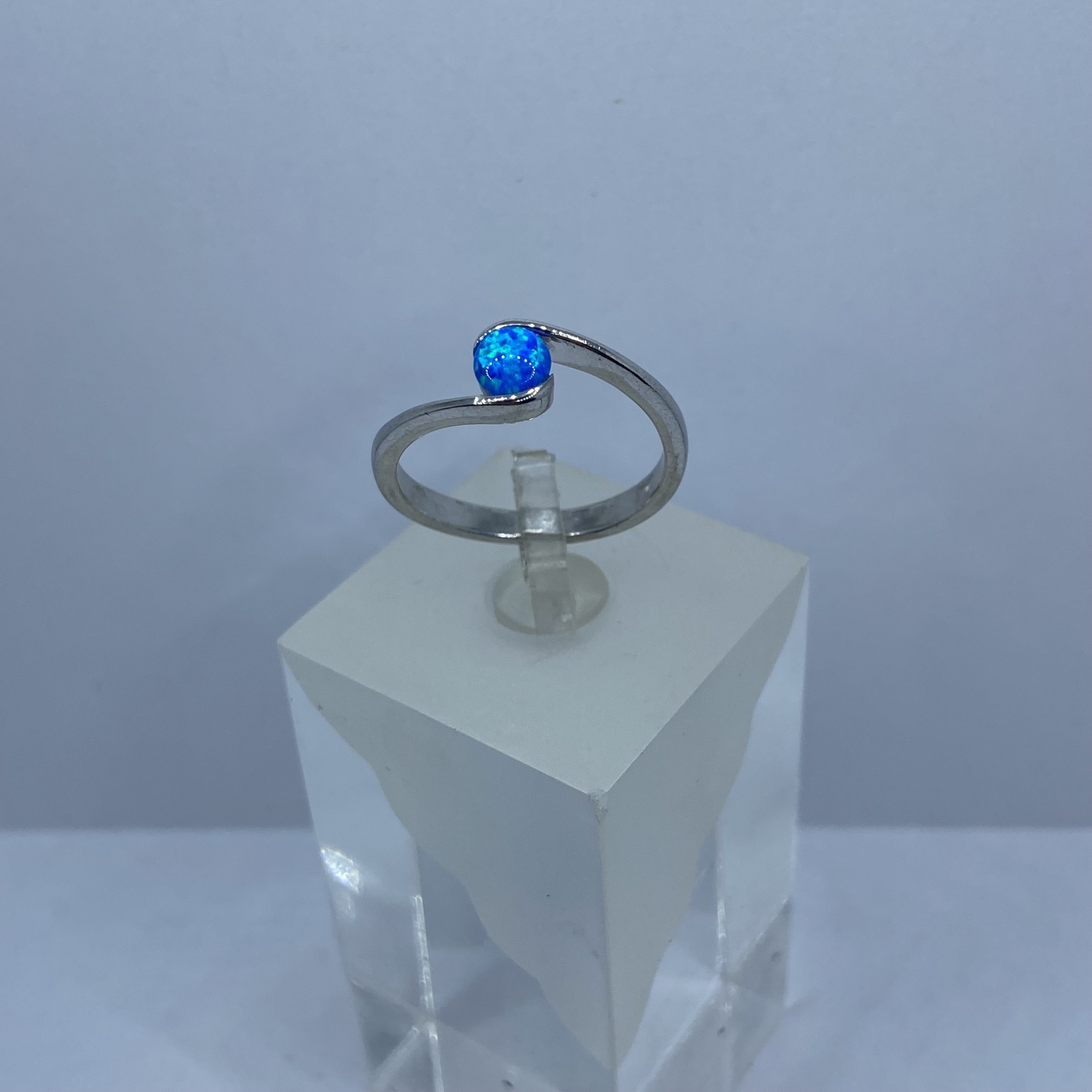 Ezüst gyűrű félgömb alakú szintetikus kék opál kővel,rhódiumozott felülettel.