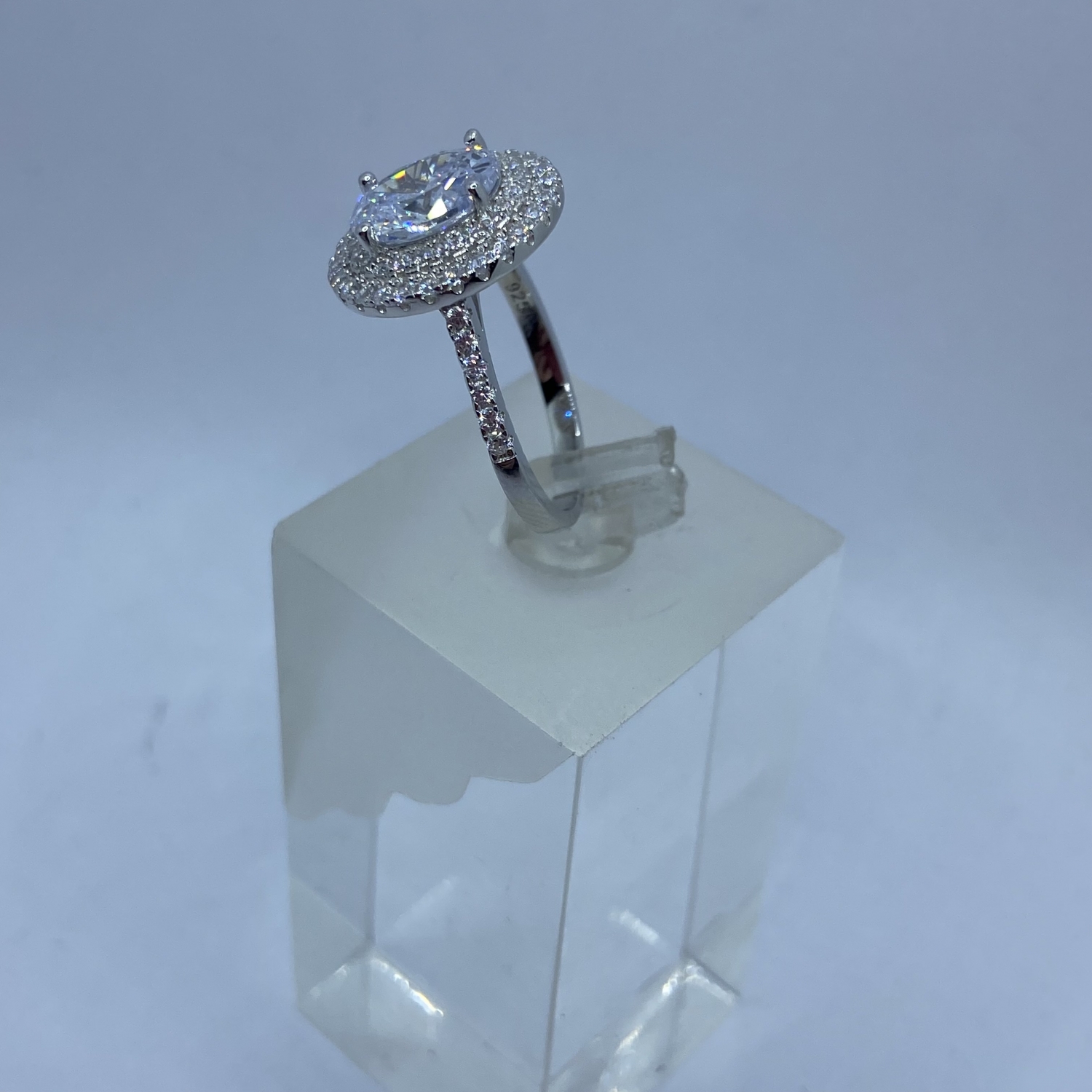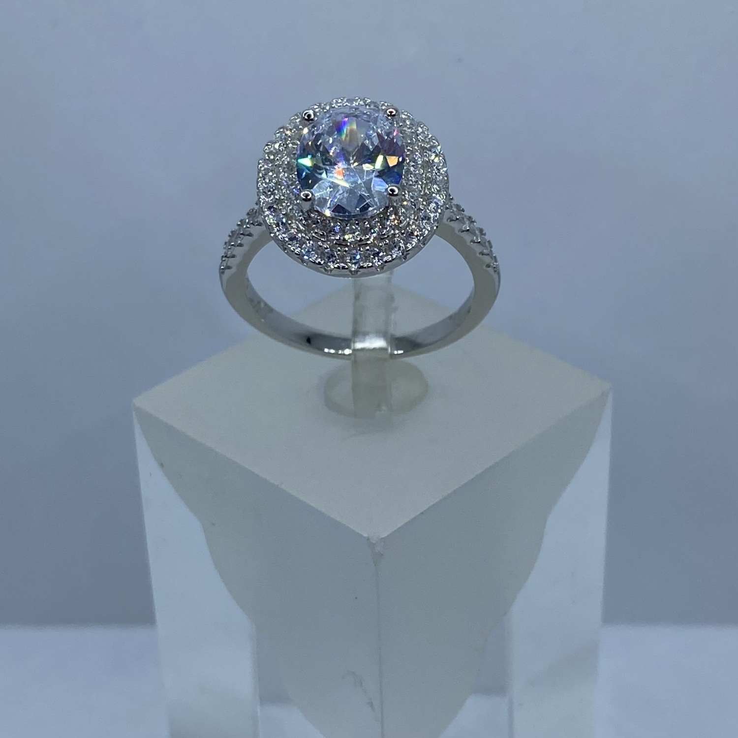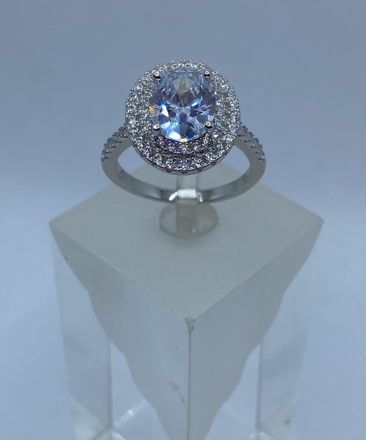 Ezüst gyűrű egy darab nagy méretű,és sok kis méretű fehér csiszolt kristály kővel,rhódiumozott felülettel.