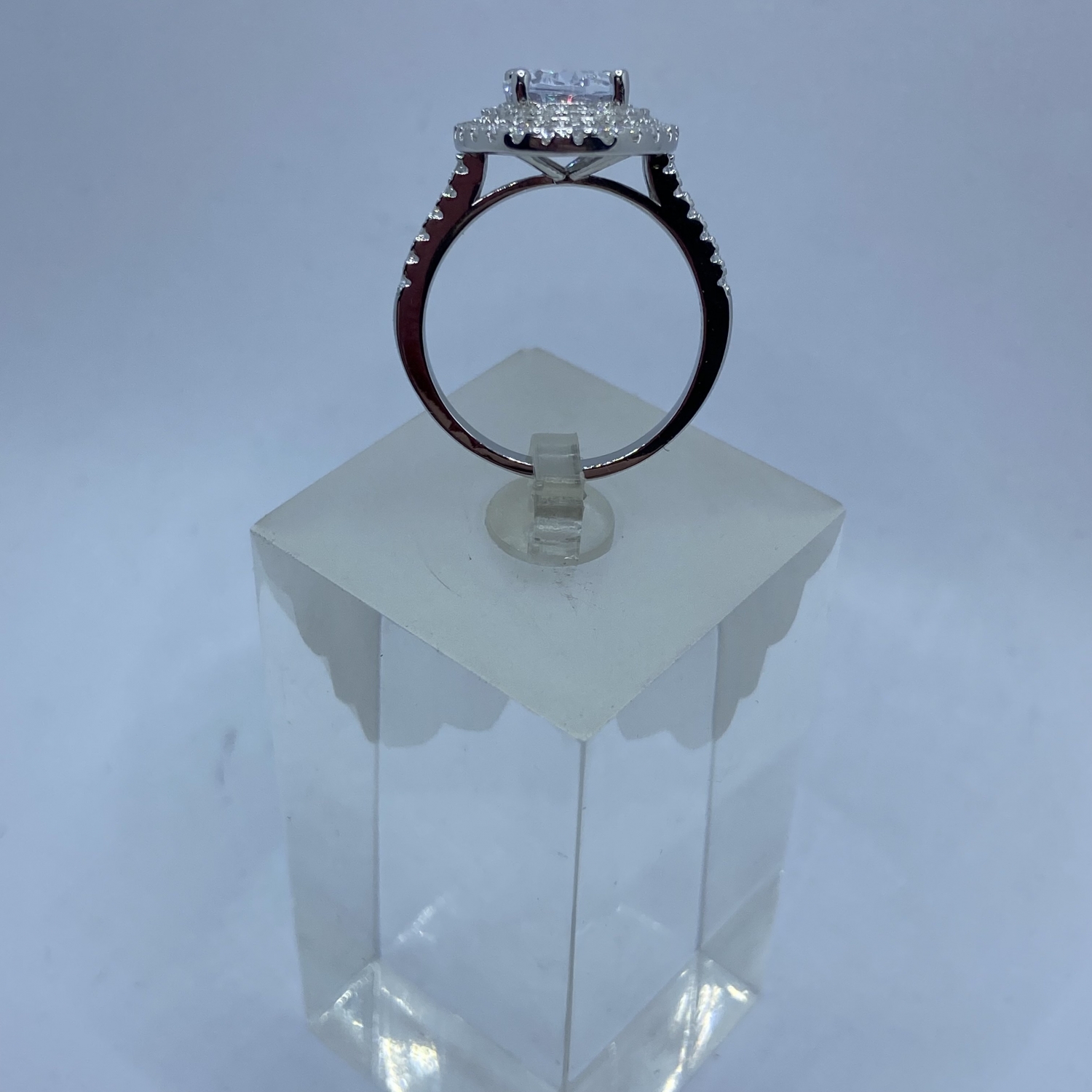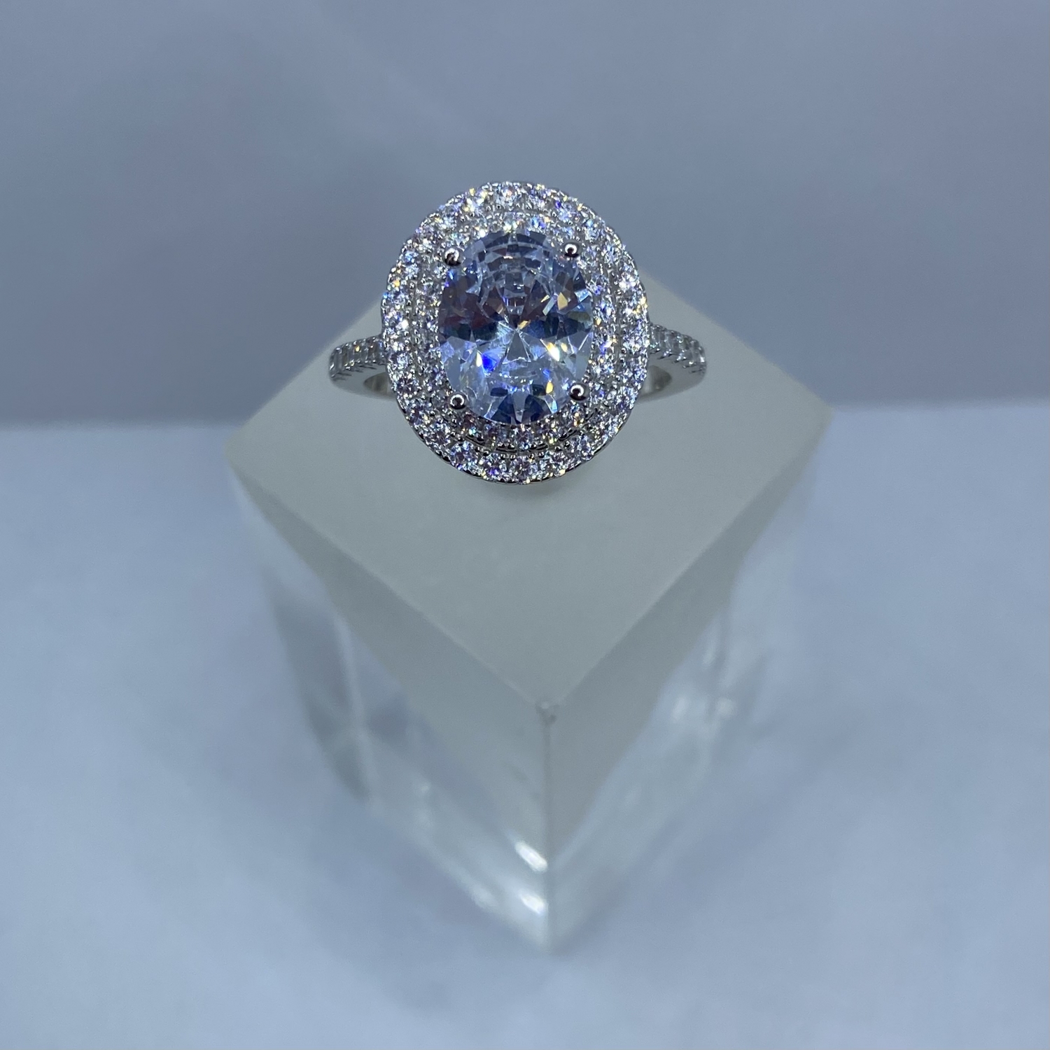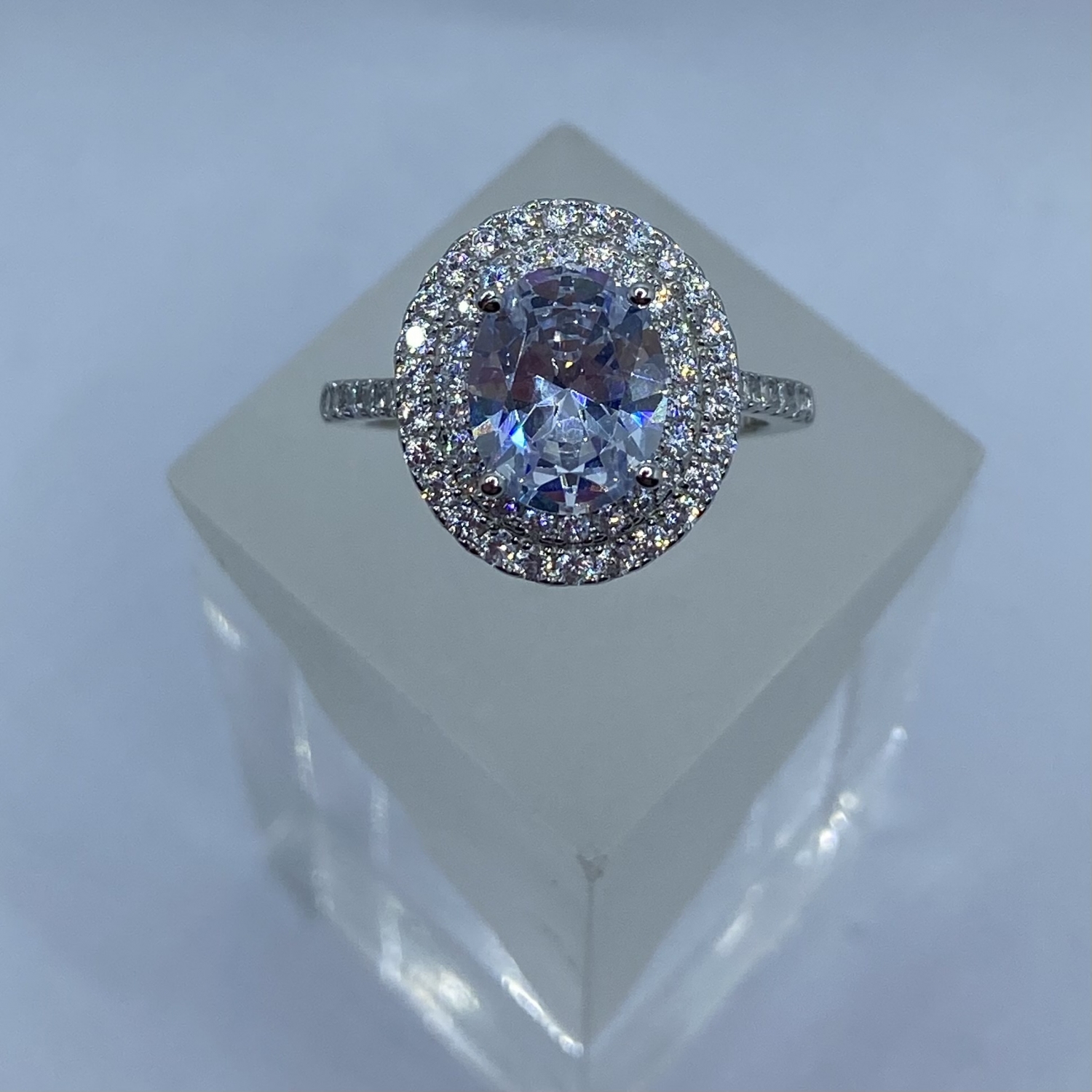 Ezüst gyűrű egy darab nagy méretű,és sok kis méretű fehér csiszolt kristály kővel,rhódiumozott felülettel.