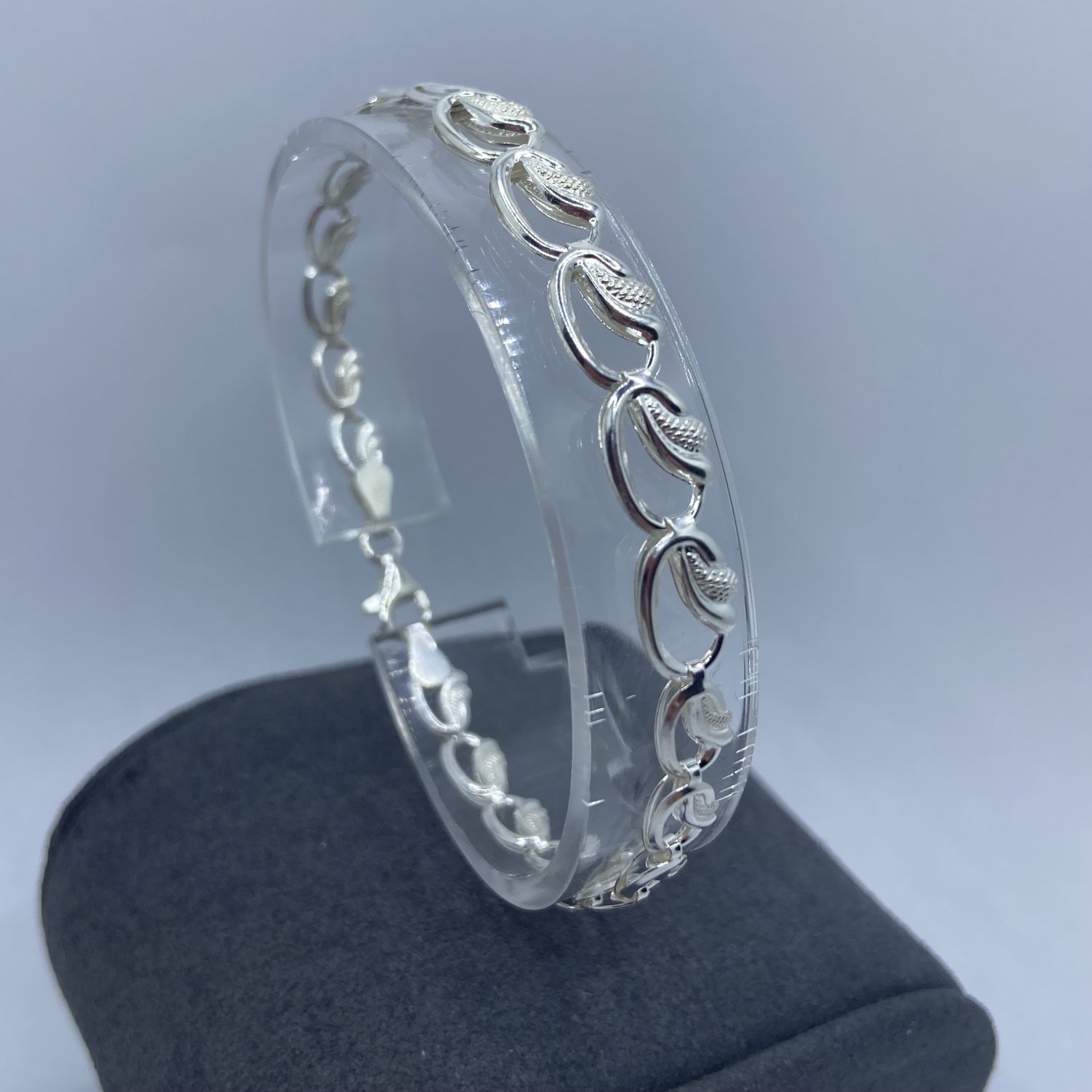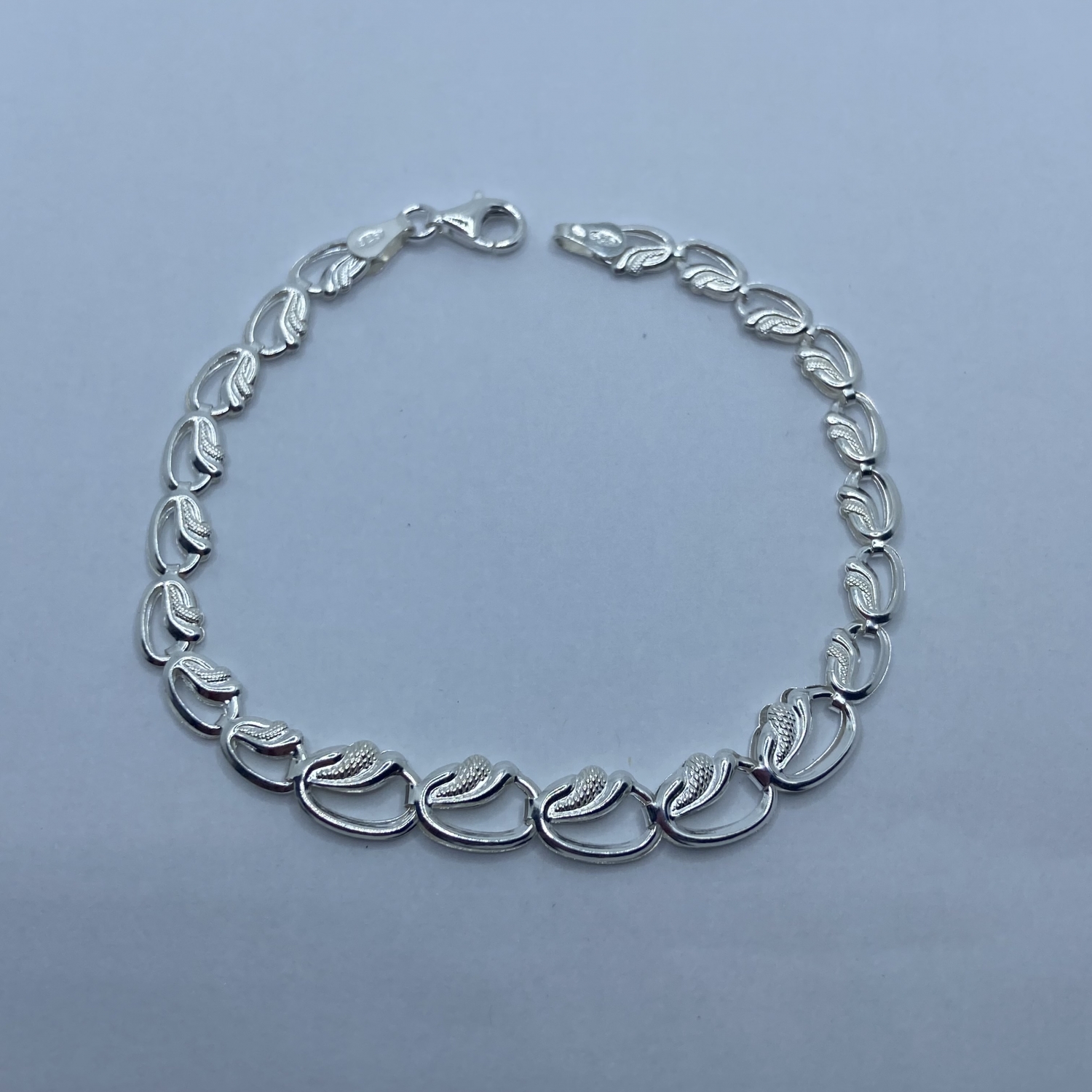 Ezüst karlánc középen vastagodó leveles szemekkel. A legszélesebb mérete:7,0 mm A keskenyebb rész mérete:5,0 mm Súlya:3,1 gramm