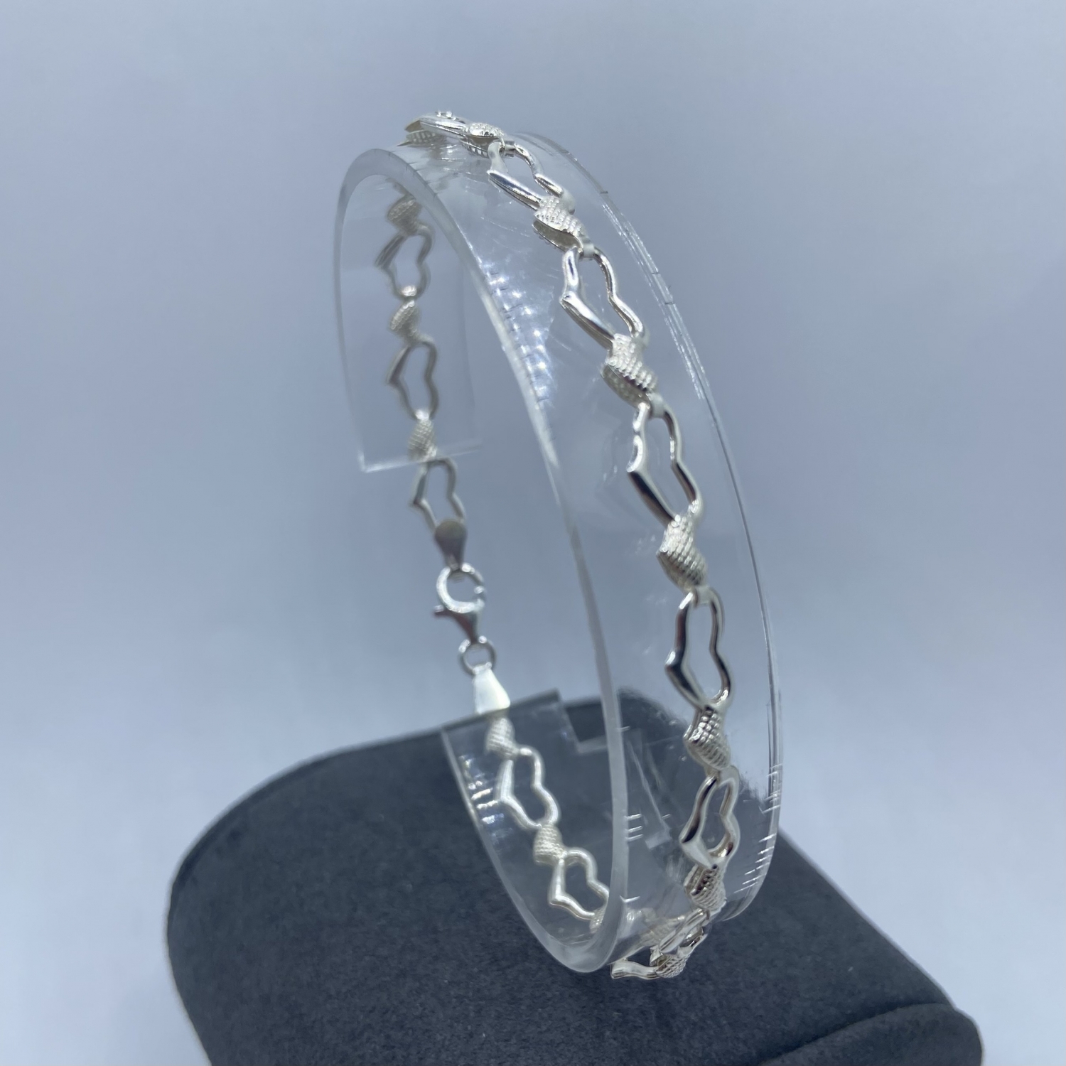 Ezüst karlánc szivecskés fűzőtt szemekből. Szélessége:5,7 mm Hossza:20 cm Súlya:2,8 gramm