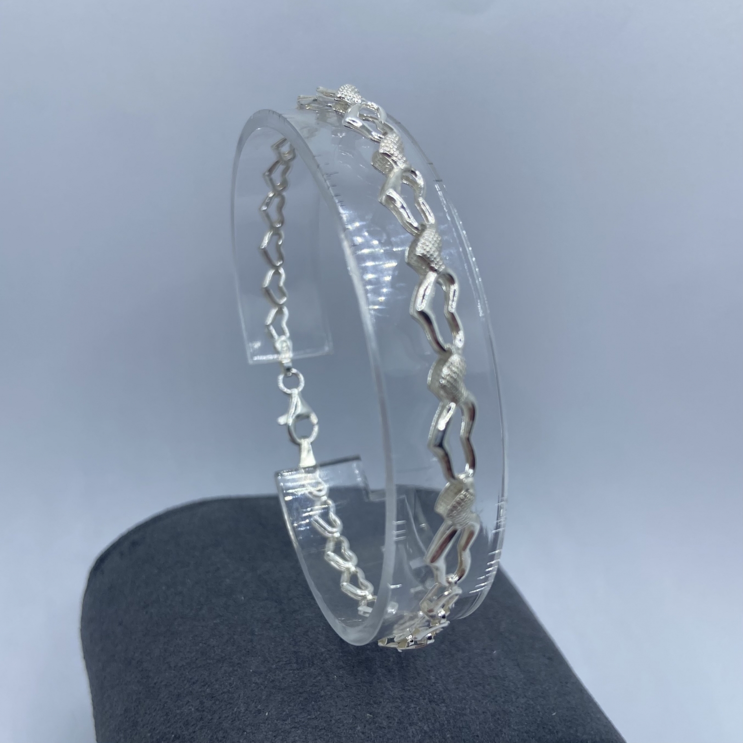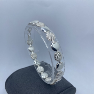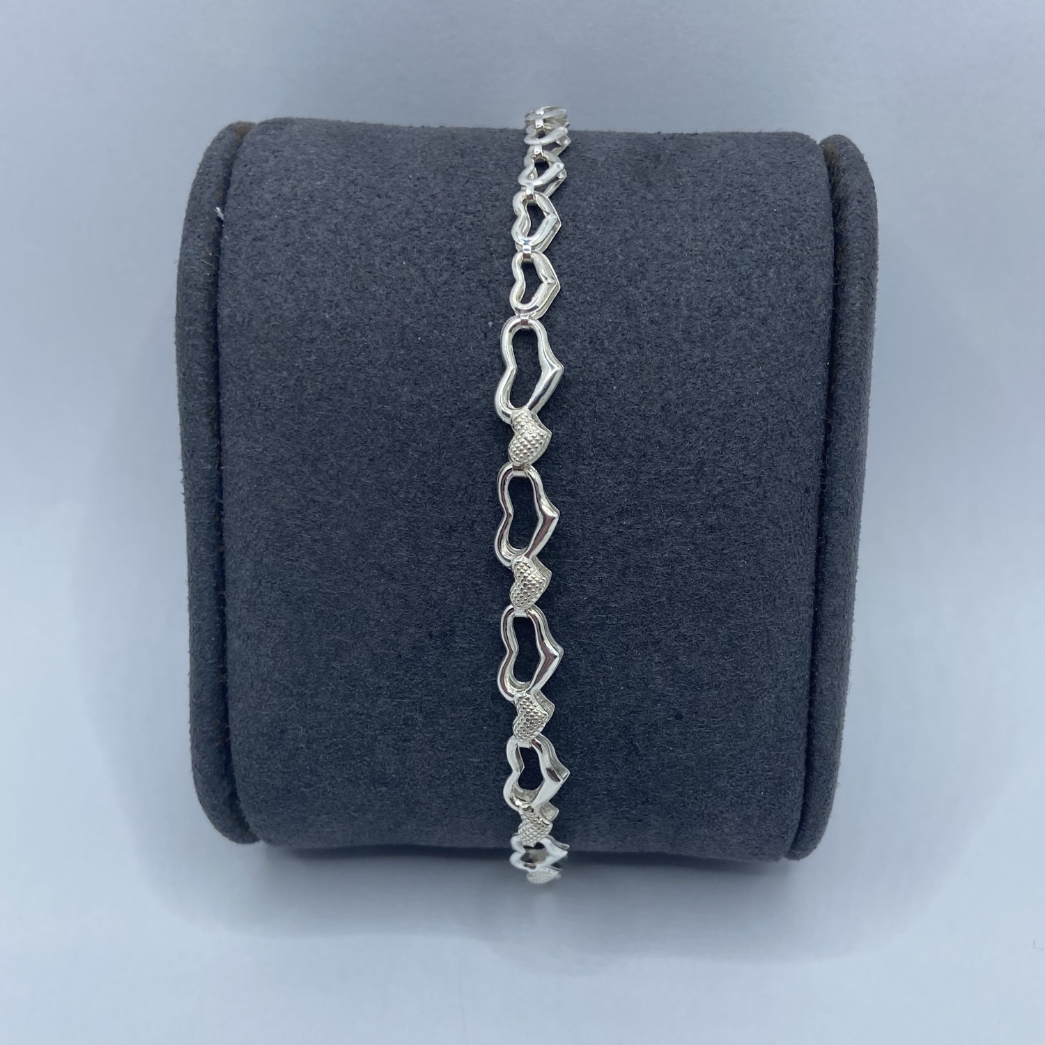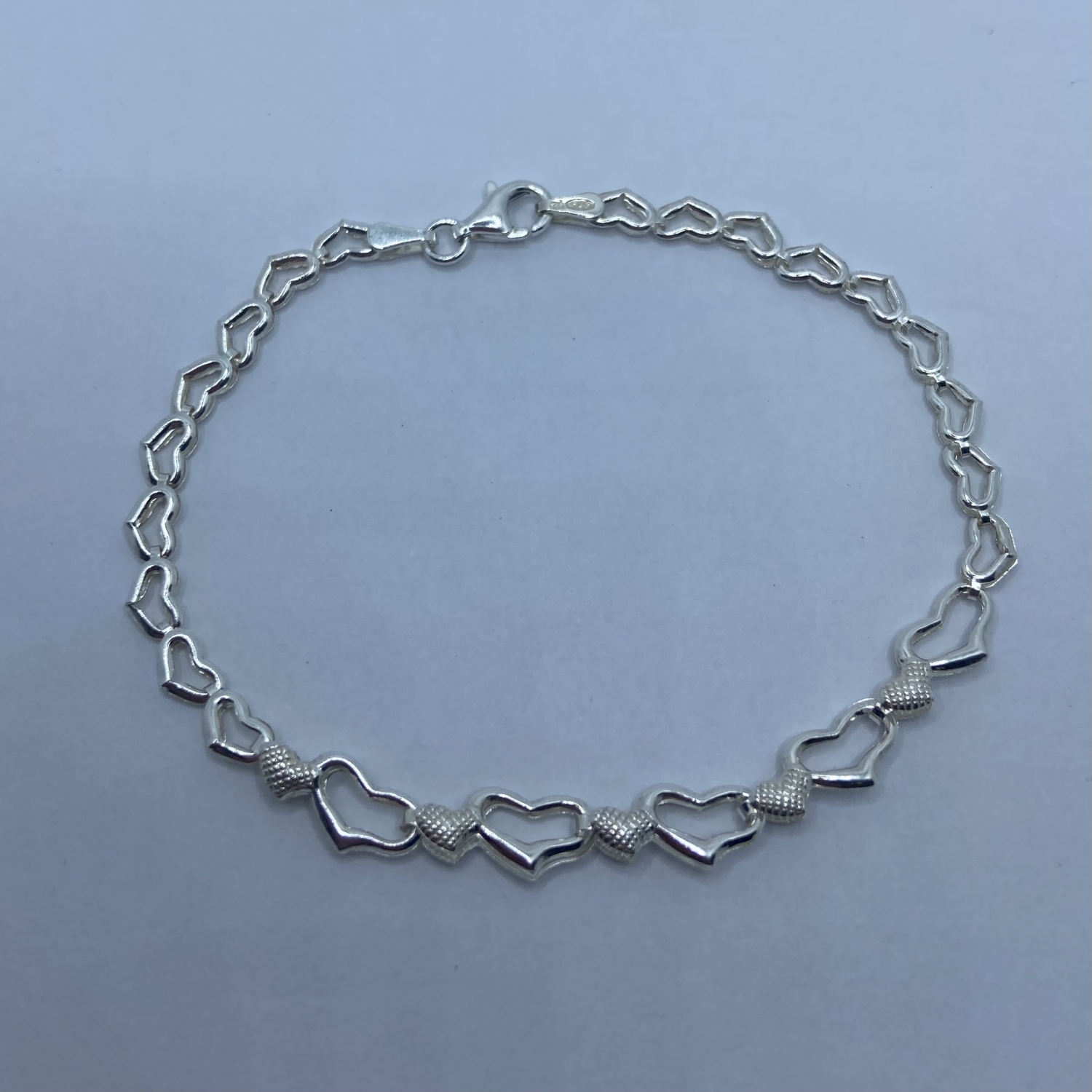 Ezüst karlánc középen vastagodó szív formájú,fűzött szemekből.