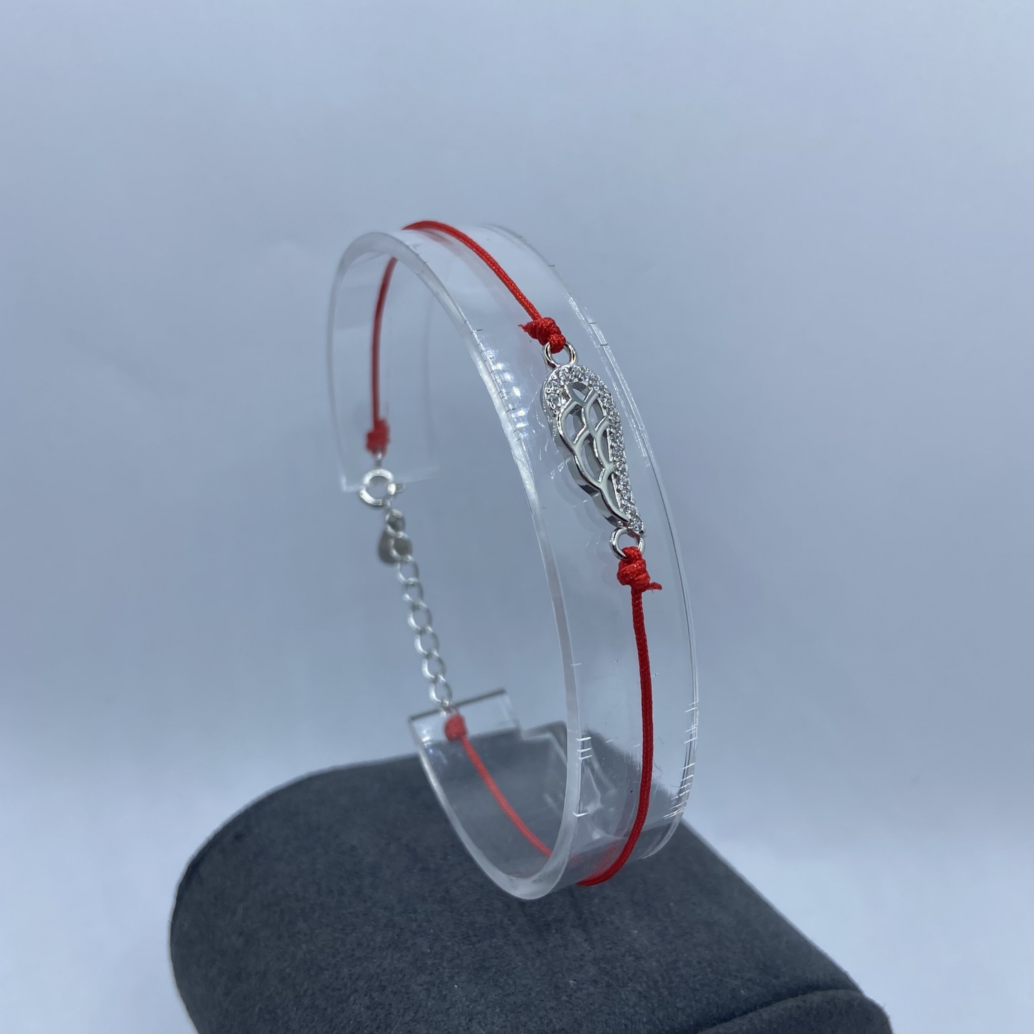 Piros zsinóros karkötő,kövekkel kirakott,áttört ezüst angyalszárnnyal.