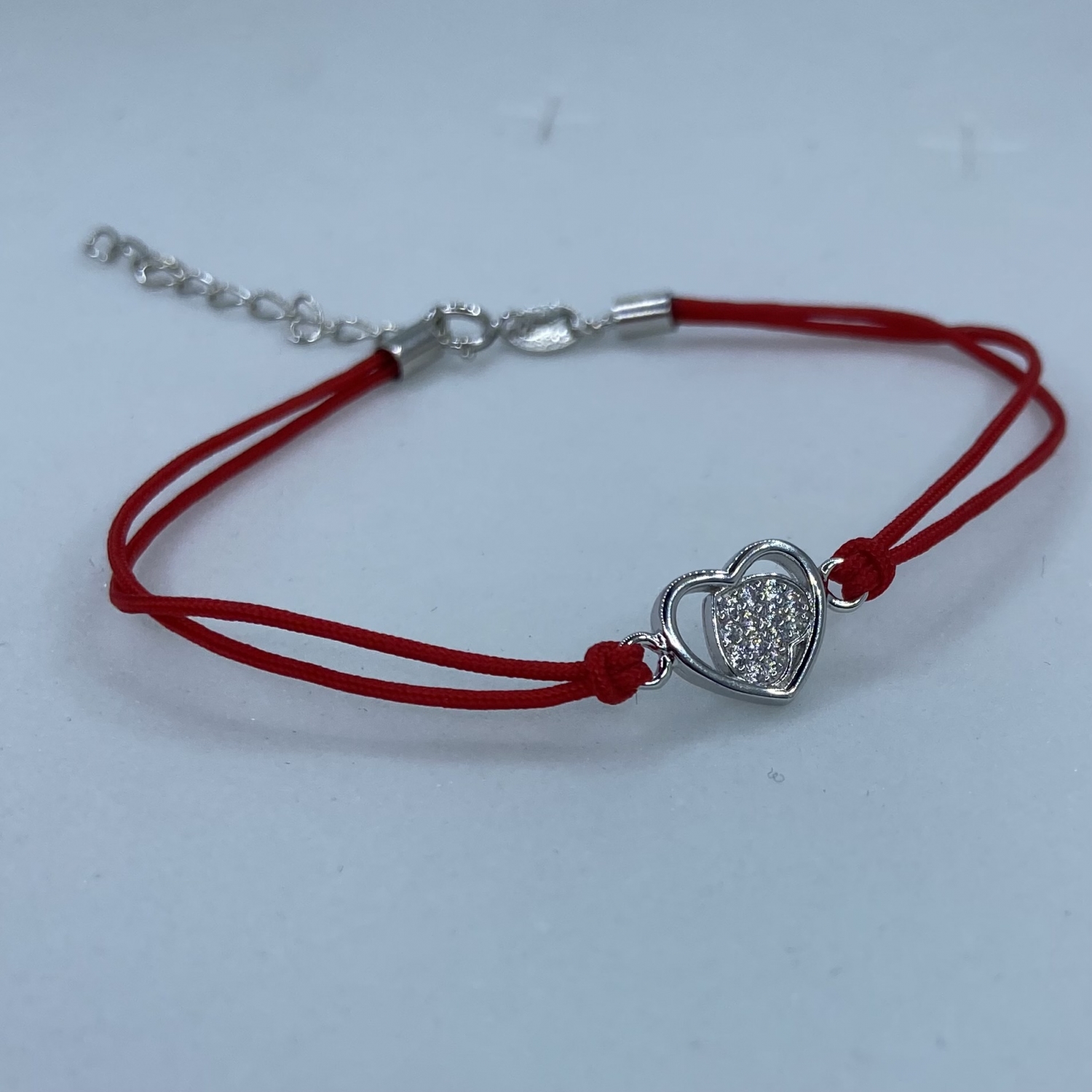 Piros zsinóros karkötő egy fényes,és egy feher kövekkel kirakott szív összefonódásával. Legszélesebb mérete:11,1 mm Hossza 17 és 20 cm között tetszőlegesen állítható.