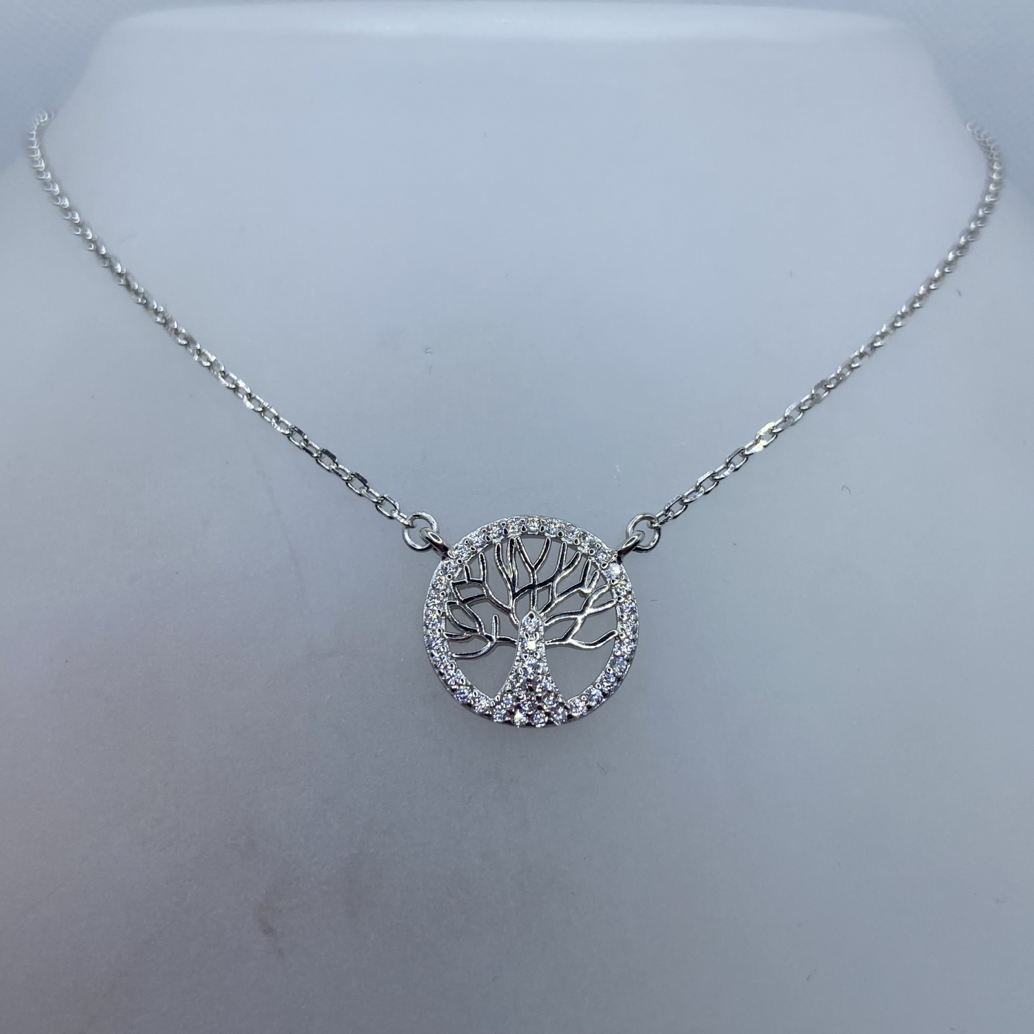 Tömör,vékony,de erős anker lánc fehér kövekkel díszített életfa medállal,rhódiumozott felülettel.