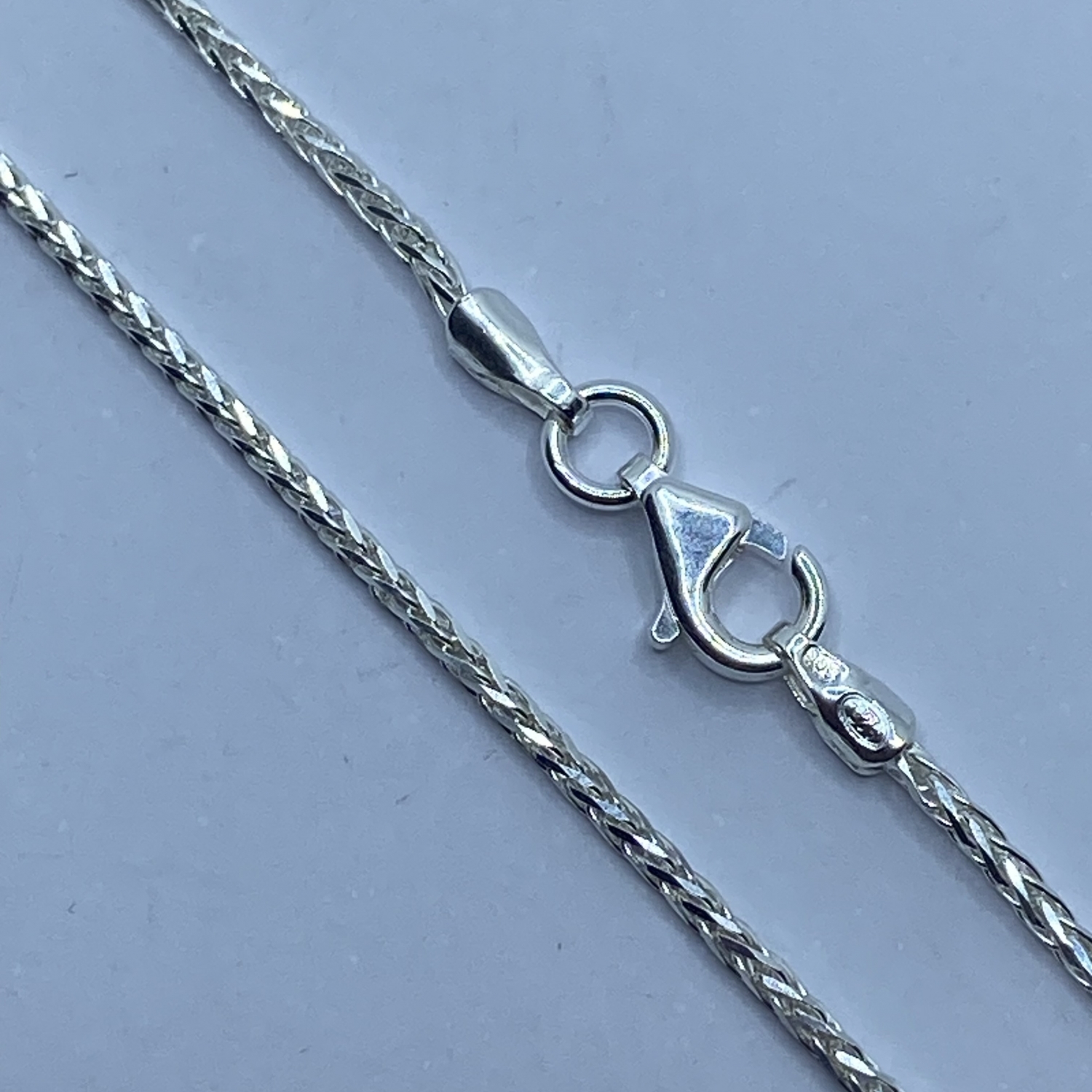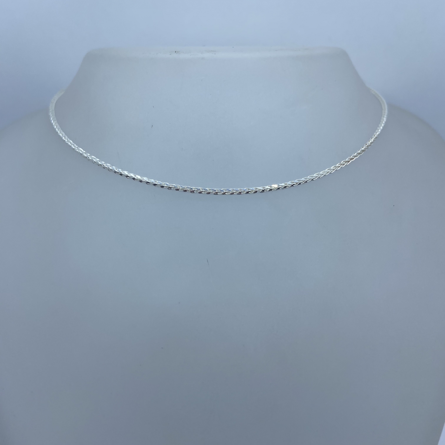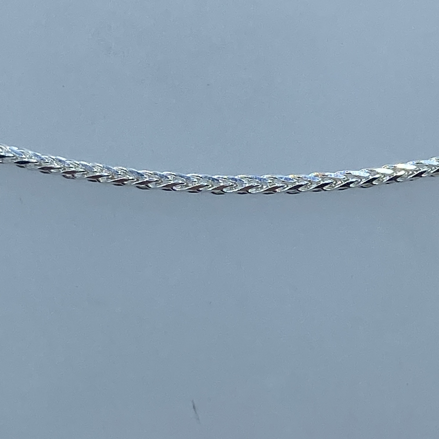 Tömör,fonott szemekből álló,hengeres fazonú ezüst lánc. Átmérője:1,2 mm,hossza:50 cm.