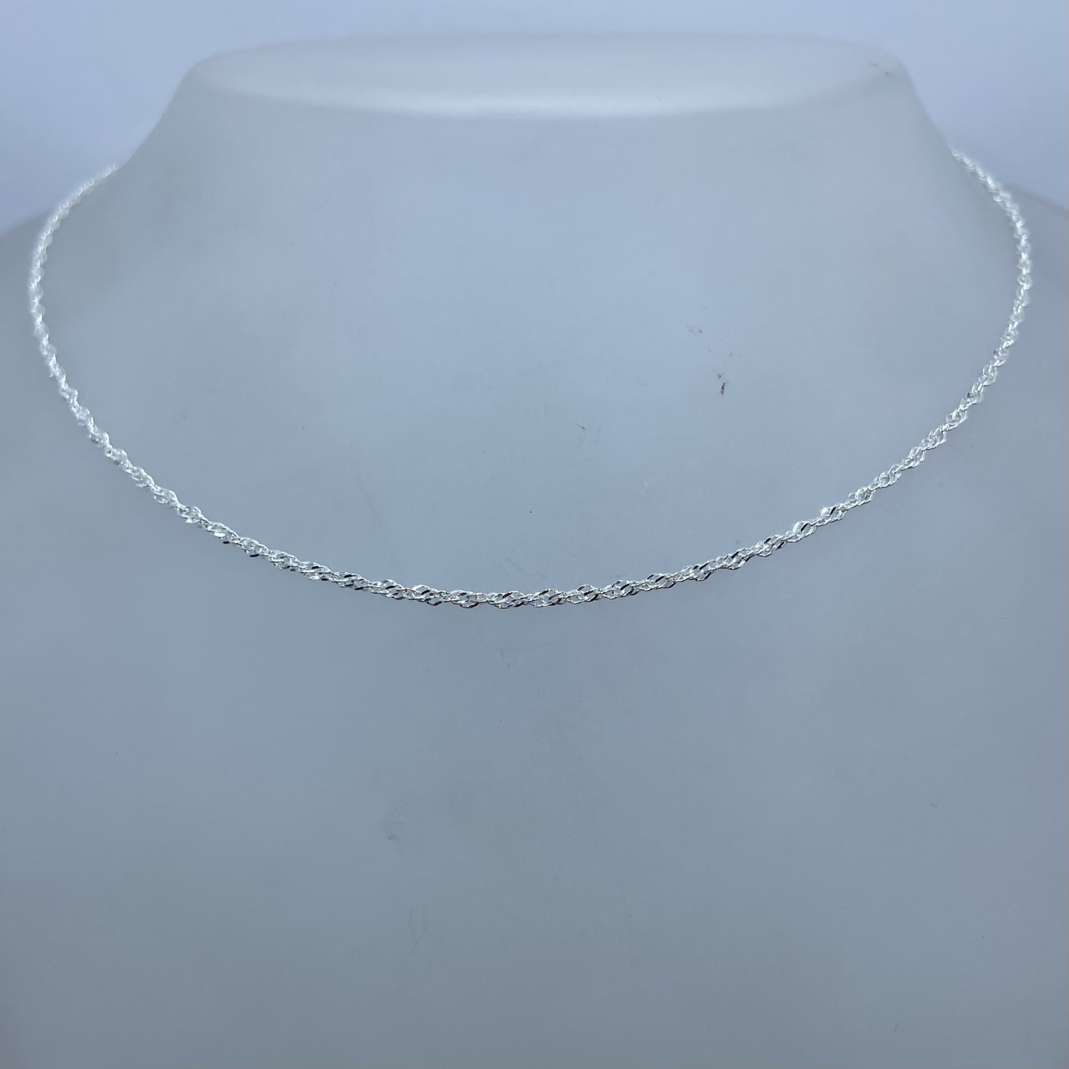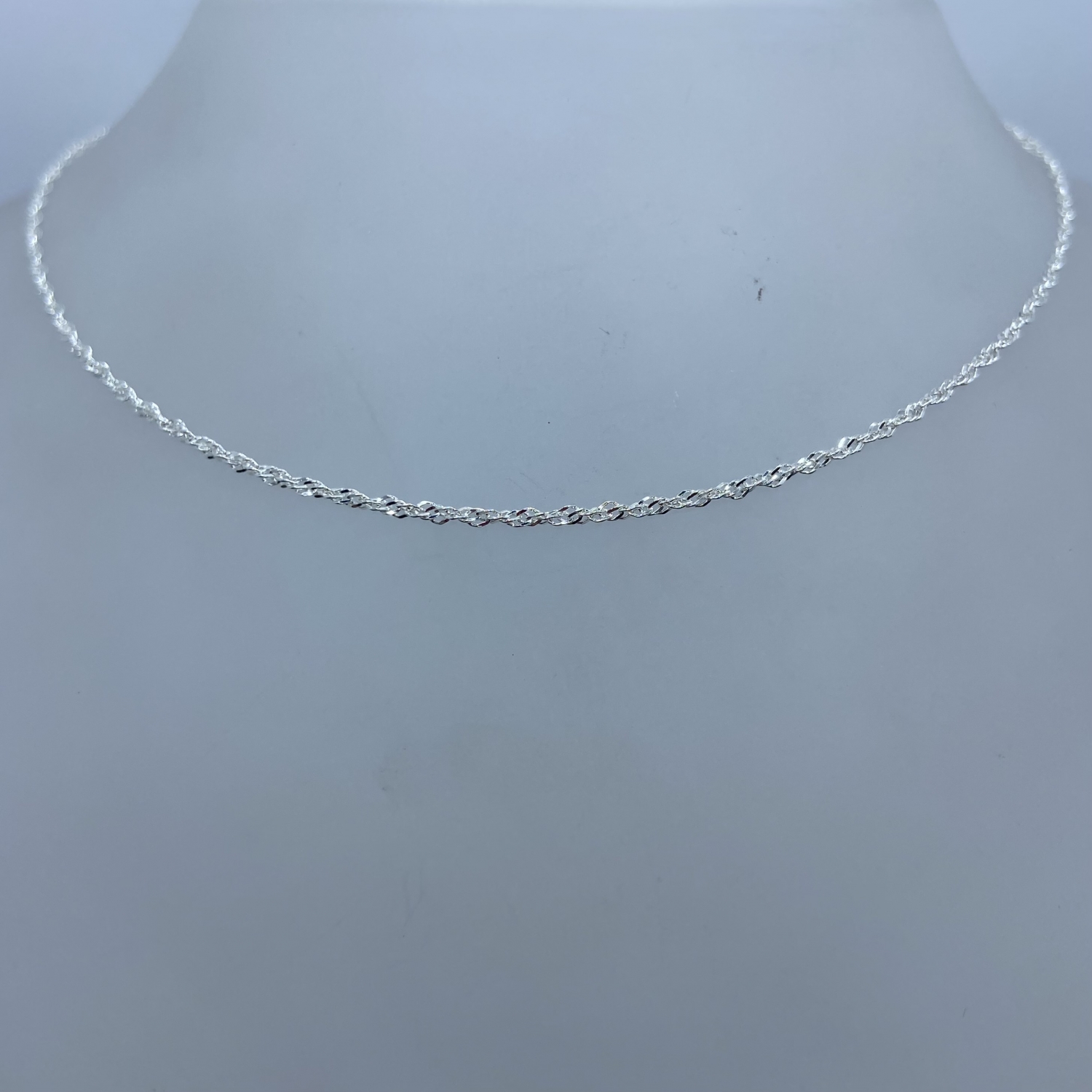 Tömör,vékony szingapúri csavart ezüst lánc. Vastagsága:1,3 mm,hossza 45 cm.