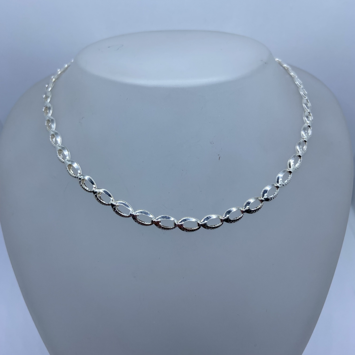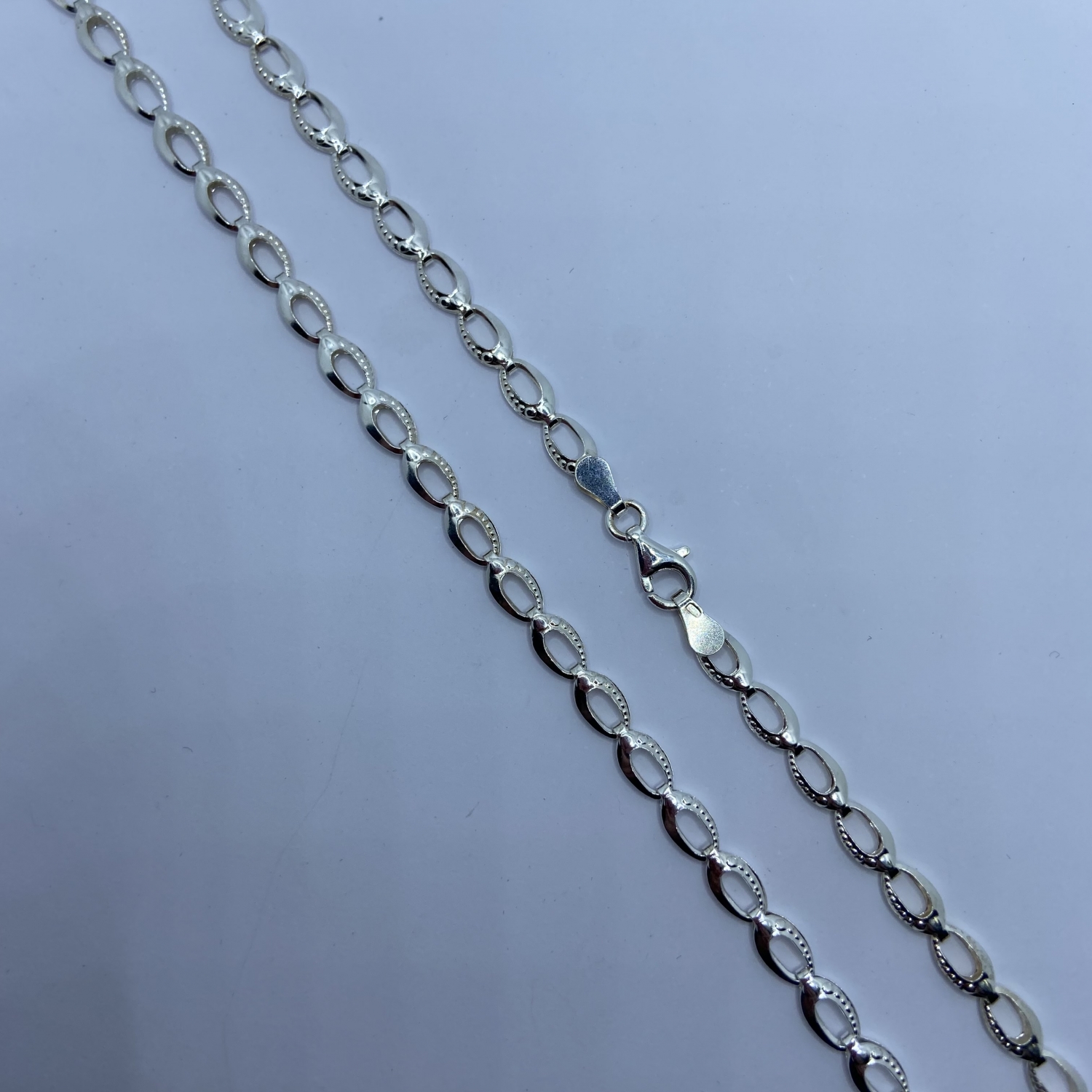 Ezüst lánc ovális fűzött szemekből. Szélessége:4,2 mm Hossza:45 cm Súlya:5,05gramm