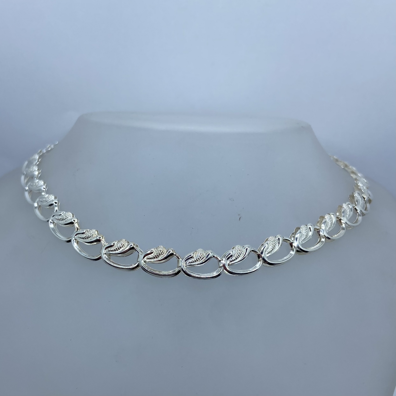 Ezüst lánc,középen vastagodó leveles mintájú,fűzött szemekből.