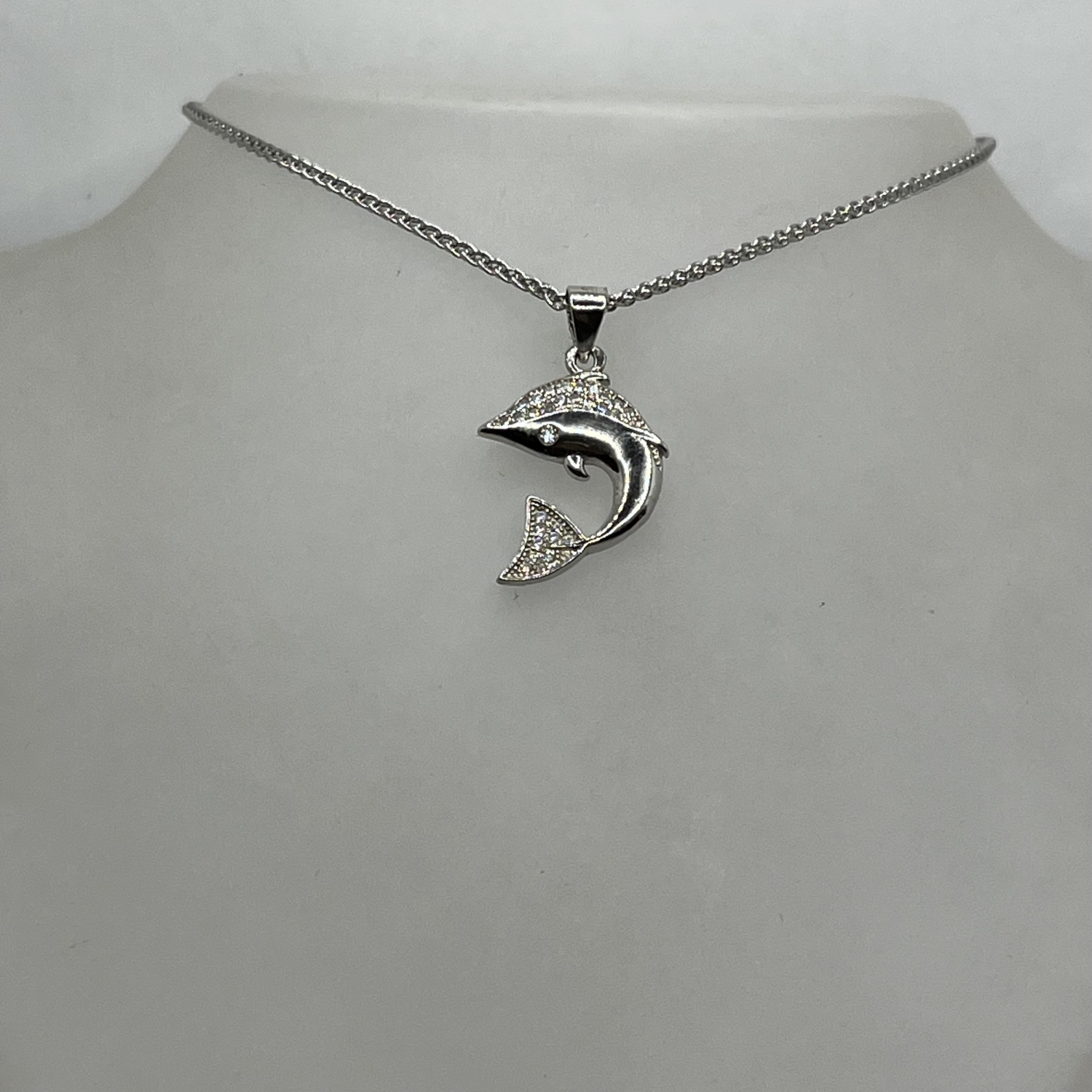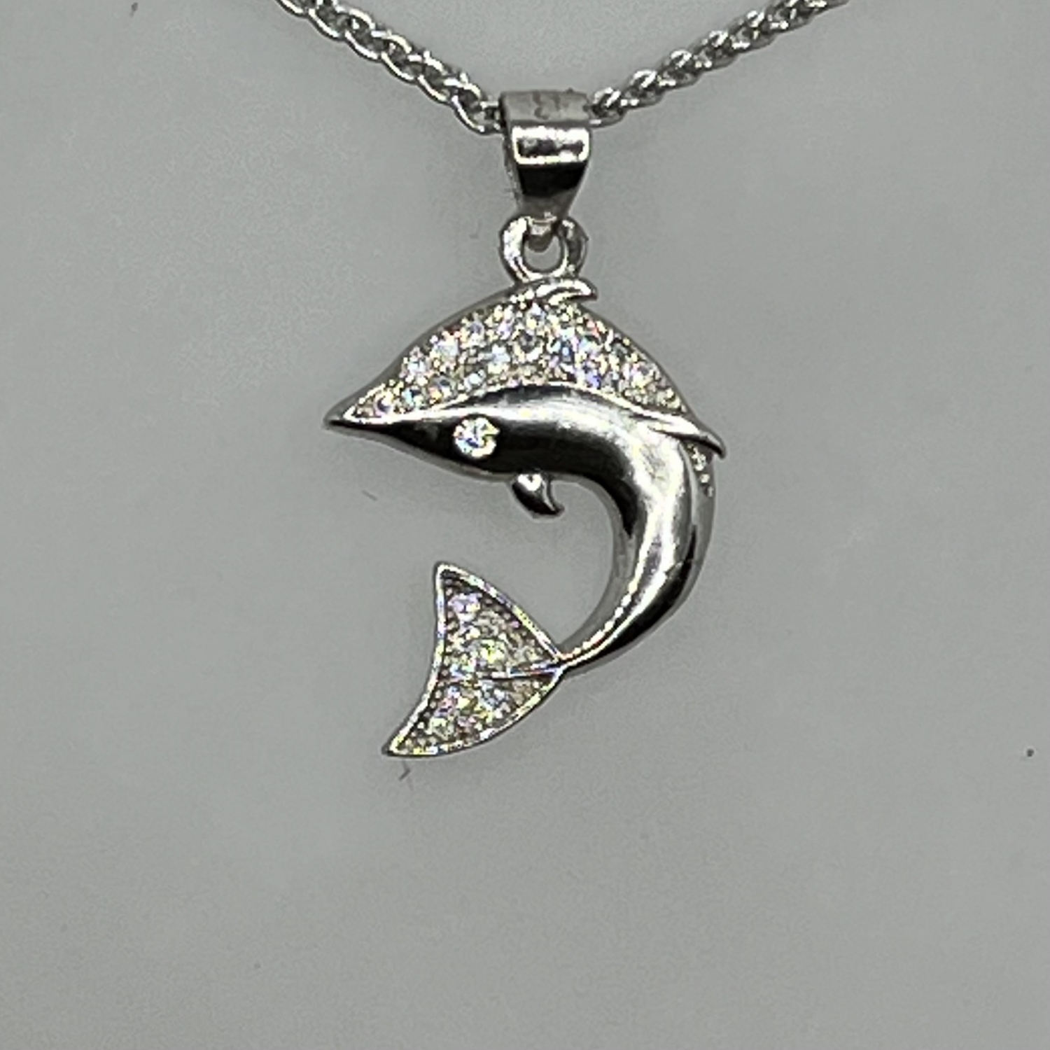 Kardszárnyú delfin formájú ezüst medál,fehér cirkónia kristályokkal foglalva,rhodiumozott felülettel.