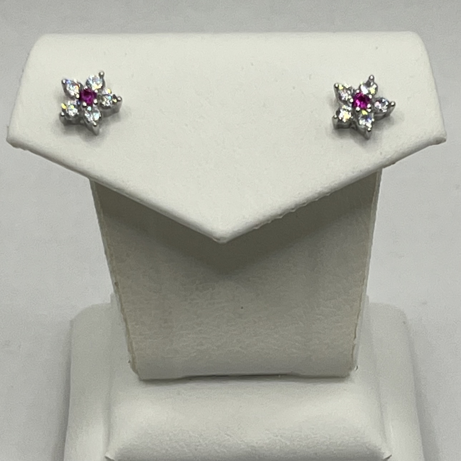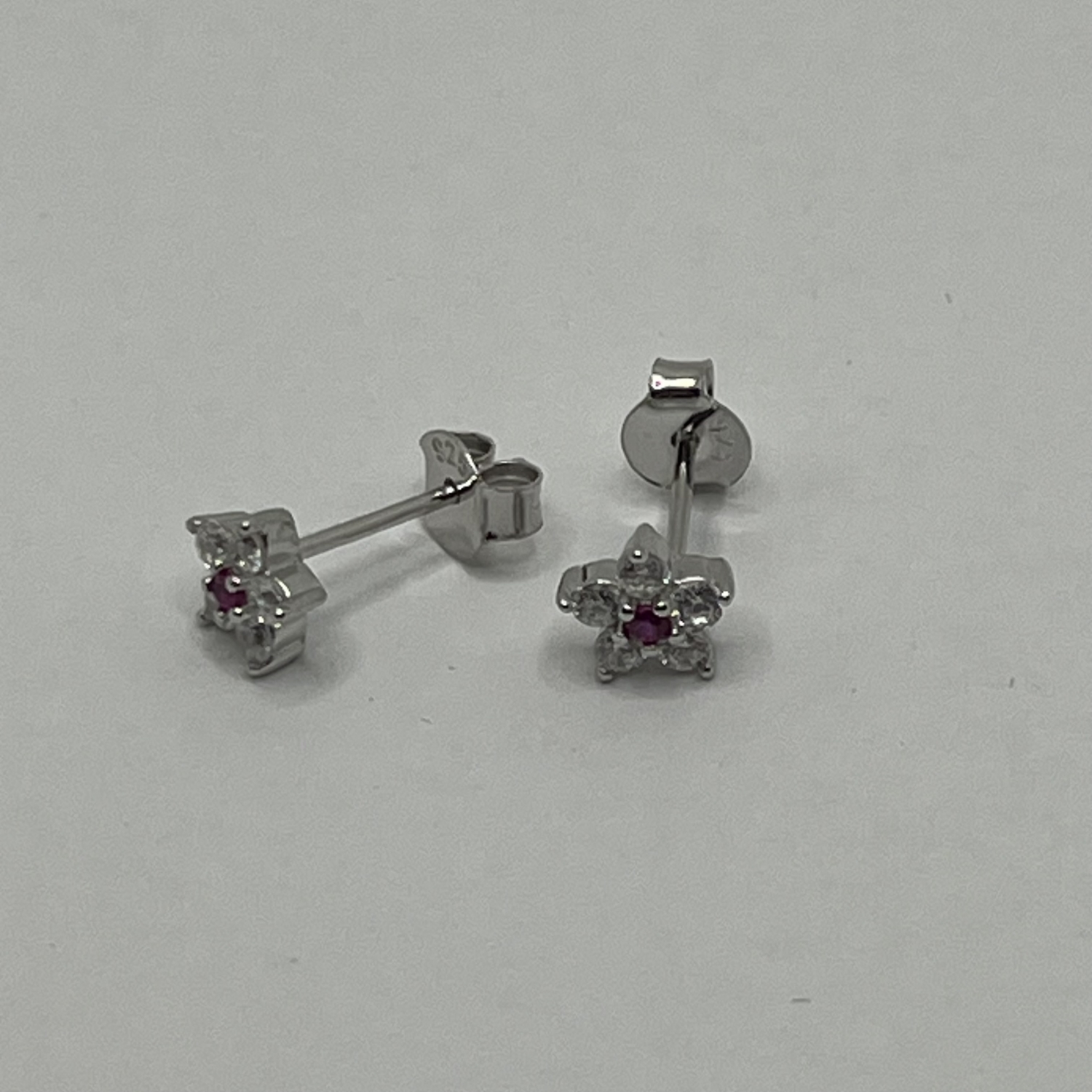 Kis virág alakú ezüst fülbevaló fehér-pink színű cirkónia kövekkel,ródiumozott felülettel.A kövek foglaltak,nem ragasztottak.
