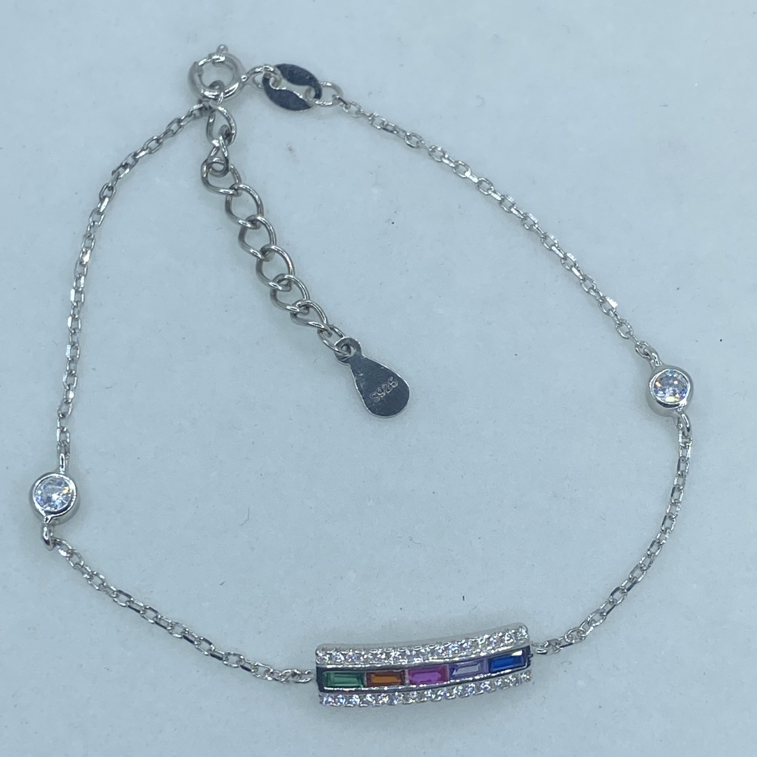 Tömör szemes,vékony,de erős karlánc színes kövekkel kirakott díszítéssel.Ródiumozott felülettel.Hossza 17 cm-től 20 cm-ig állítható.Köves,téglalap dísz mérete:17*4,8 mm,kerek dísz:3,9 mm átmérőjű